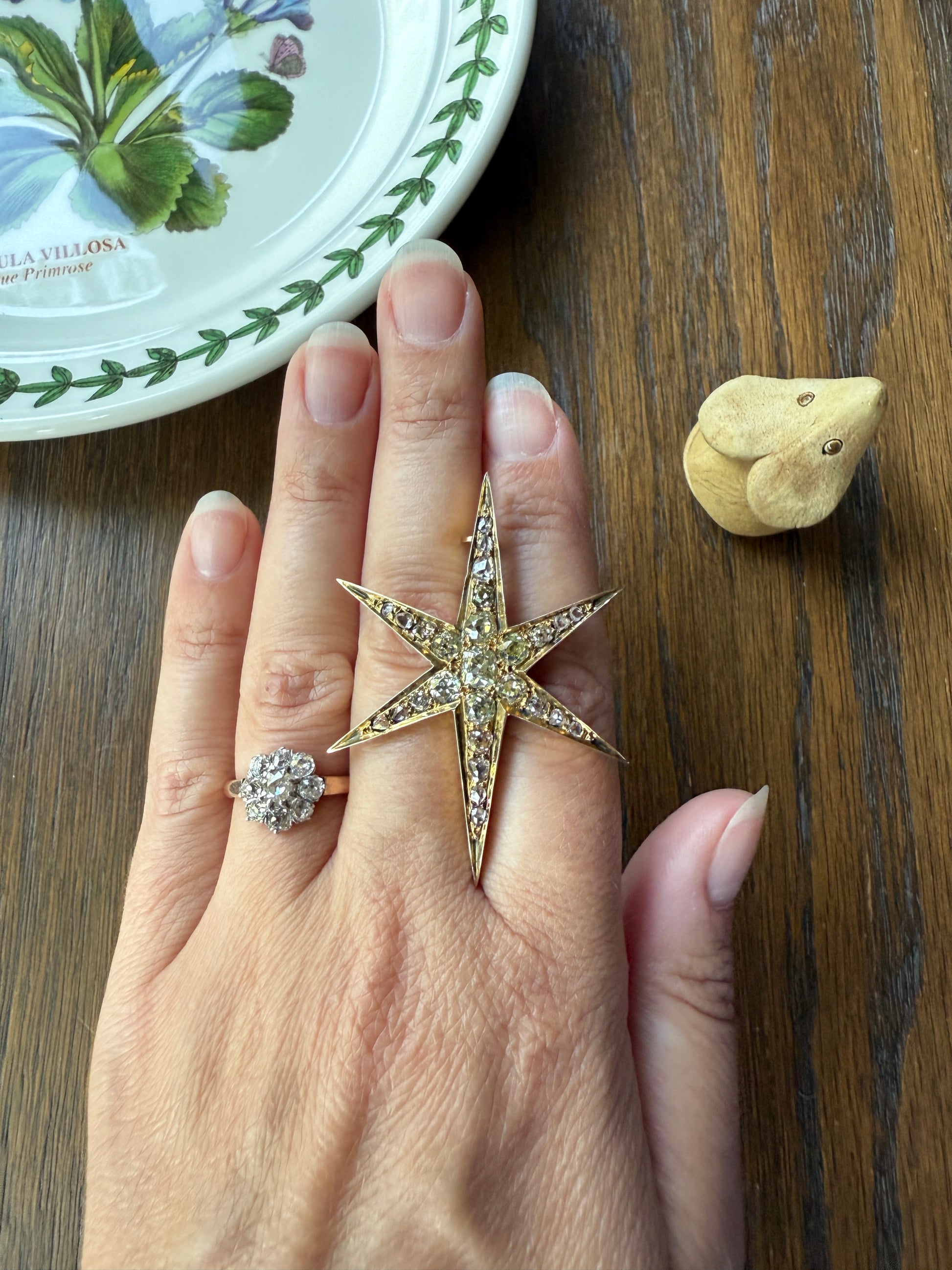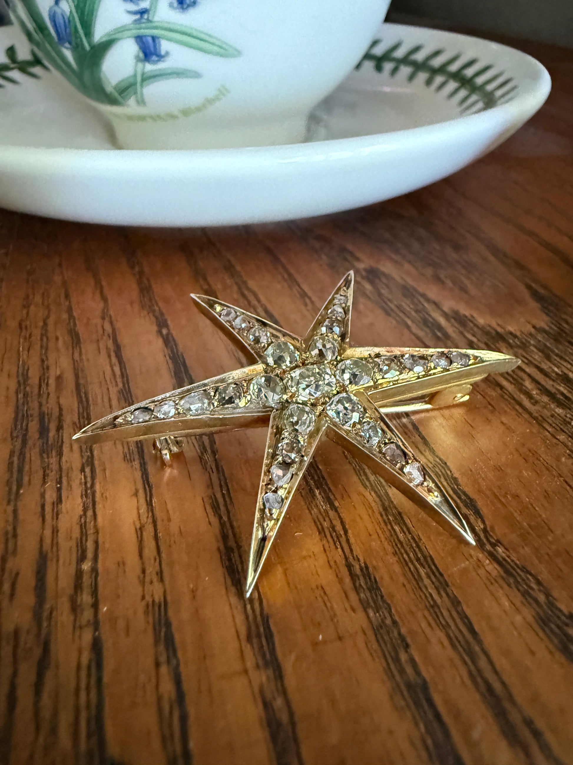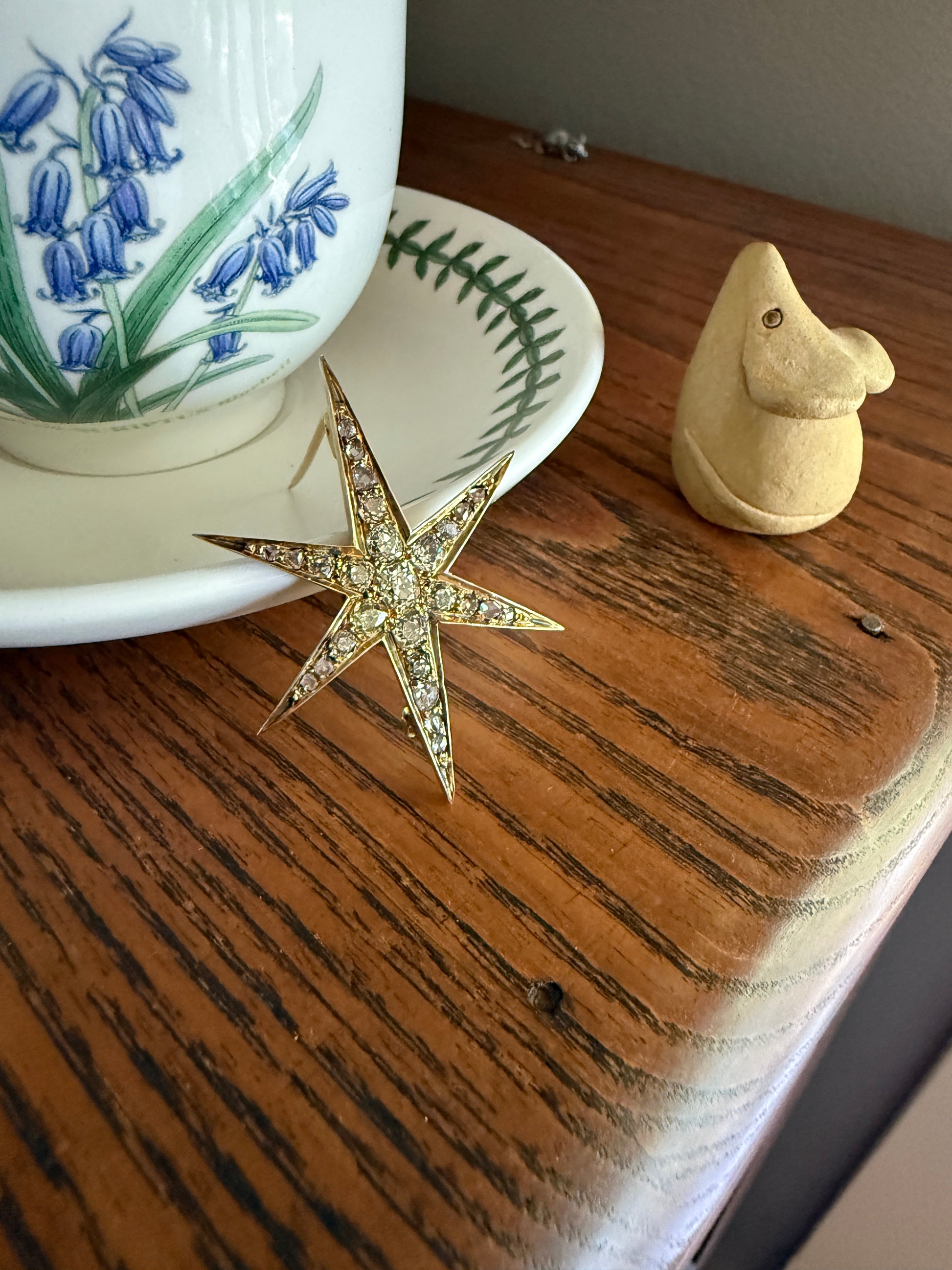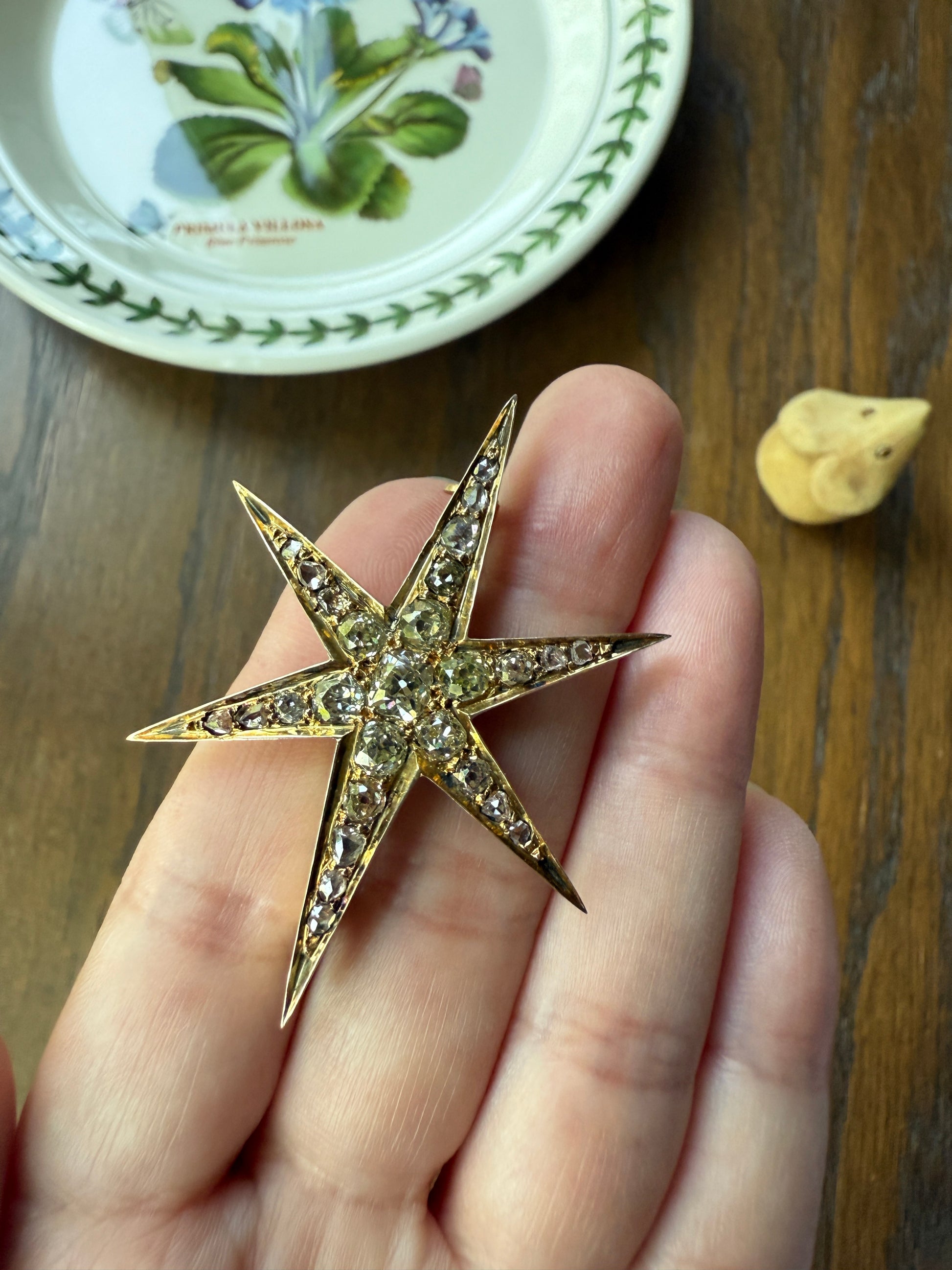 One of my best stars ever! I love this one for the gorgeous hues to the old cut diamonds. A few of the old mine cuts are pale yellow in color. And some of the old mine and rose cuts have a blush pink hue, I assume from organic age to the closed back setting. A beauty to view from side to see the high crowns of the chunky stones but wow I love the coloring.