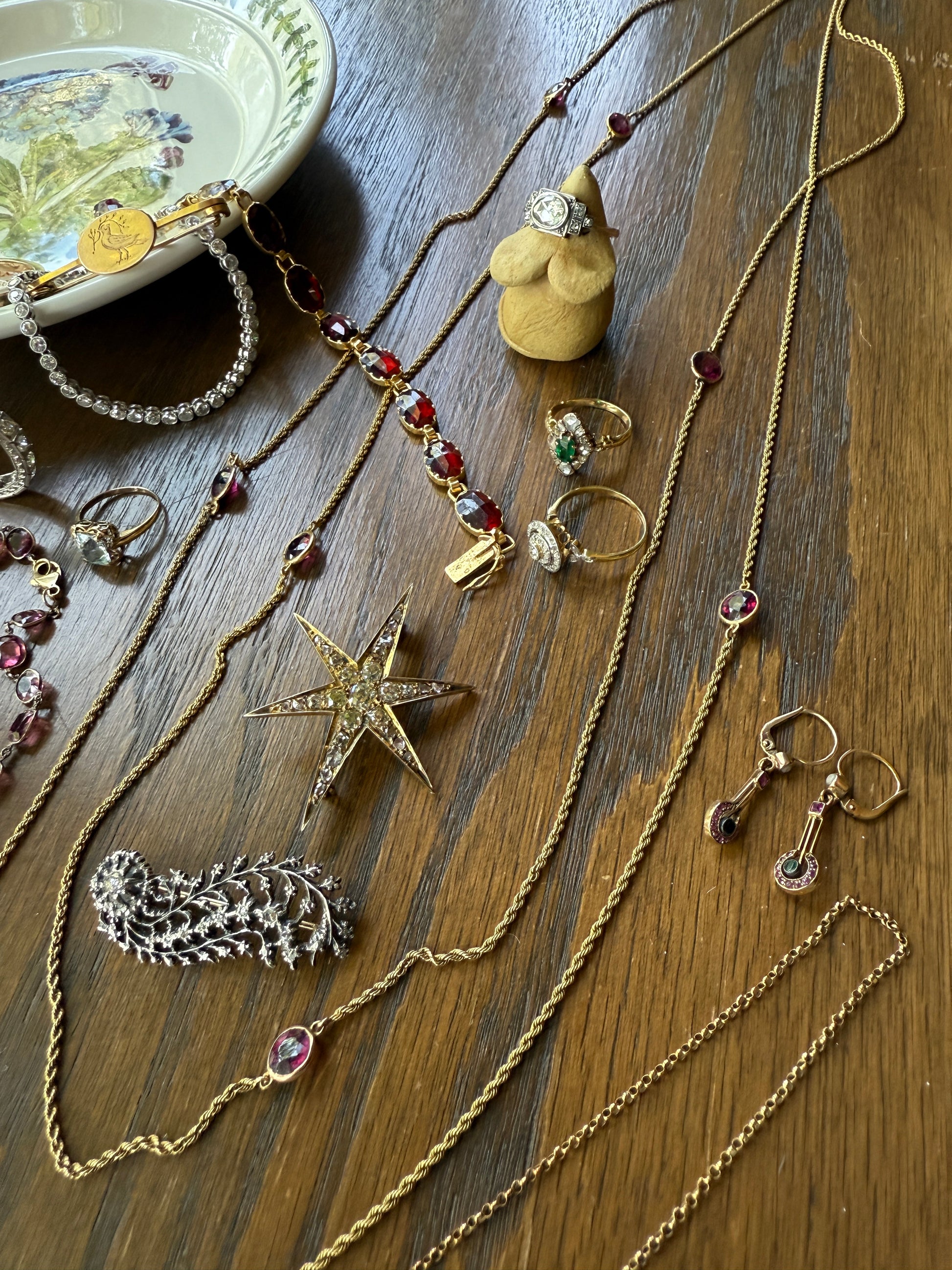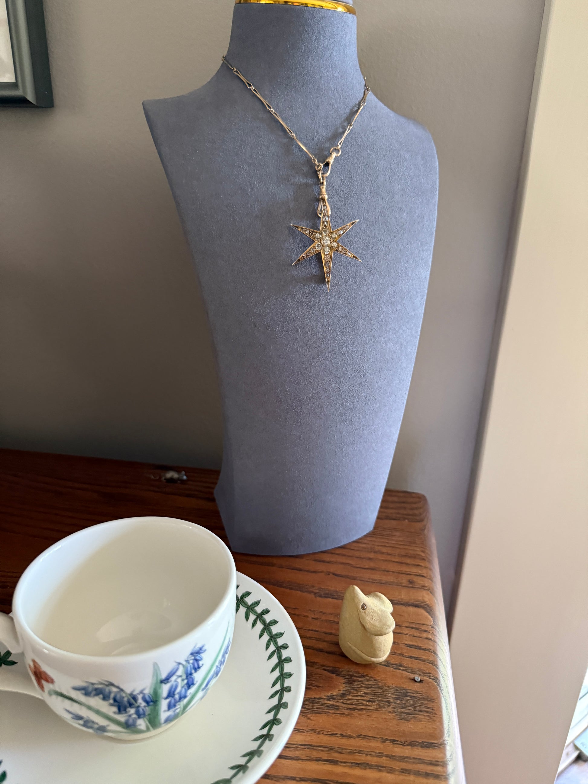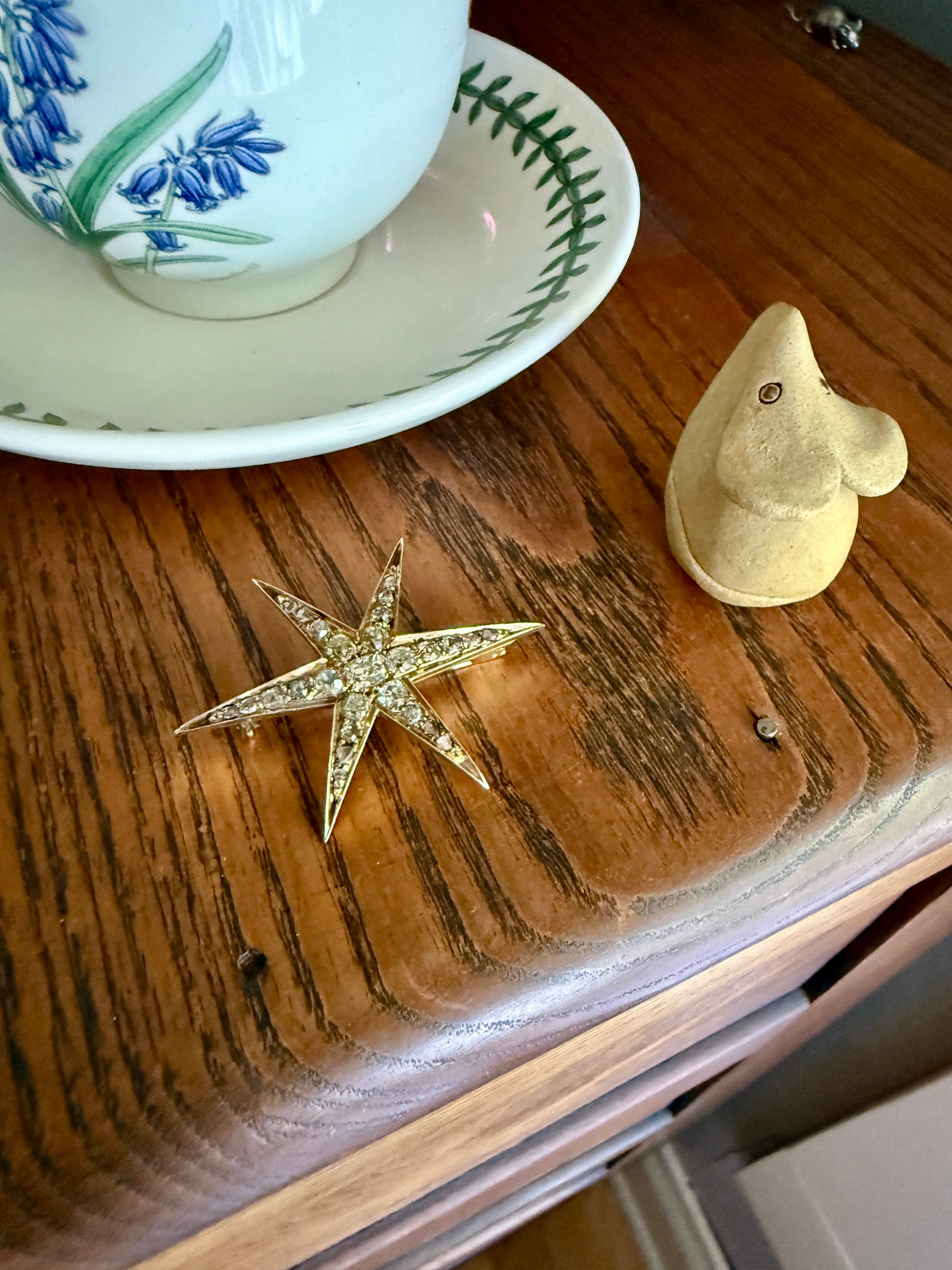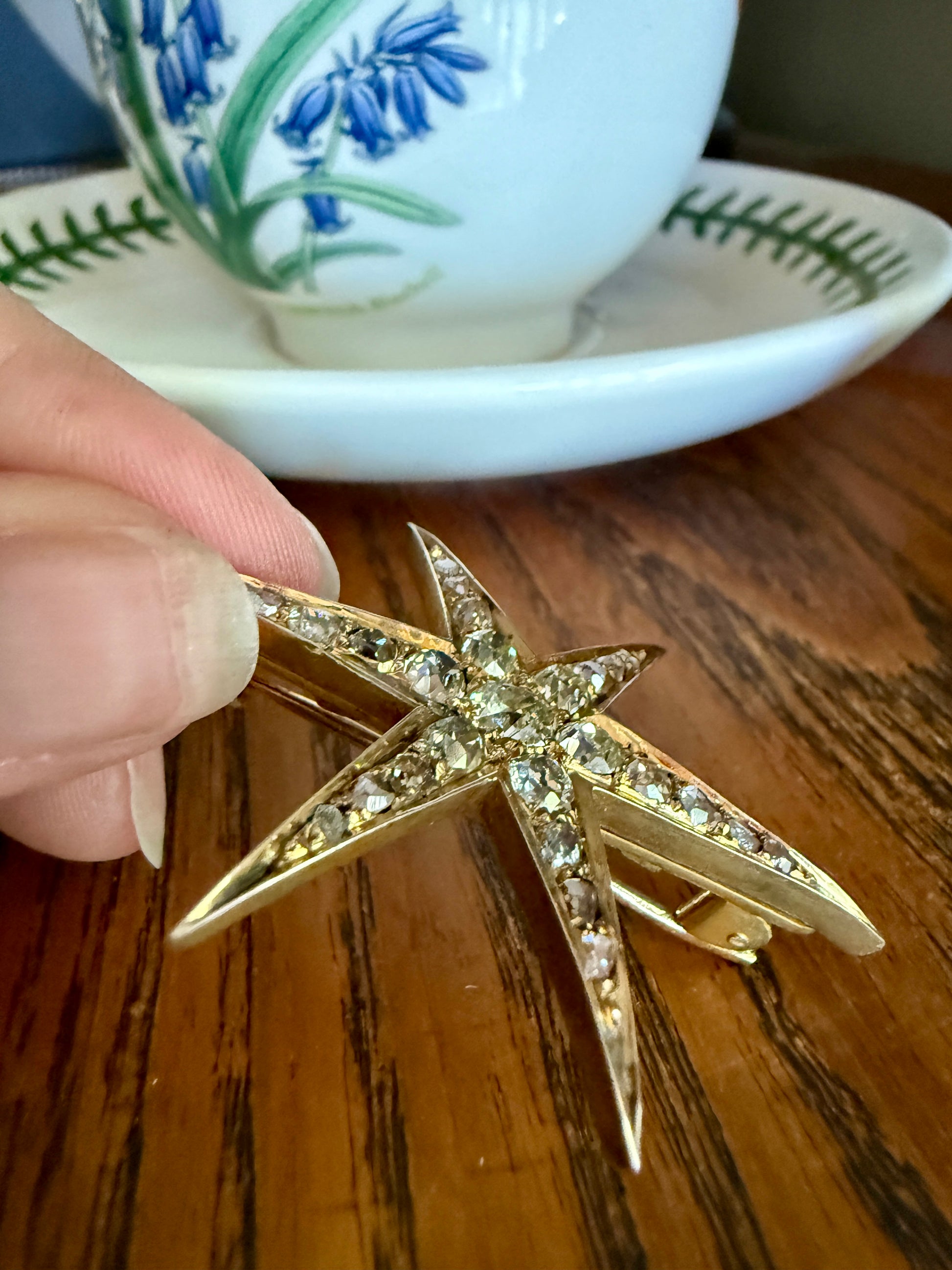 One of my best stars ever! I love this one for the gorgeous hues to the old cut diamonds. A few of the old mine cuts are pale yellow in color. And some of the old mine and rose cuts have a blush pink hue, I assume from organic age to the closed back setting. A beauty to view from side to see the high crowns of the chunky stones but wow I love the coloring.
