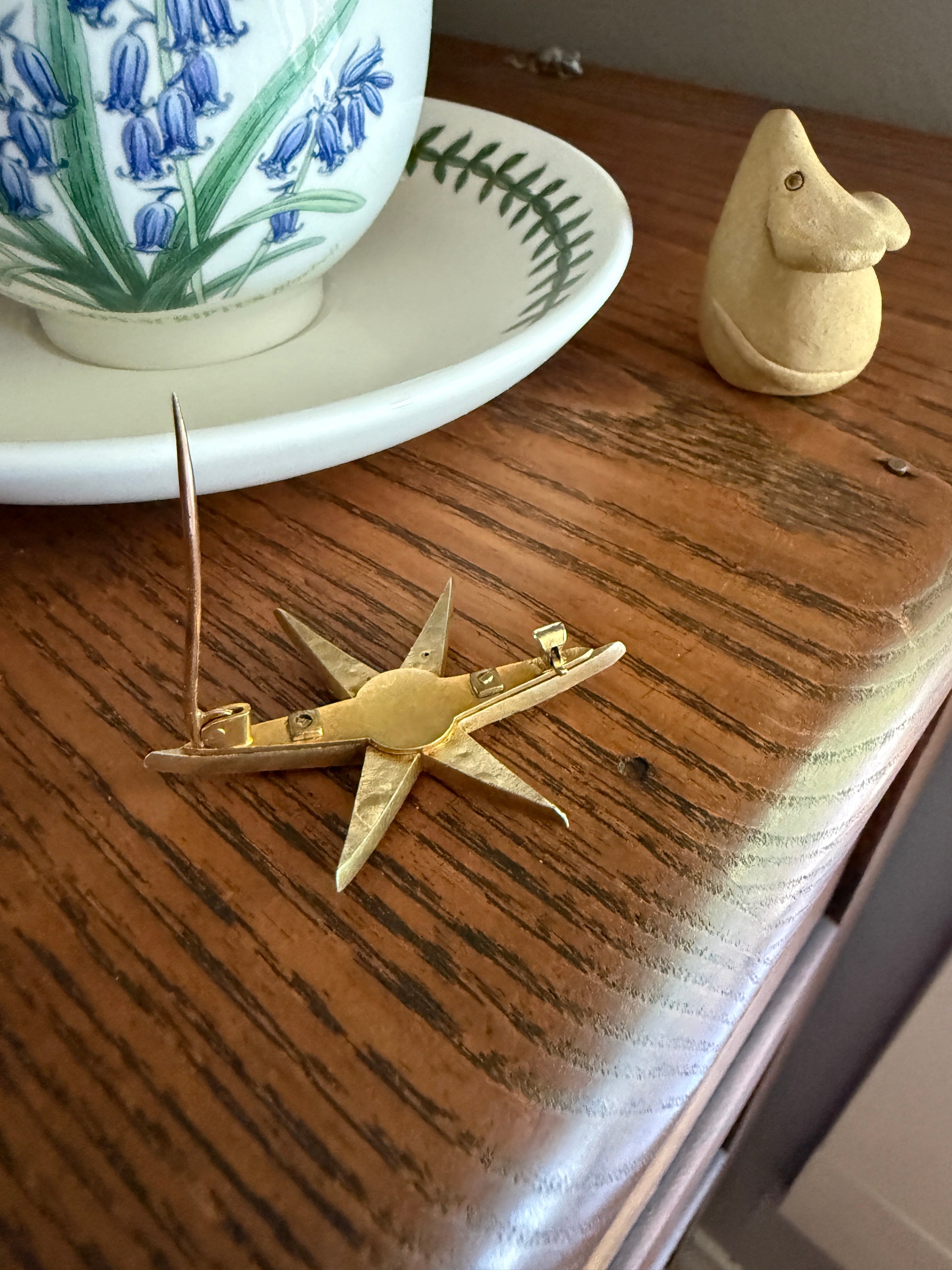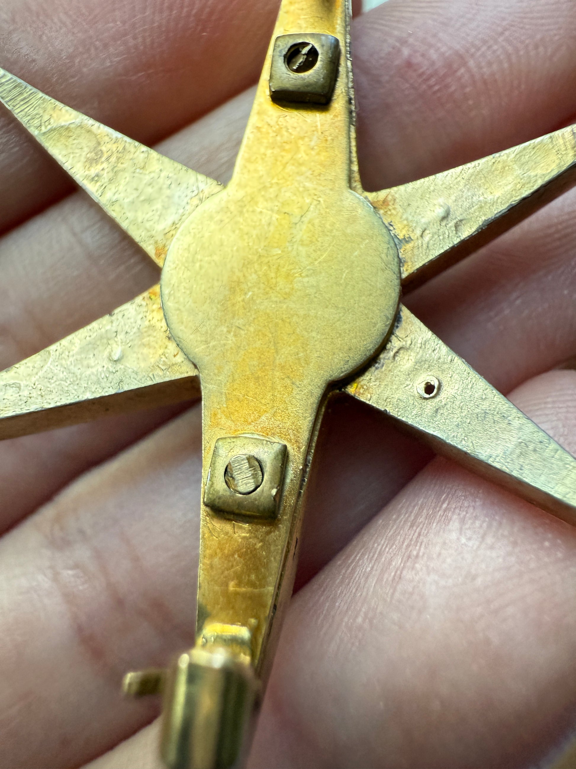 For your consideration - the points of the star are sharp. This is not a condition issue, it is how it was made but I thought I'd mention it. It has a slight bow to it, also how it was made, but if the pin parts were to all be removed, the points of the star would rest against the decollette. It isn't really felt while resting on the skin but if pressed or rubbed against the skin, you would feel the sharp points.