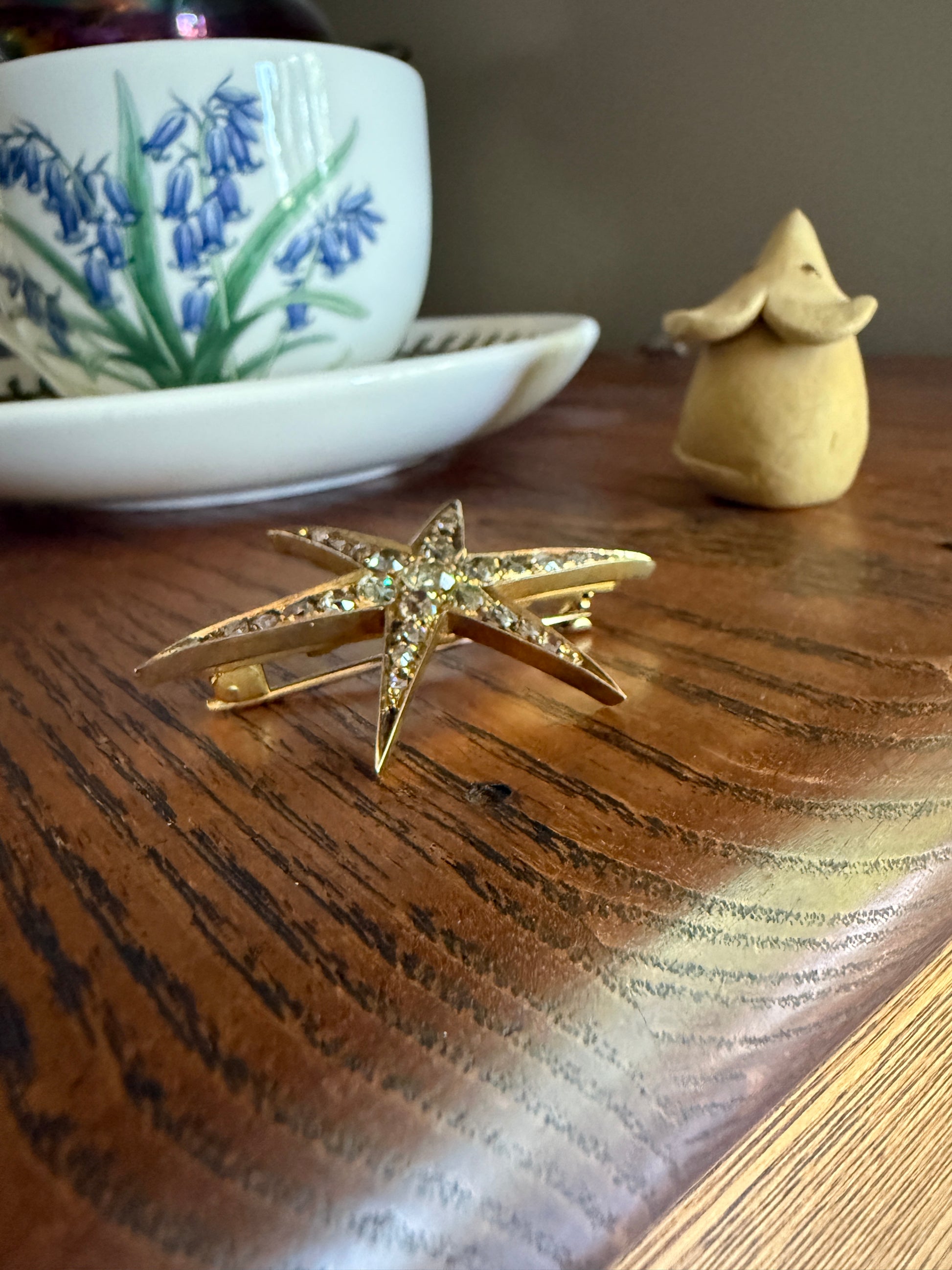 As mentioned some wear to the gilt finish and some spots of darker patina in the recesses of the face of the star. The piece has a gorgeous glow. Typical antique diamonds, some are eye clean, others with faint frosty inclusions. I don't see any dark carbon and I don't see any chips. Typical smaller antique rose cuts with rough edges, non uniform shapes, more frosty spots and unpolished edges. Varying hues to the antique diamonds as mentioned, some white to warm white, some pale yellow, some reading champagne or with a blush hue.