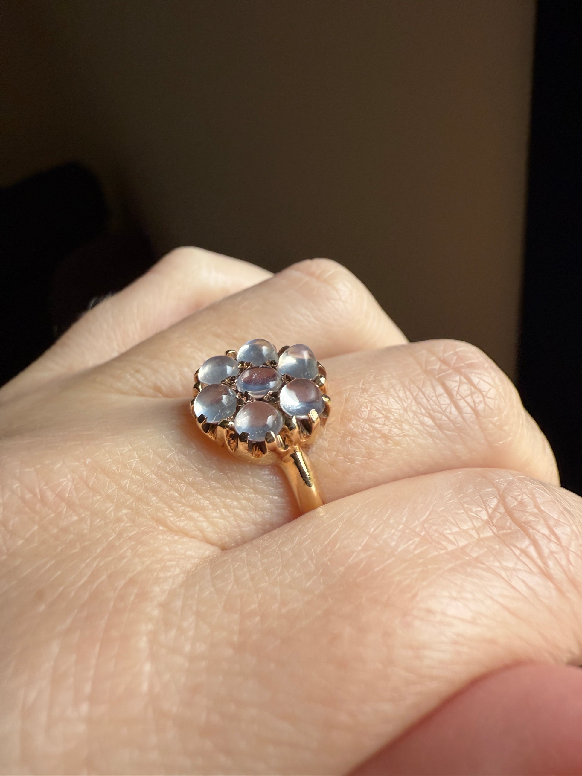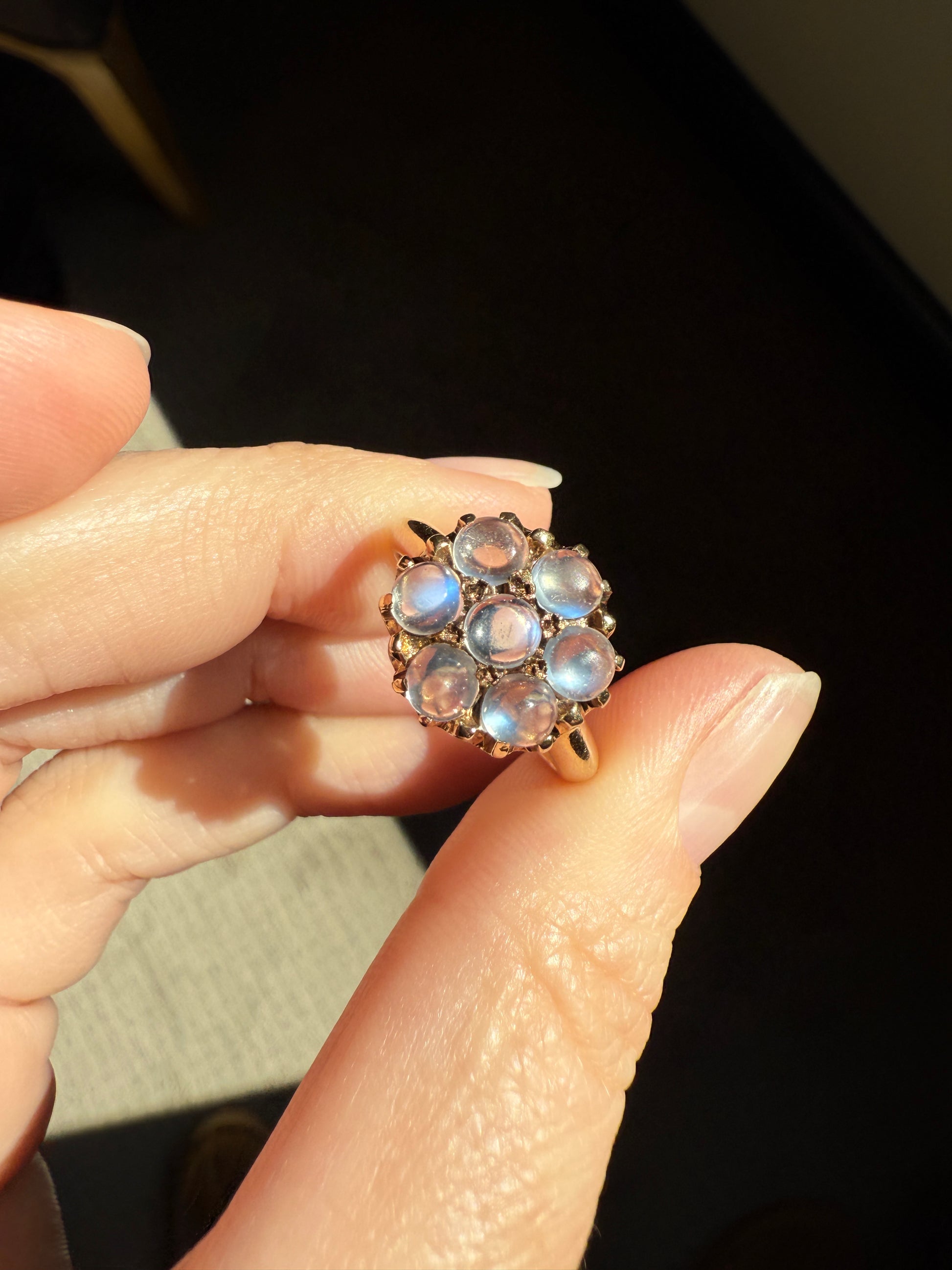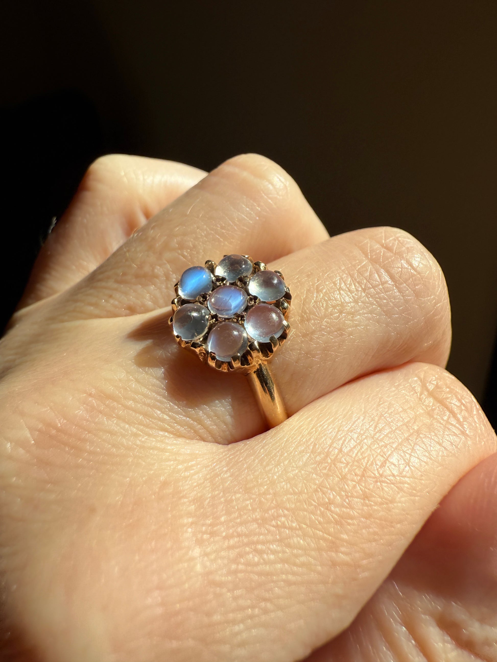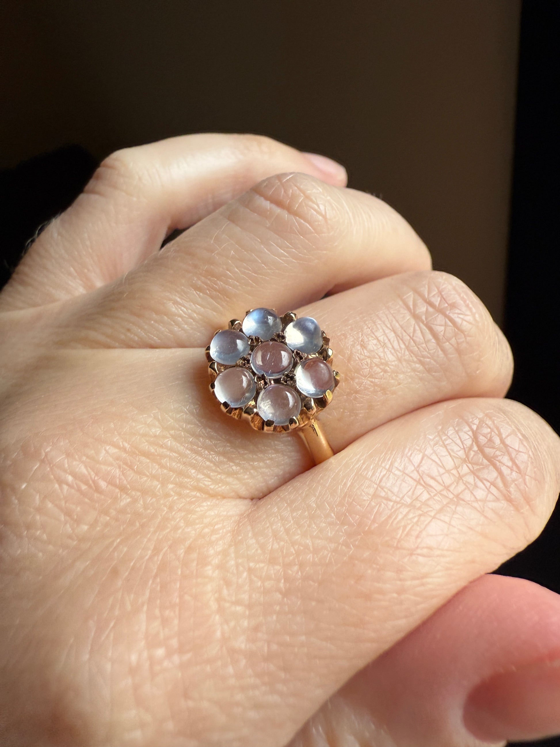 MOONSTONE Daisy Cluster Halo Ring Vintage to Art Deco Antique 14k Gold Seven Stone Blue Flash Chunky Glowing Orbs