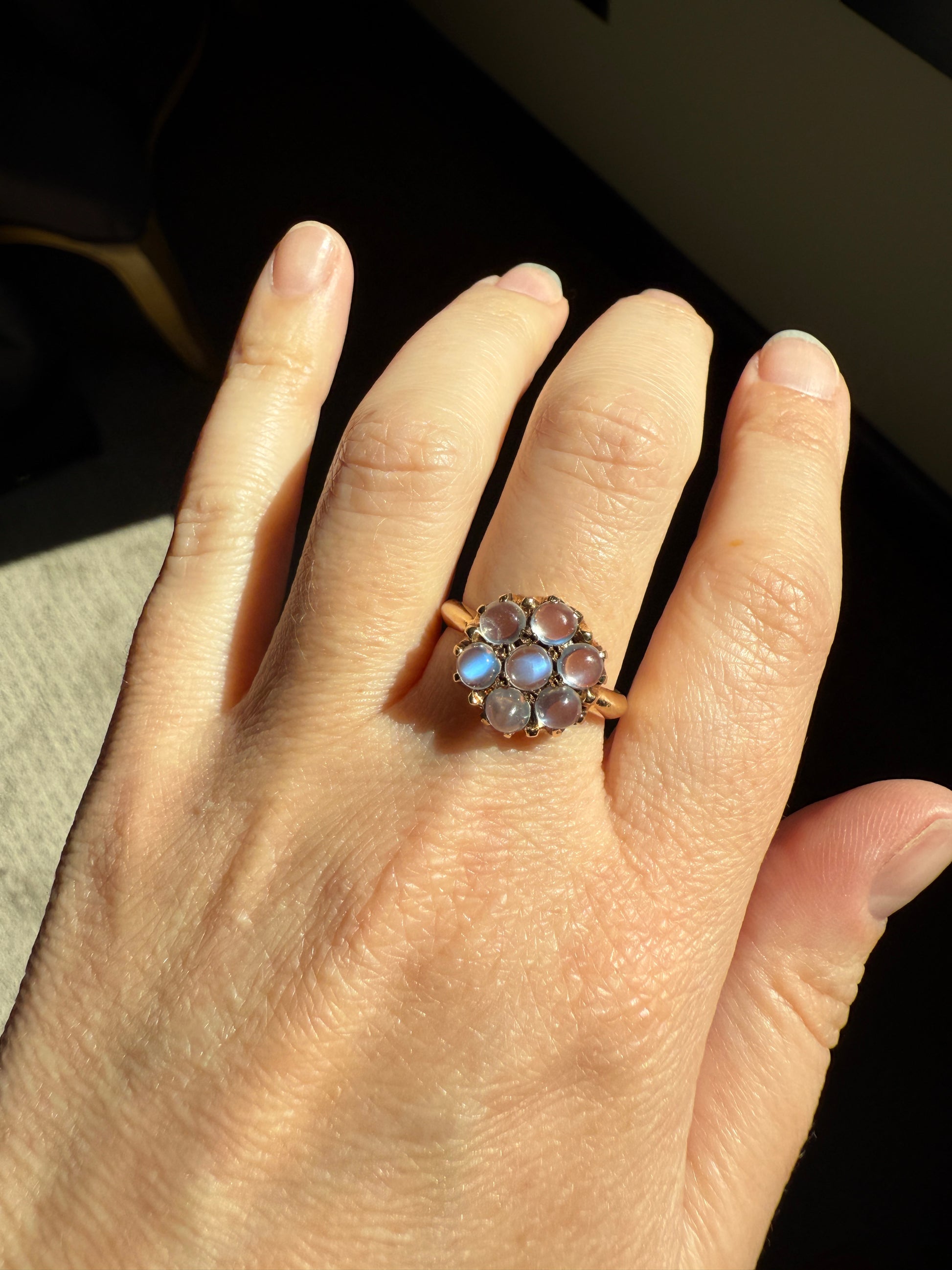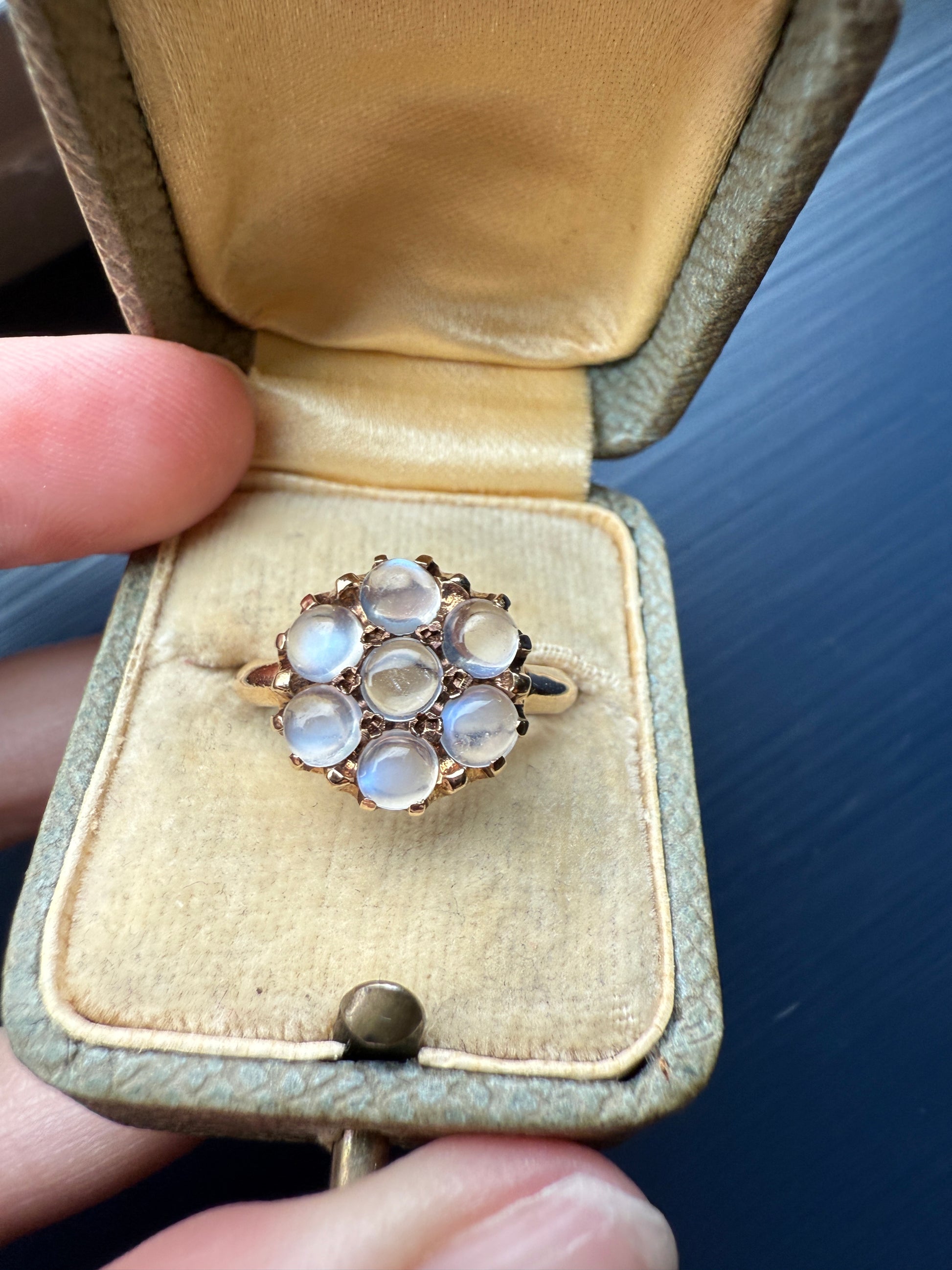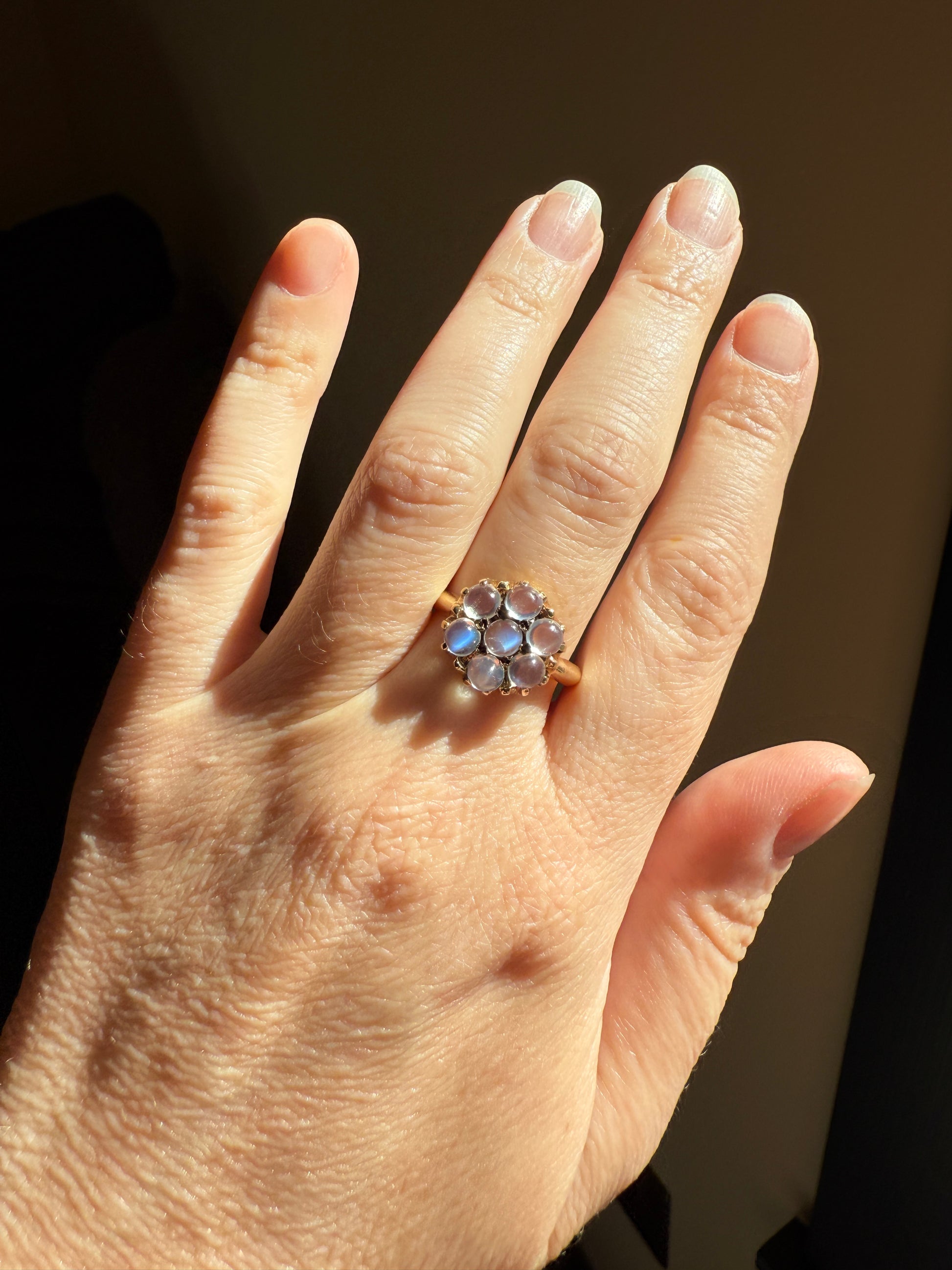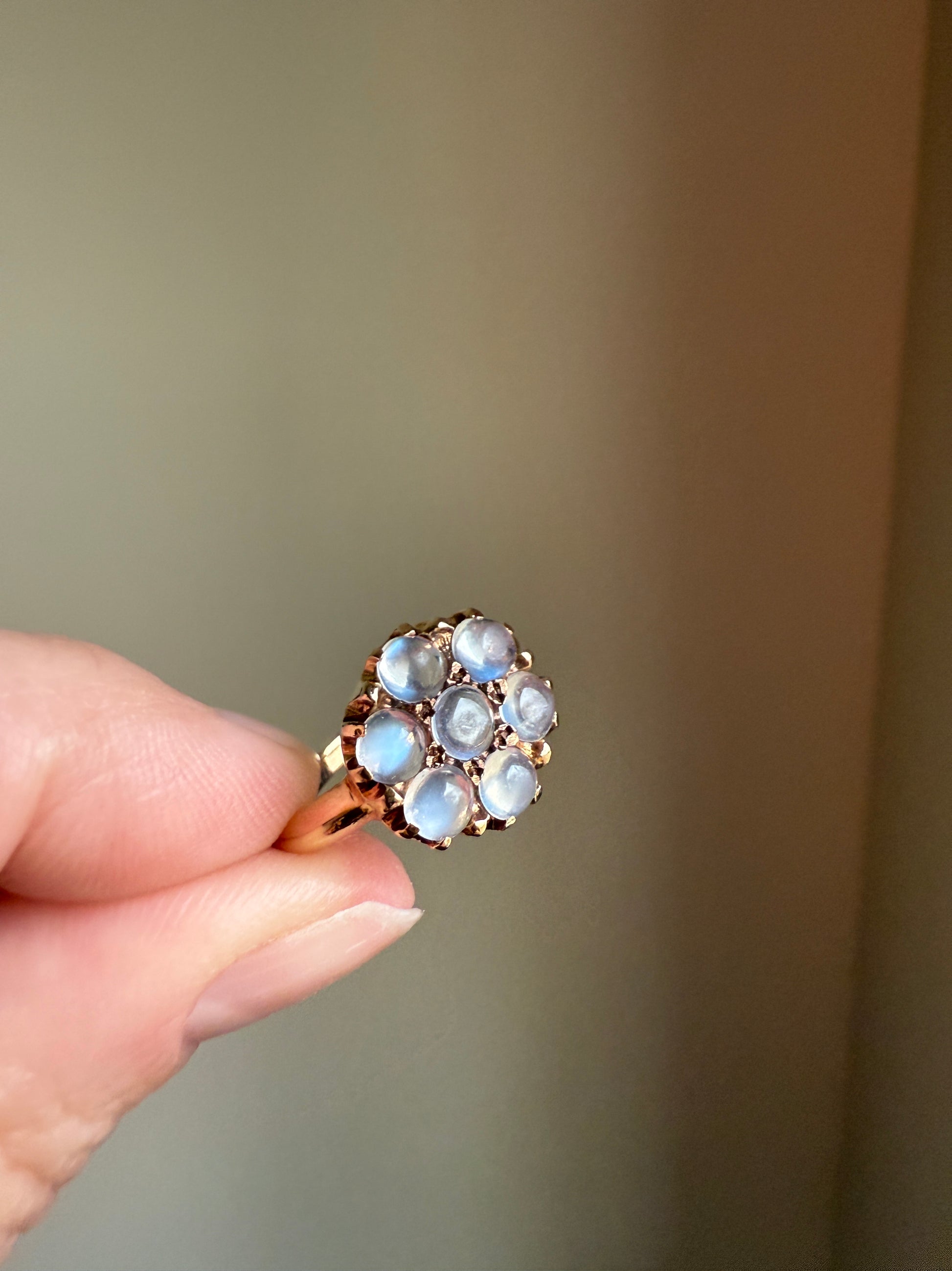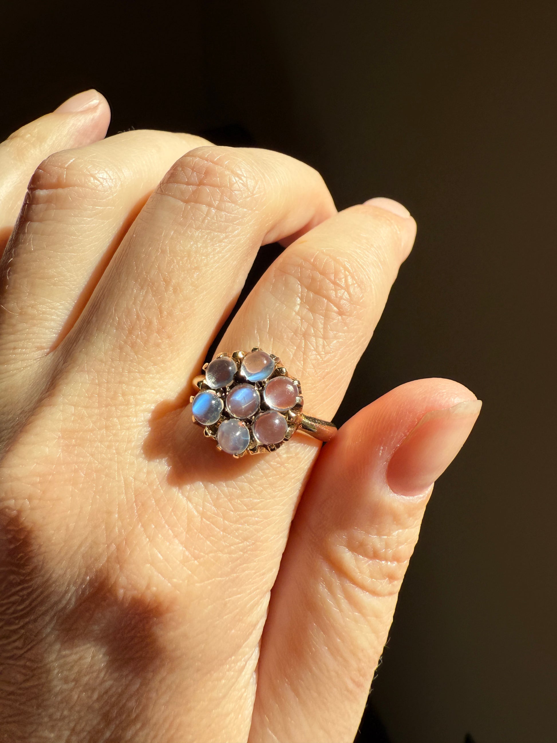 MOONSTONE Daisy Cluster Halo Ring Vintage to Art Deco Antique 14k Gold Seven Stone Blue Flash Chunky Glowing Orbs