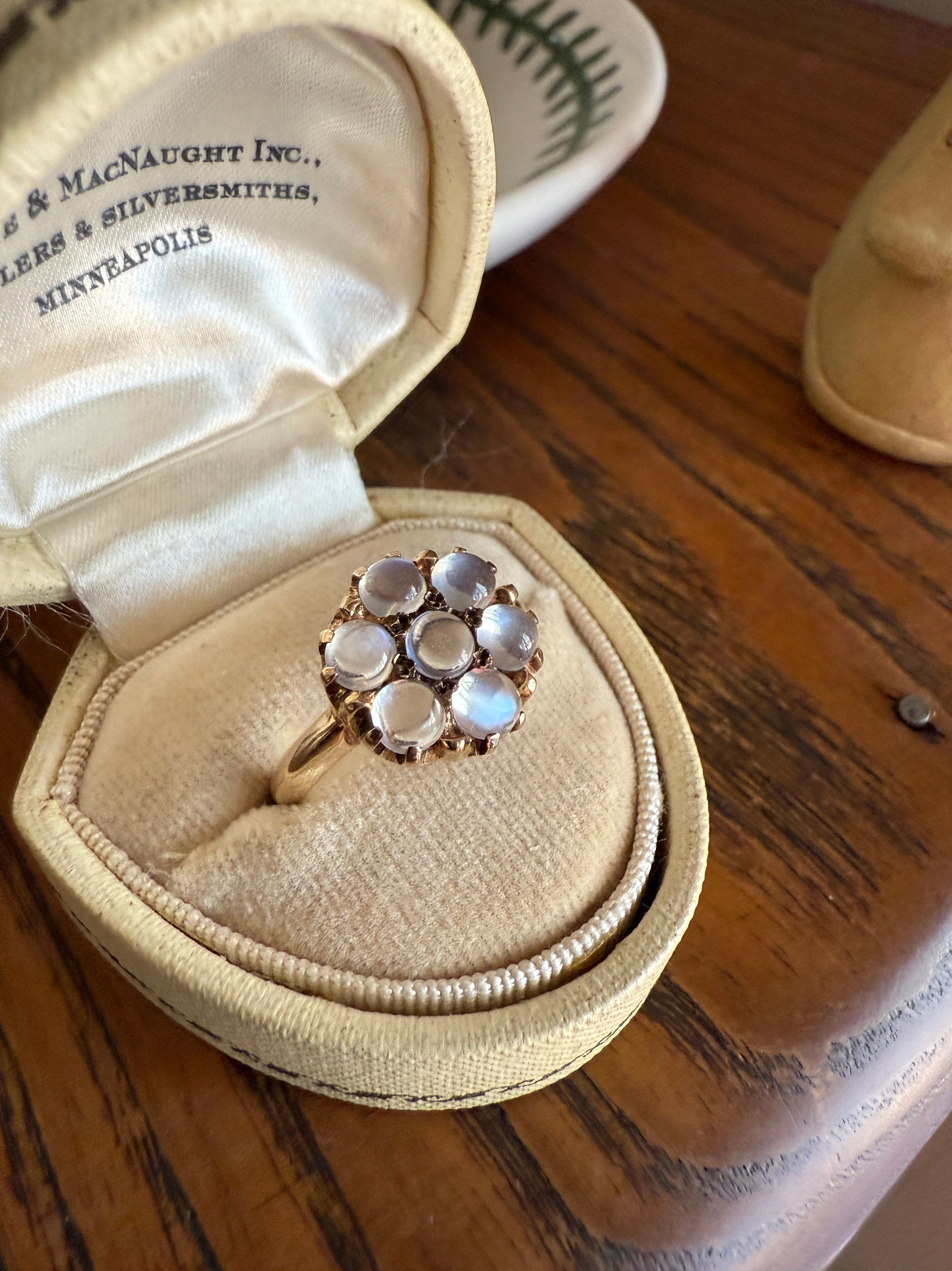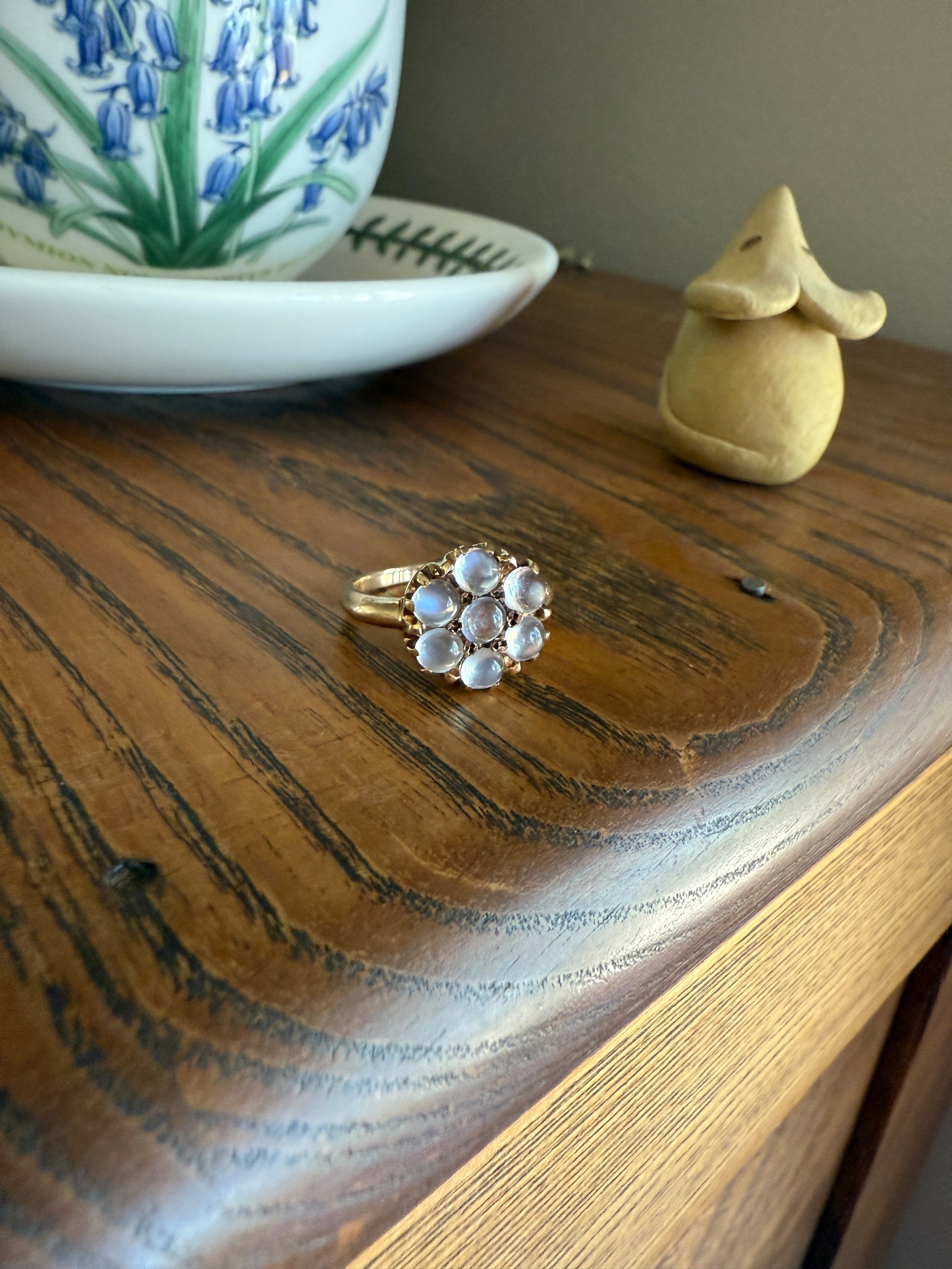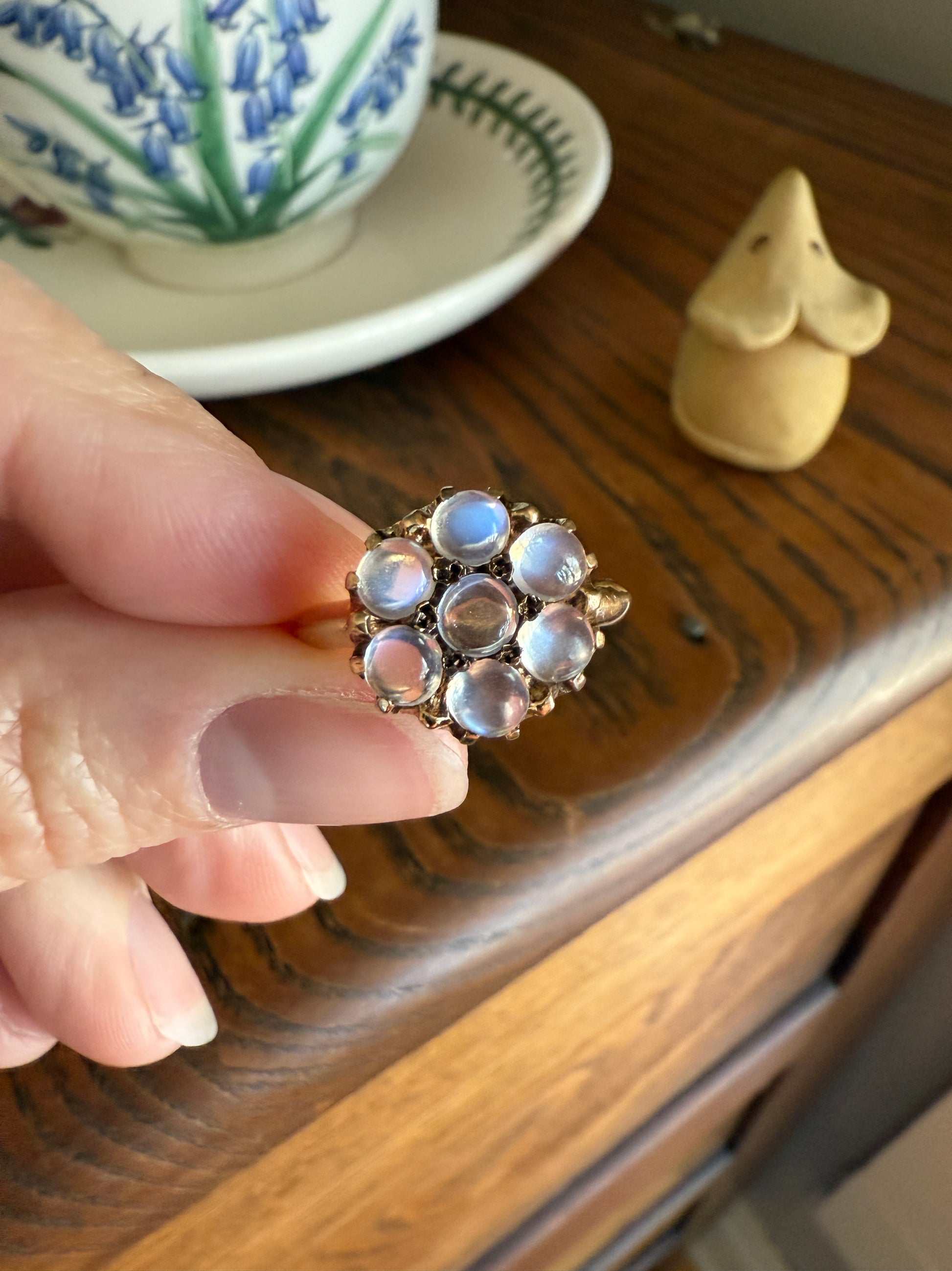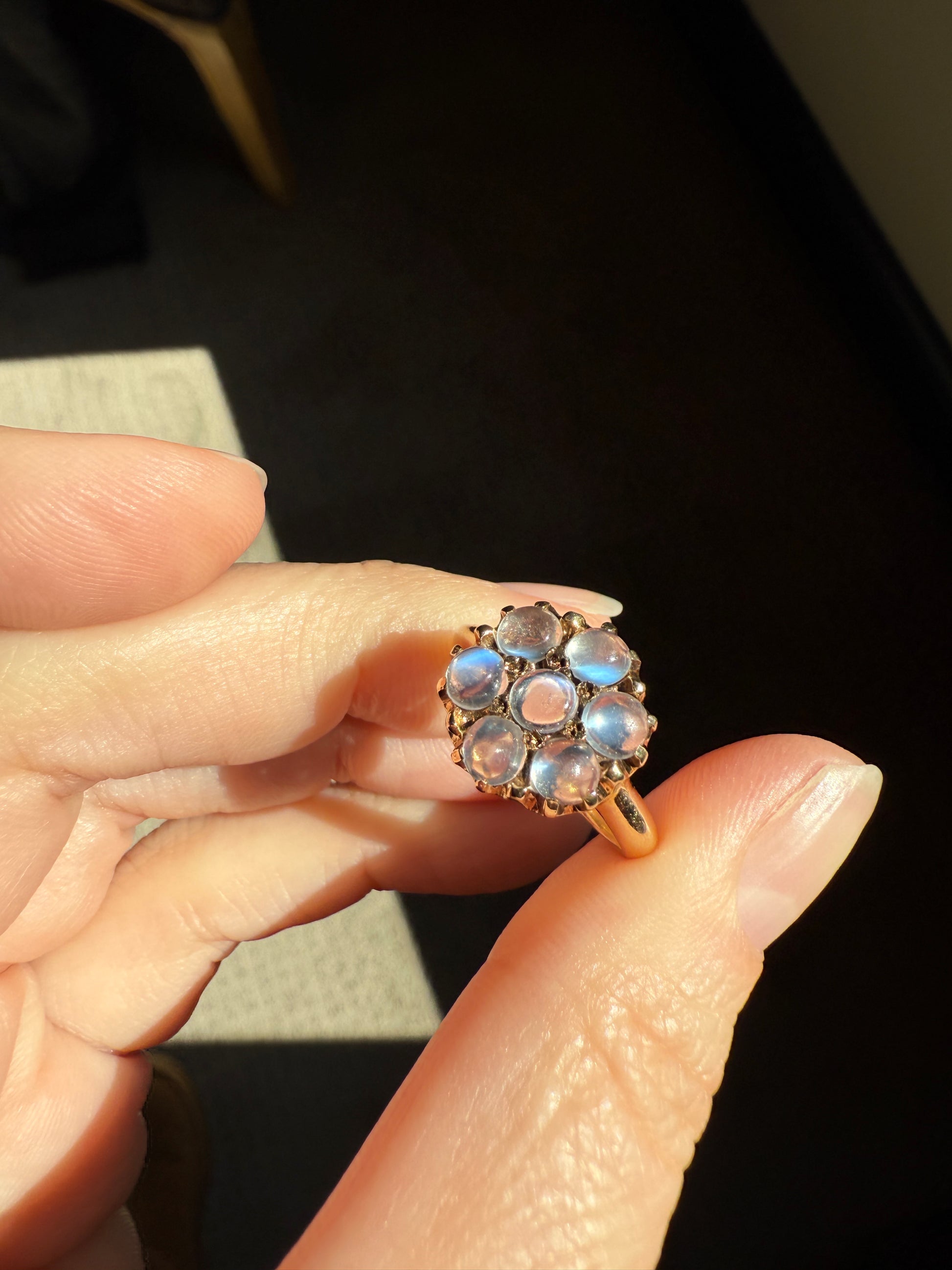 MOONSTONE Daisy Cluster Halo Ring Vintage to Art Deco Antique 14k Gold Seven Stone Blue Flash Chunky Glowing Orbs