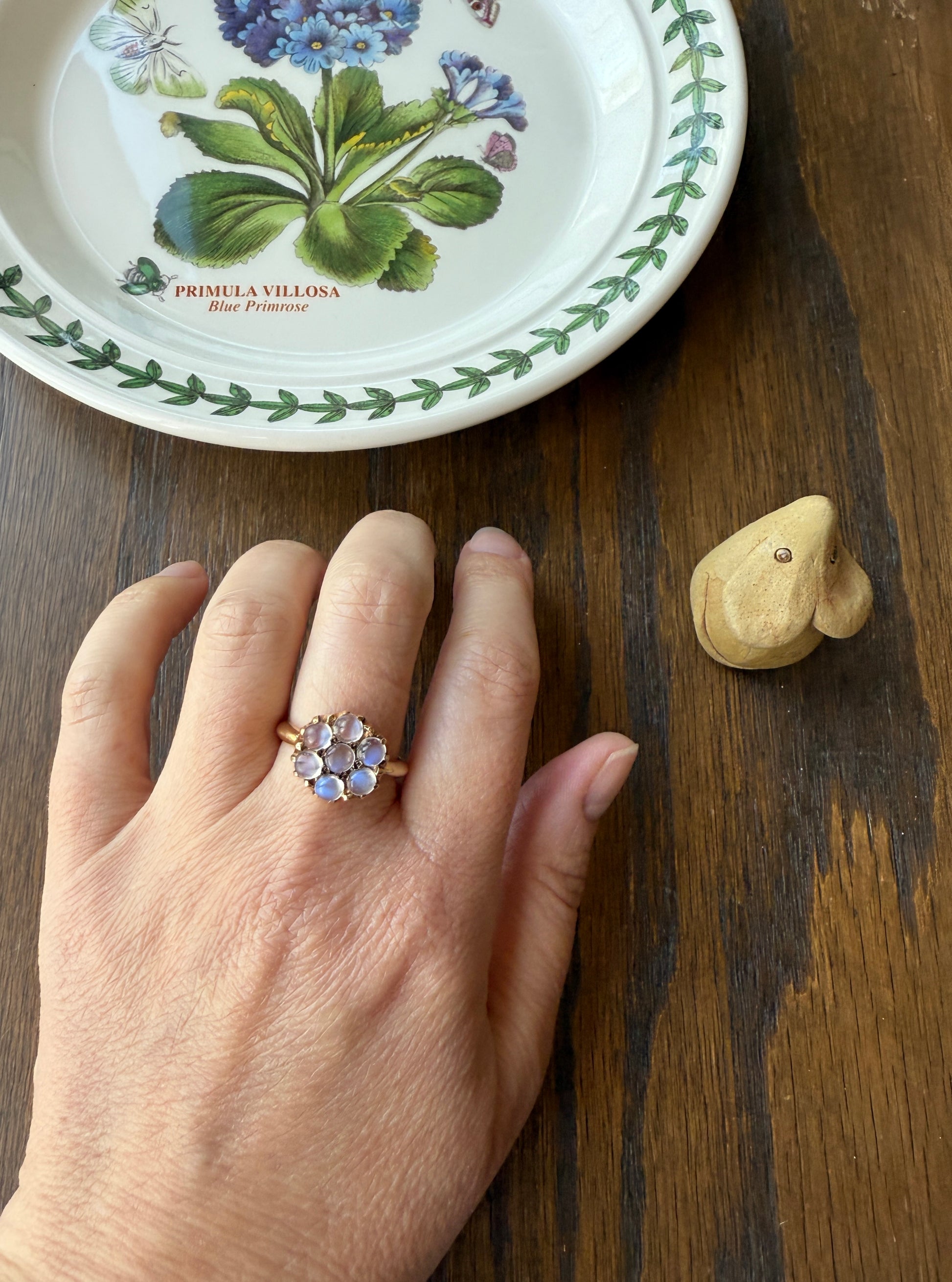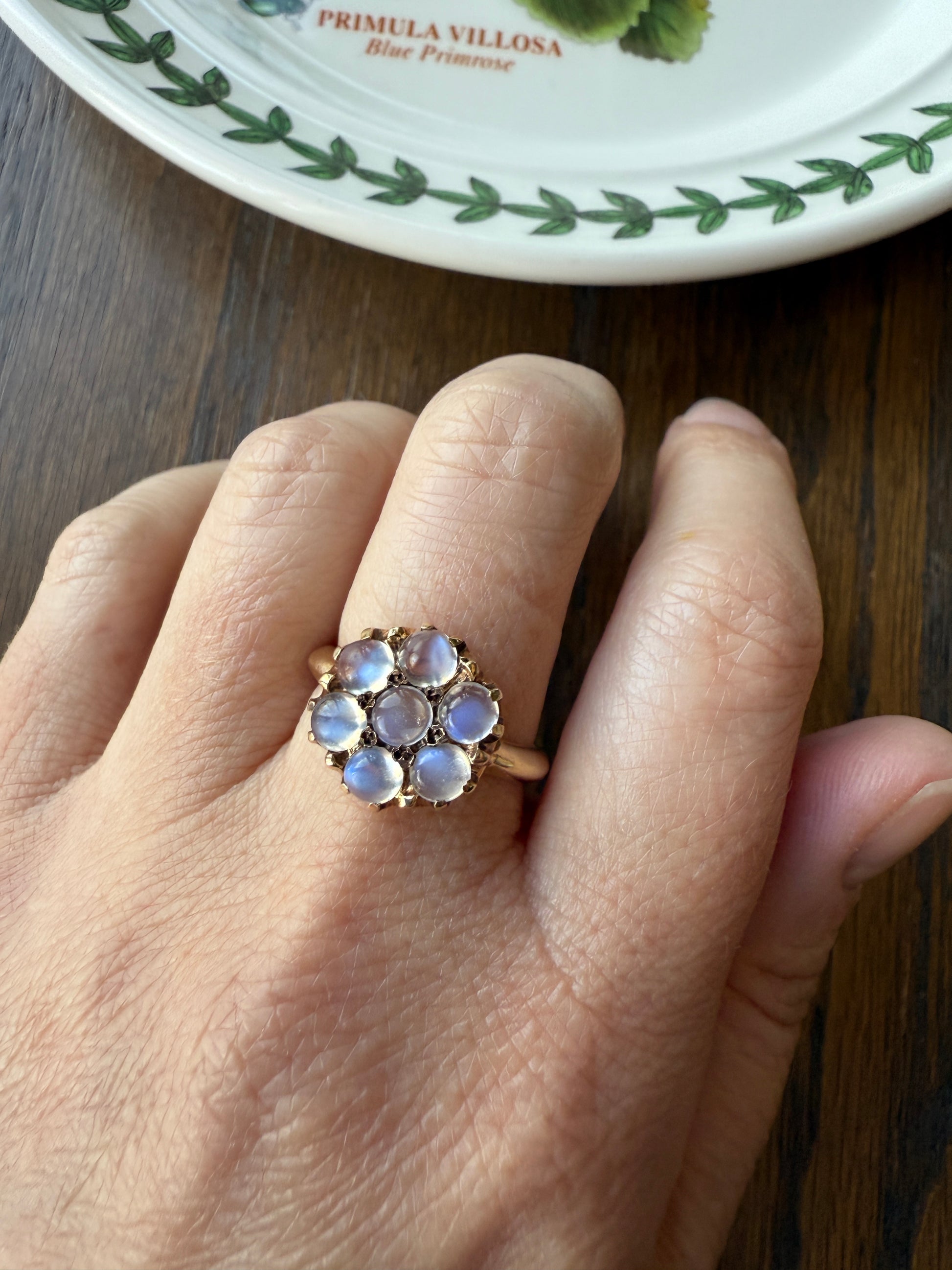 In a classic and comfortable 14k gold setting, the large ring face holding the seven moonstones gracefully curves around the finger.