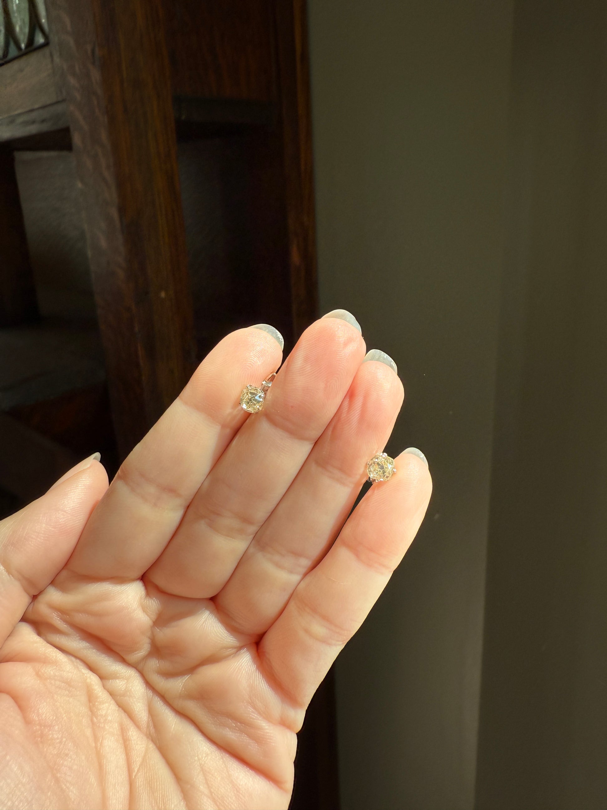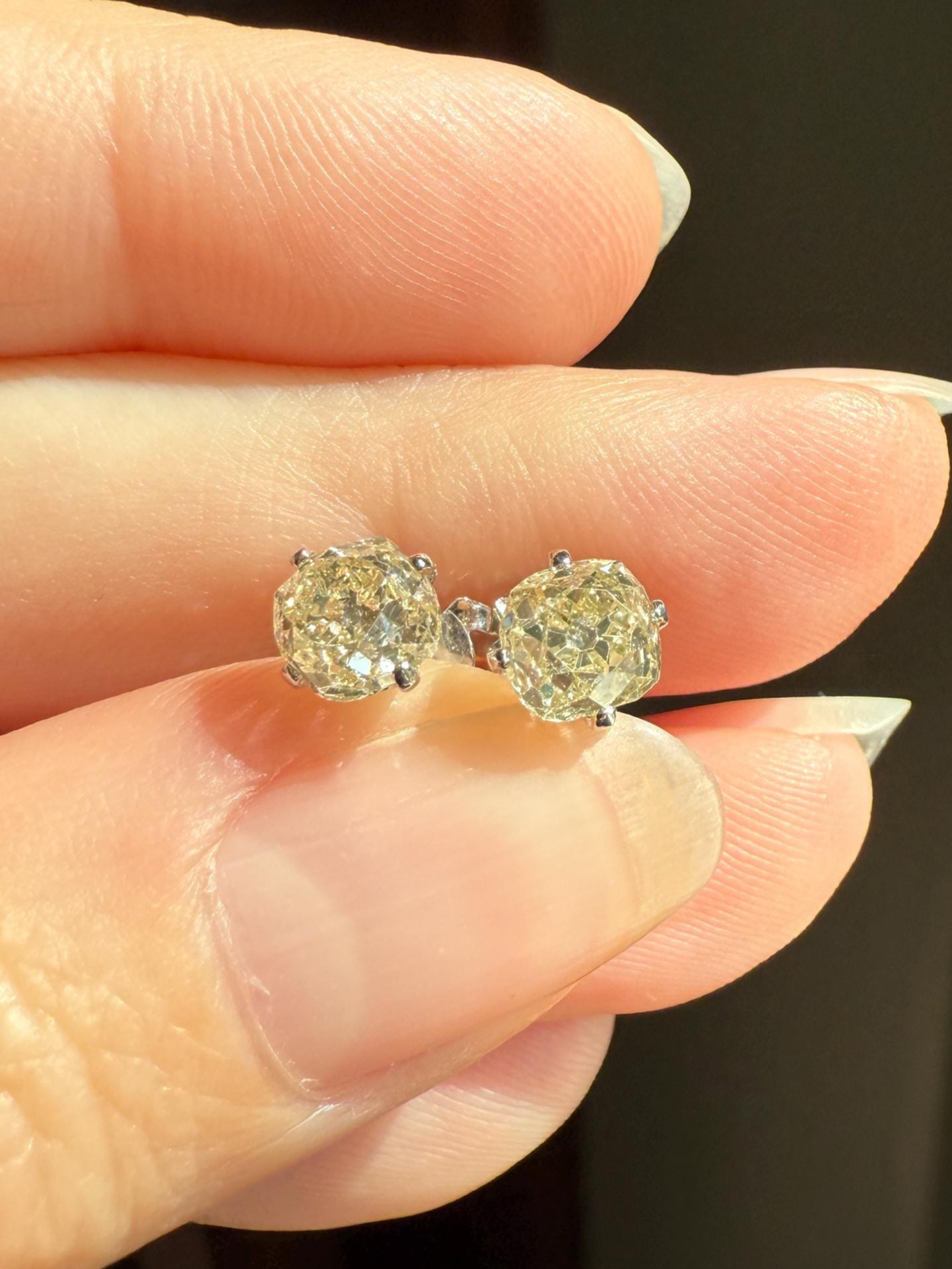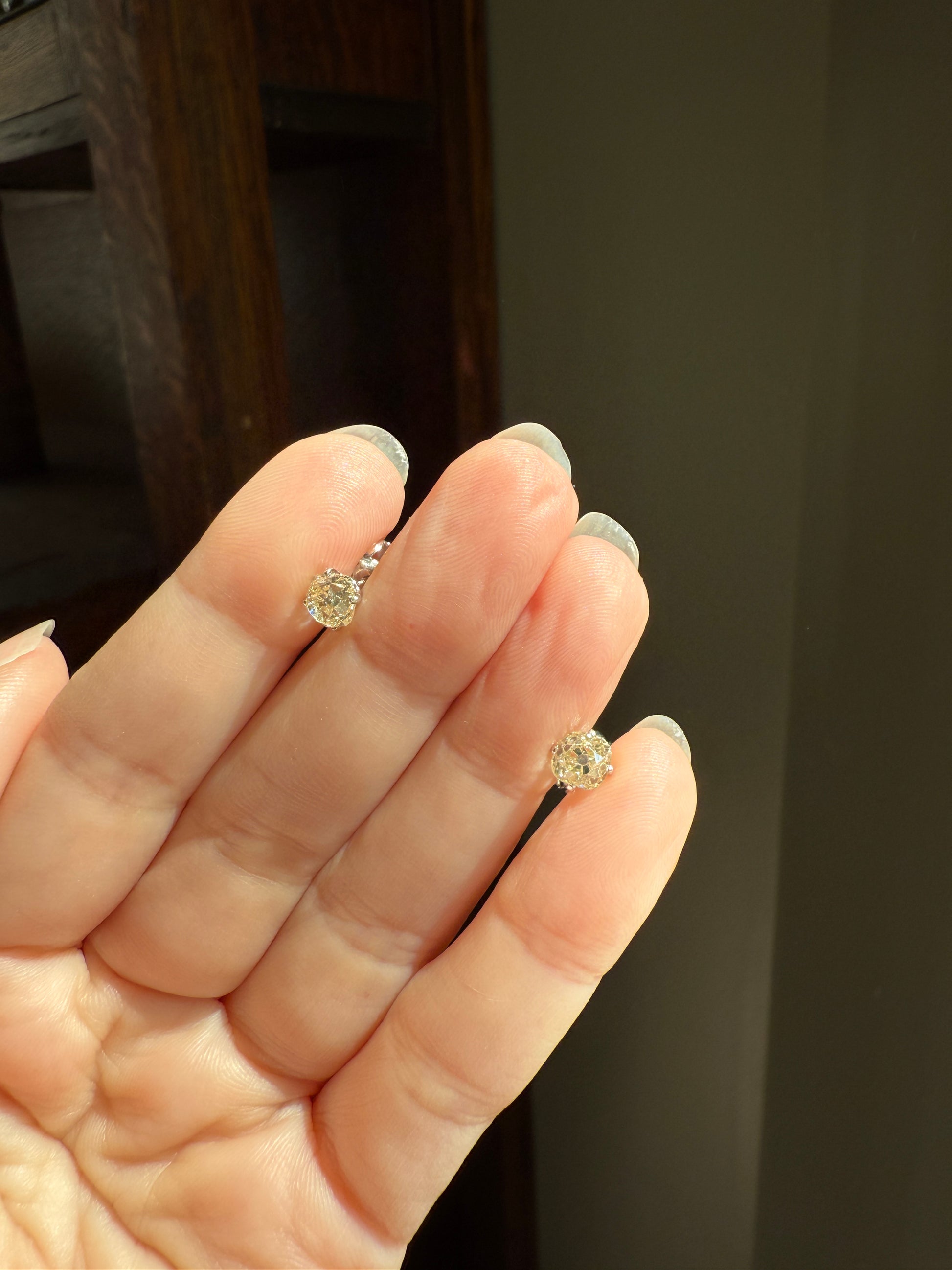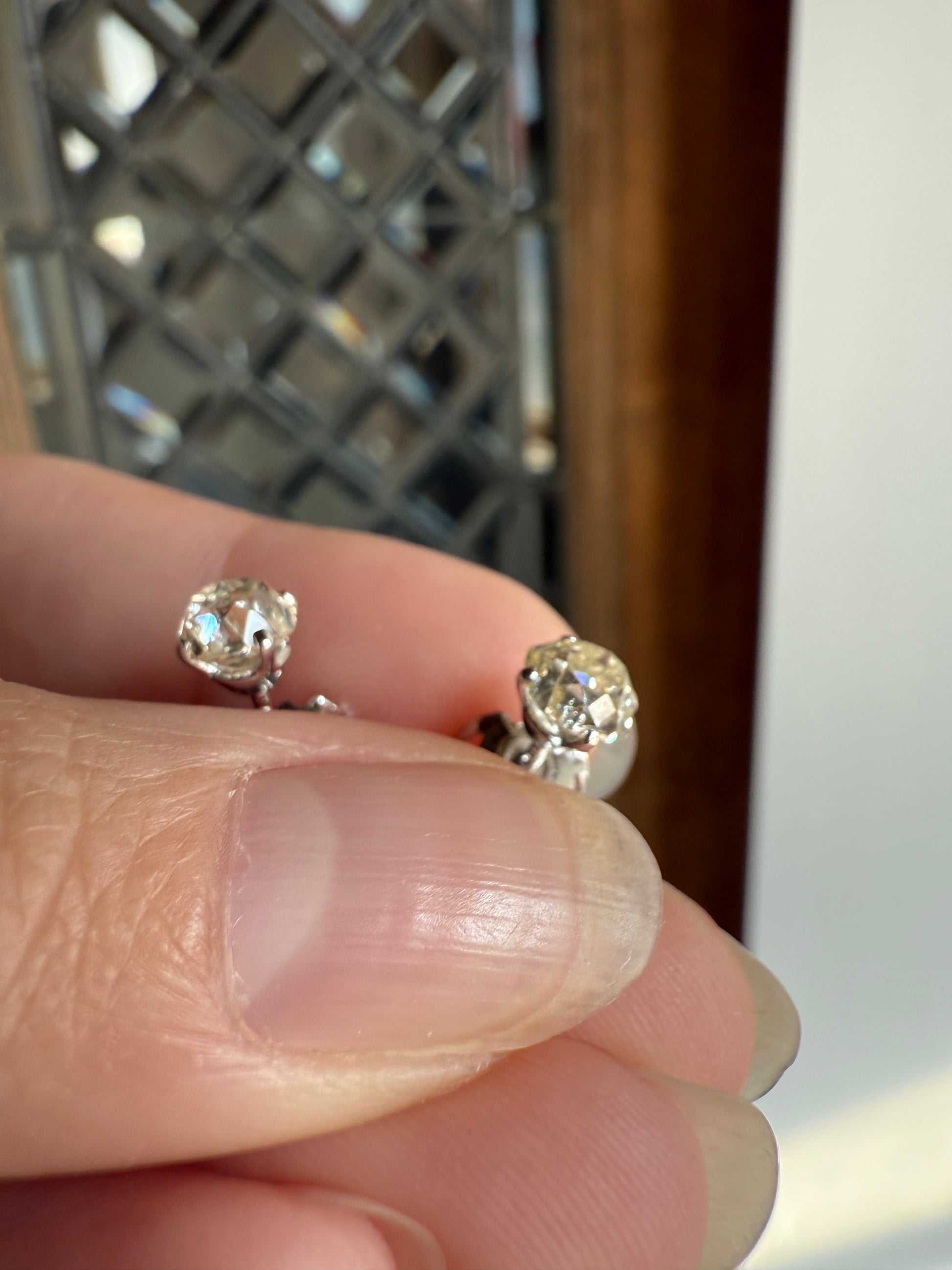 They are set in very minimalist settings, with just four small prongs holding the stones and a cupped back which still allows the diamonds to catch the light from all angles. To me, the settings become almost invisible, giving the appearance of diamonds floating off the ear. The settings and push backs appear later / more modern while the diamonds are antique.
