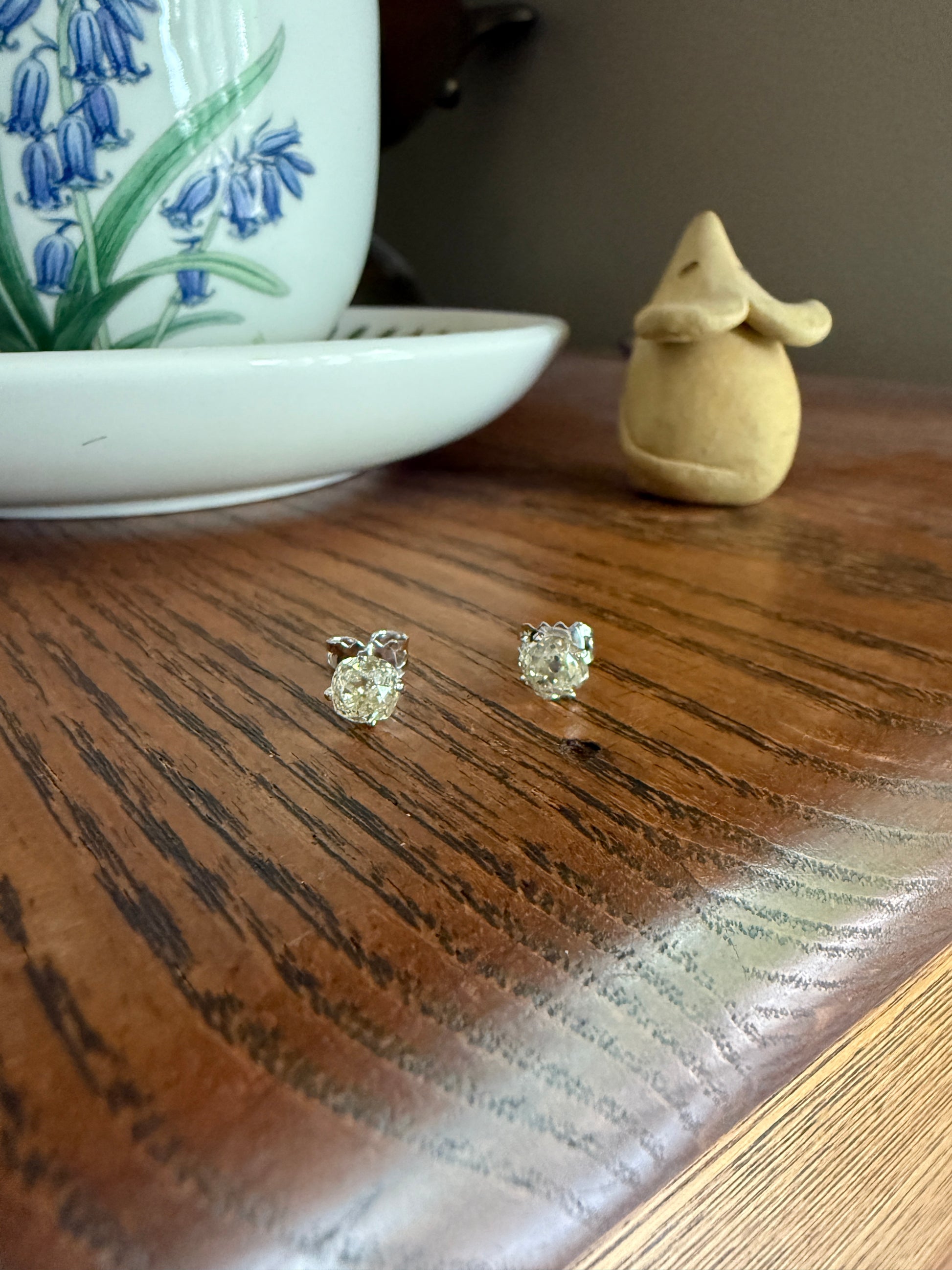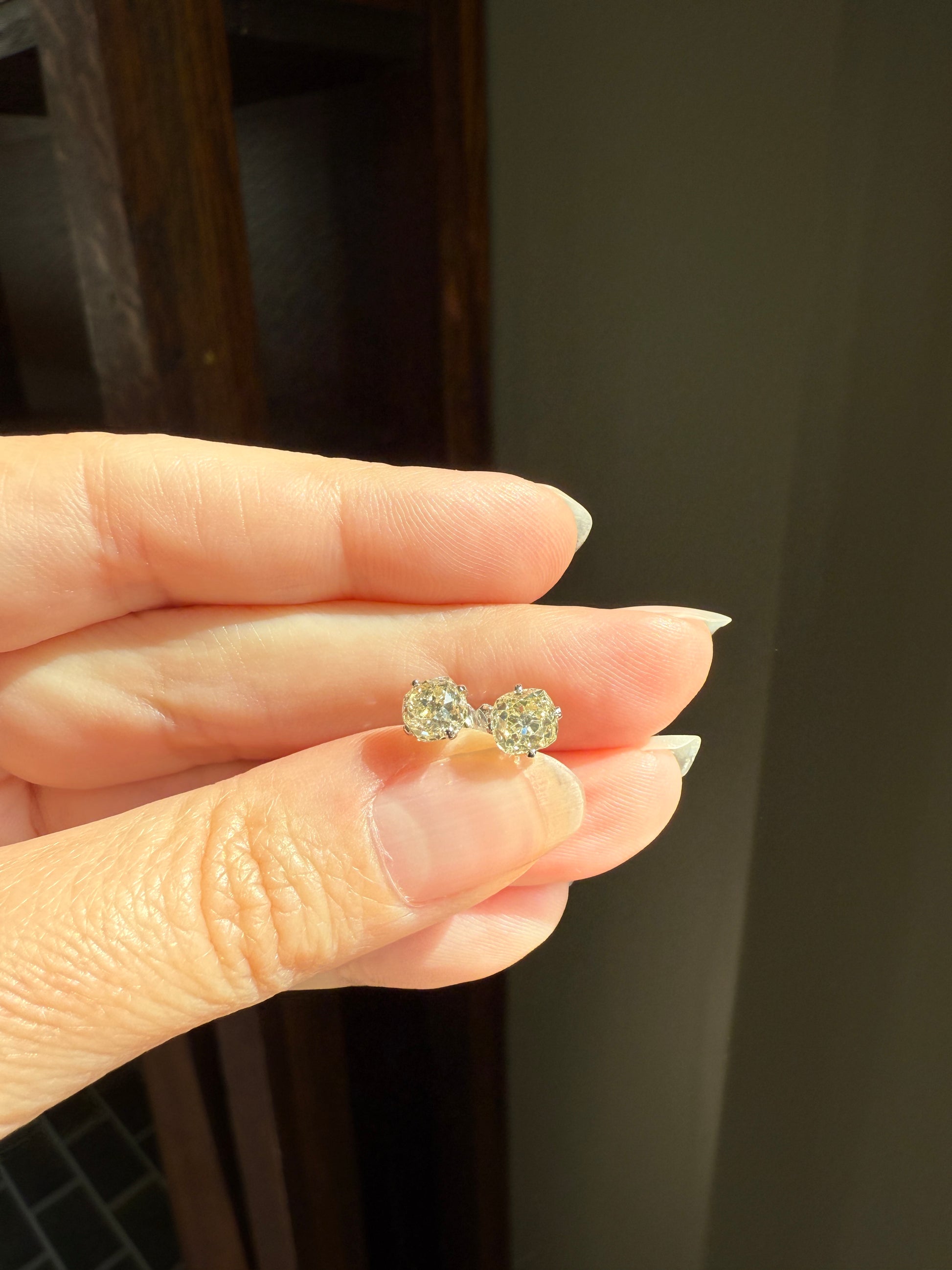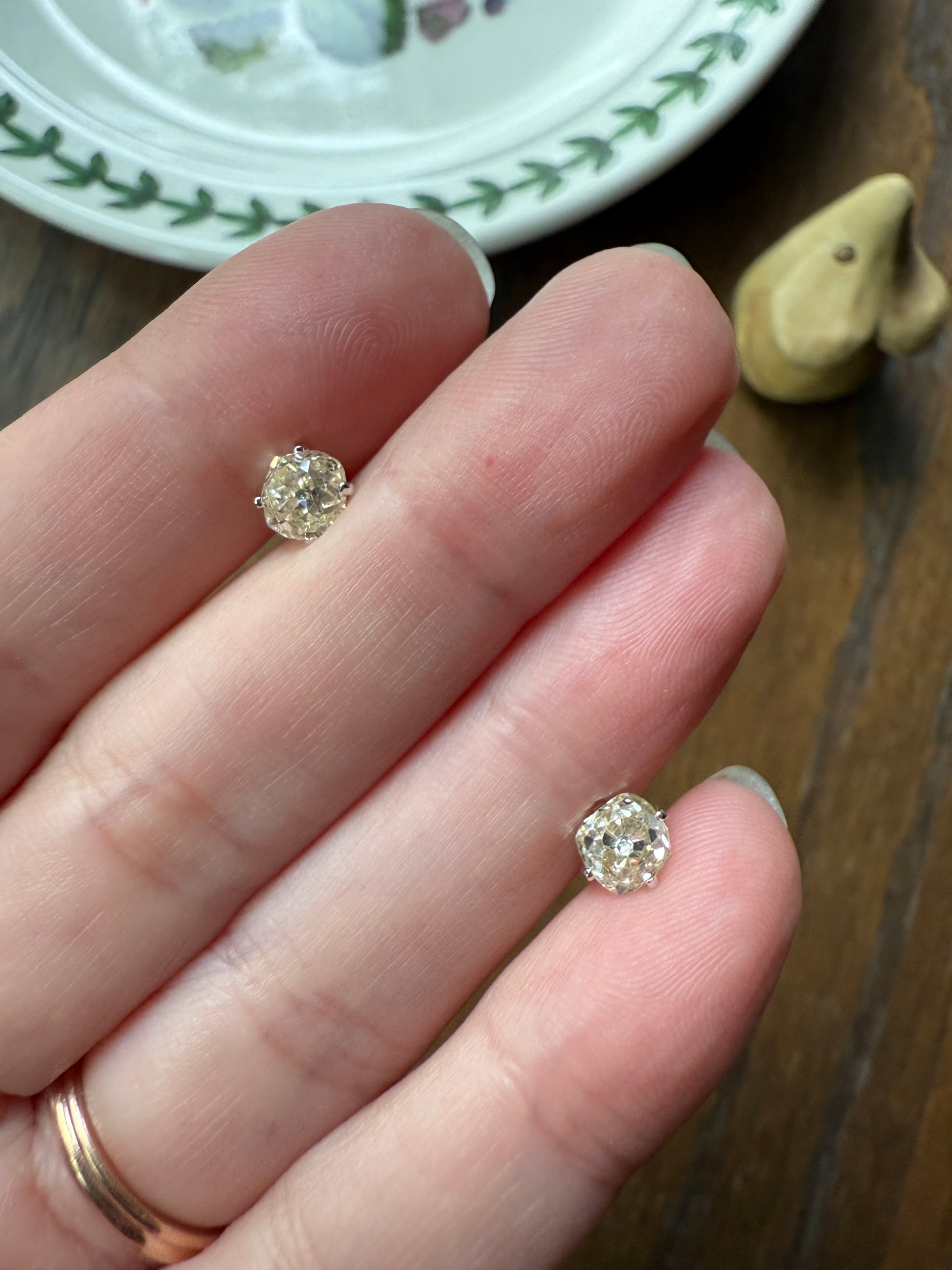 They are set in very minimalist settings, with just four small prongs holding the stones and a cupped back which still allows the diamonds to catch the light from all angles. To me, the settings become almost invisible, giving the appearance of diamonds floating off the ear. The settings and push backs appear later / more modern while the diamonds are antique.