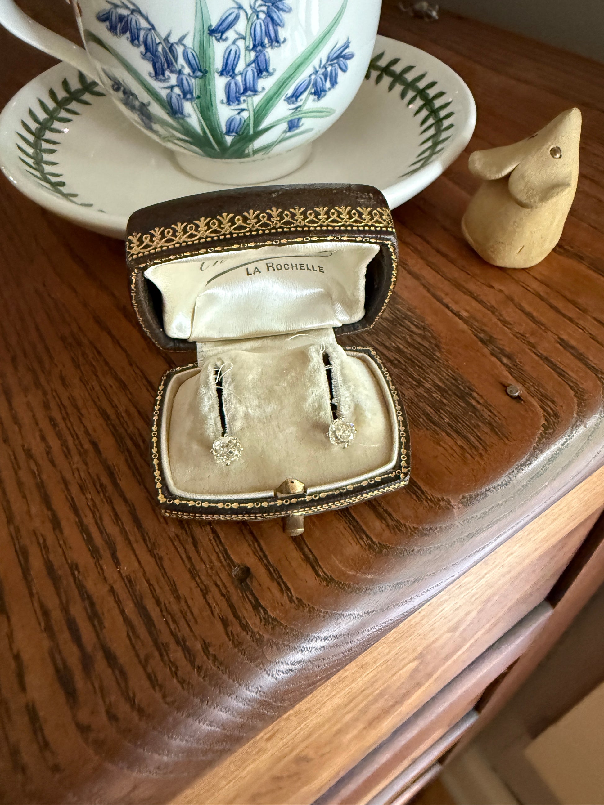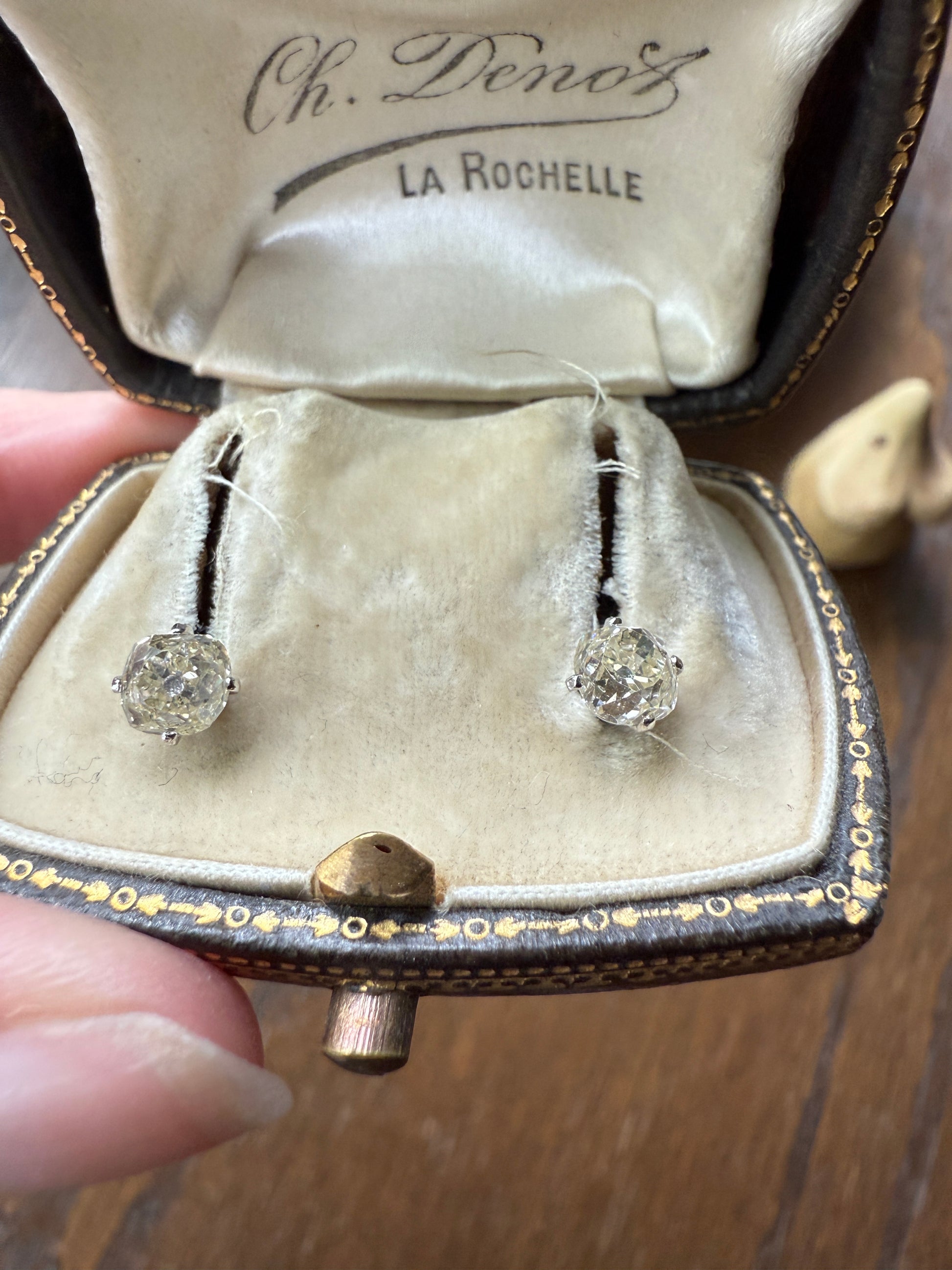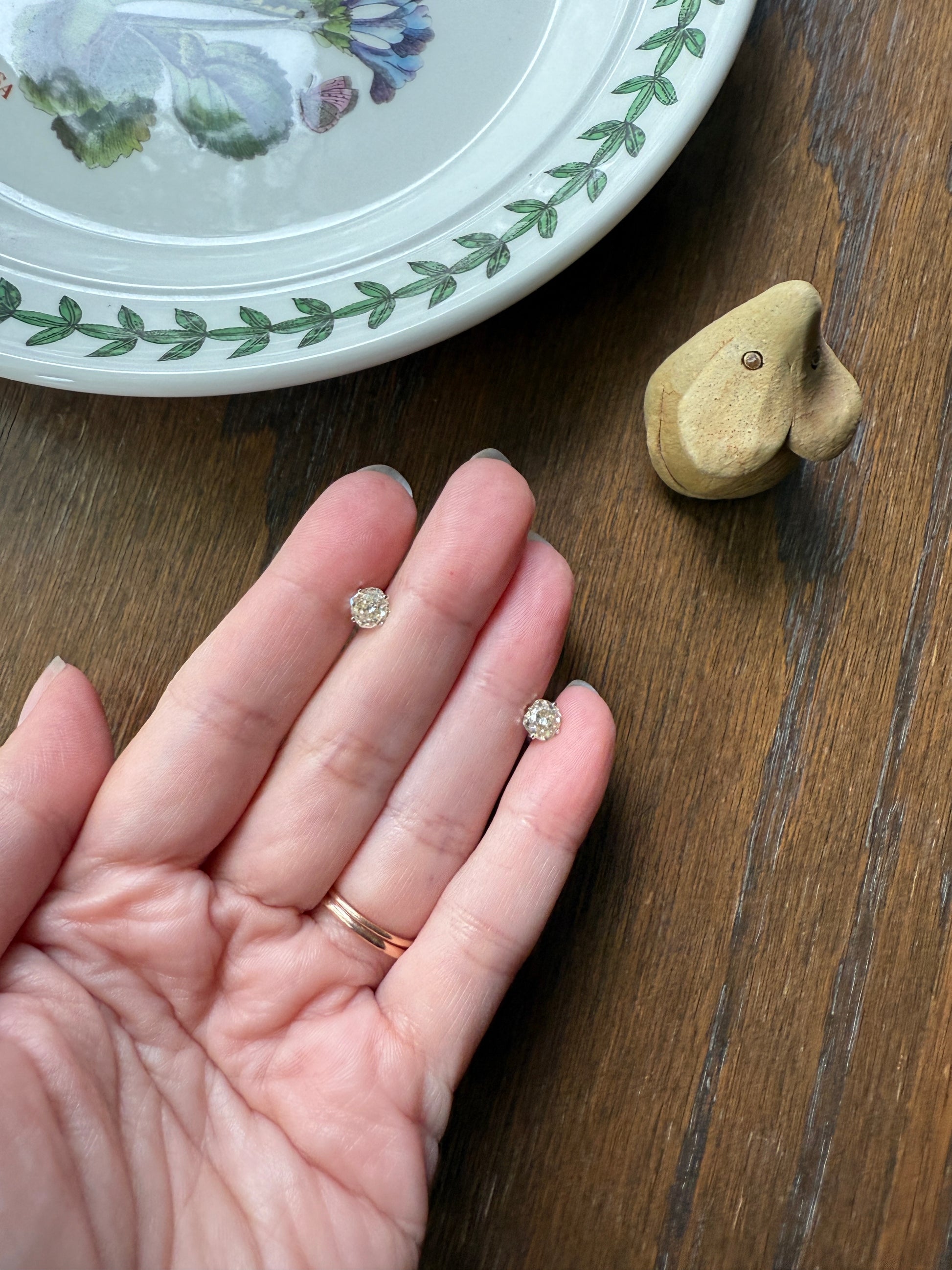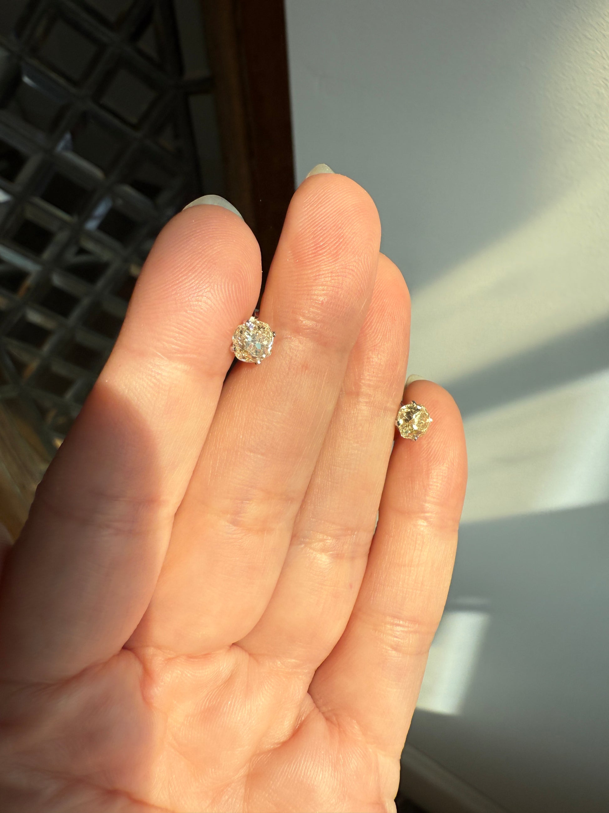 They are set in very minimalist settings, with just four small prongs holding the stones and a cupped back which still allows the diamonds to catch the light from all angles. To me, the settings become almost invisible, giving the appearance of diamonds floating off the ear. The settings and push backs appear later / more modern while the diamonds are antique.