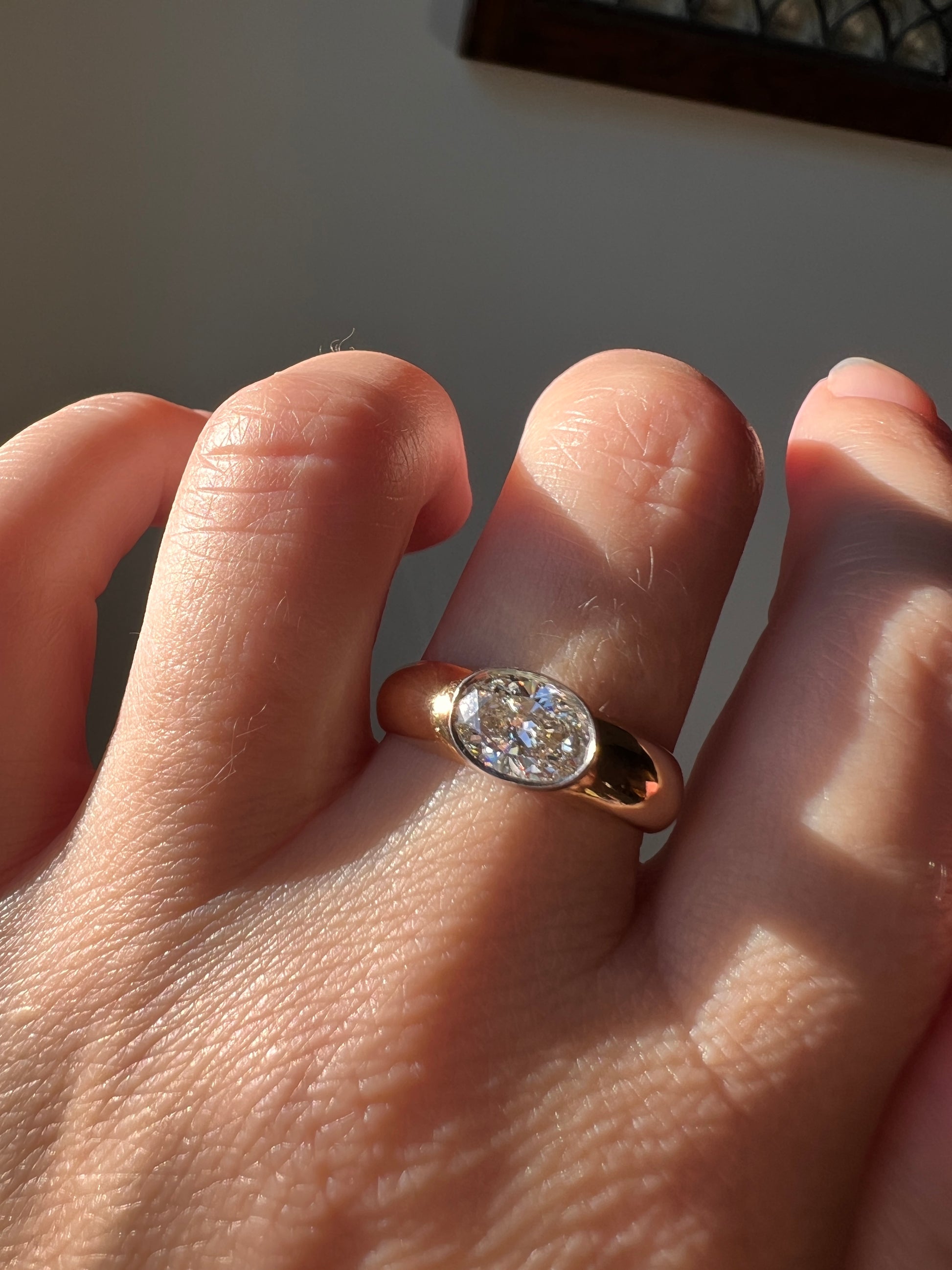 The stone moves in the bezel and can click when you tap it. The girdle edge is not visible anywhere so it does not appear in danger of falling out but perhaps this is something a goldsmith could tighten? Some surface wear and scuffs to the gold, but there are no dark spots to the gold, it was just difficult to photograph because it is so shiny and mirrored that it reflects its surroundings. No nicks or chips to the diamond whatsoever. Ratings are above and it has a really nice sparkly fire, but has a slight warmth under magnification and an area of natural inclusions that appear like frosty and gray specks.