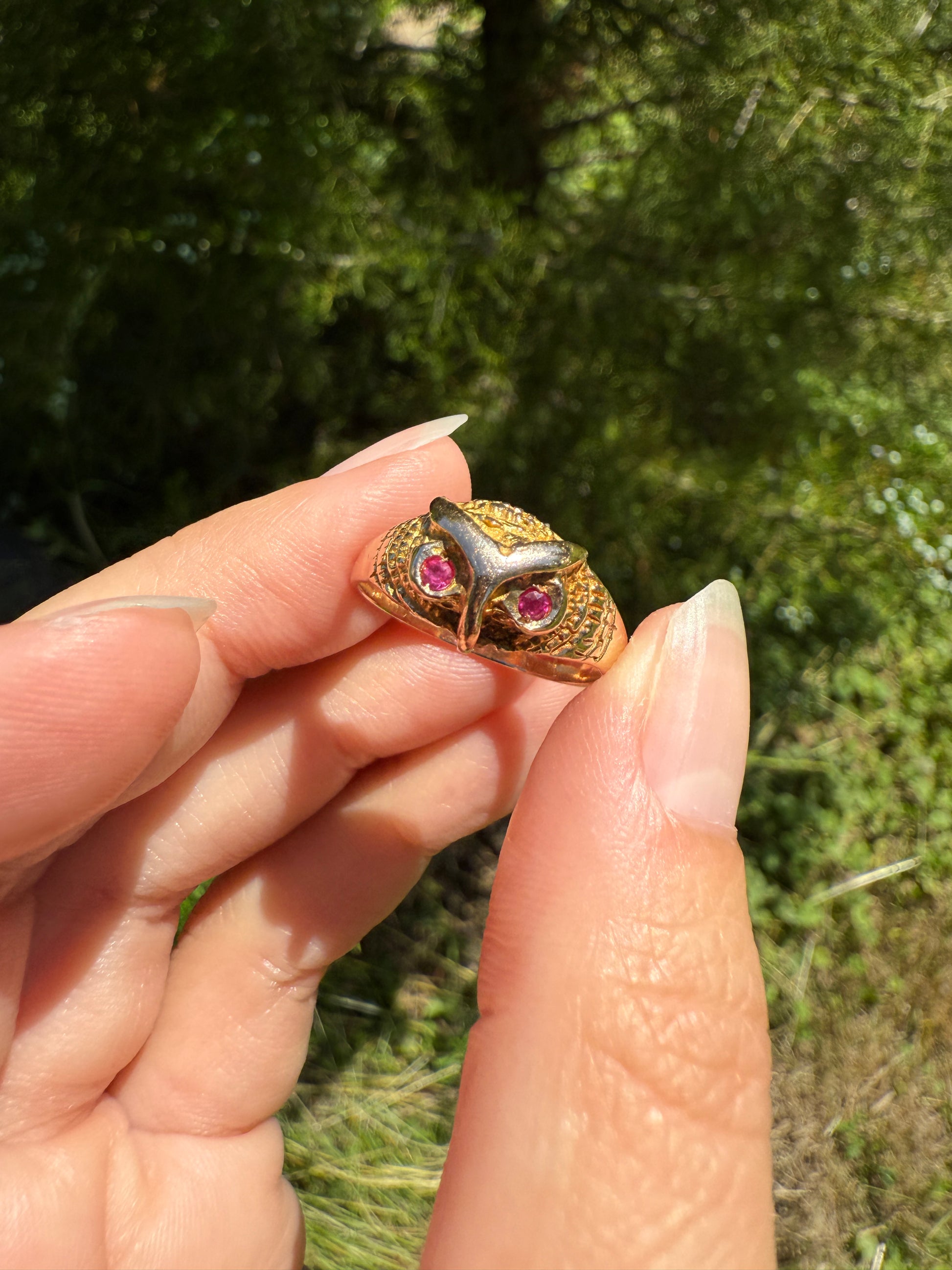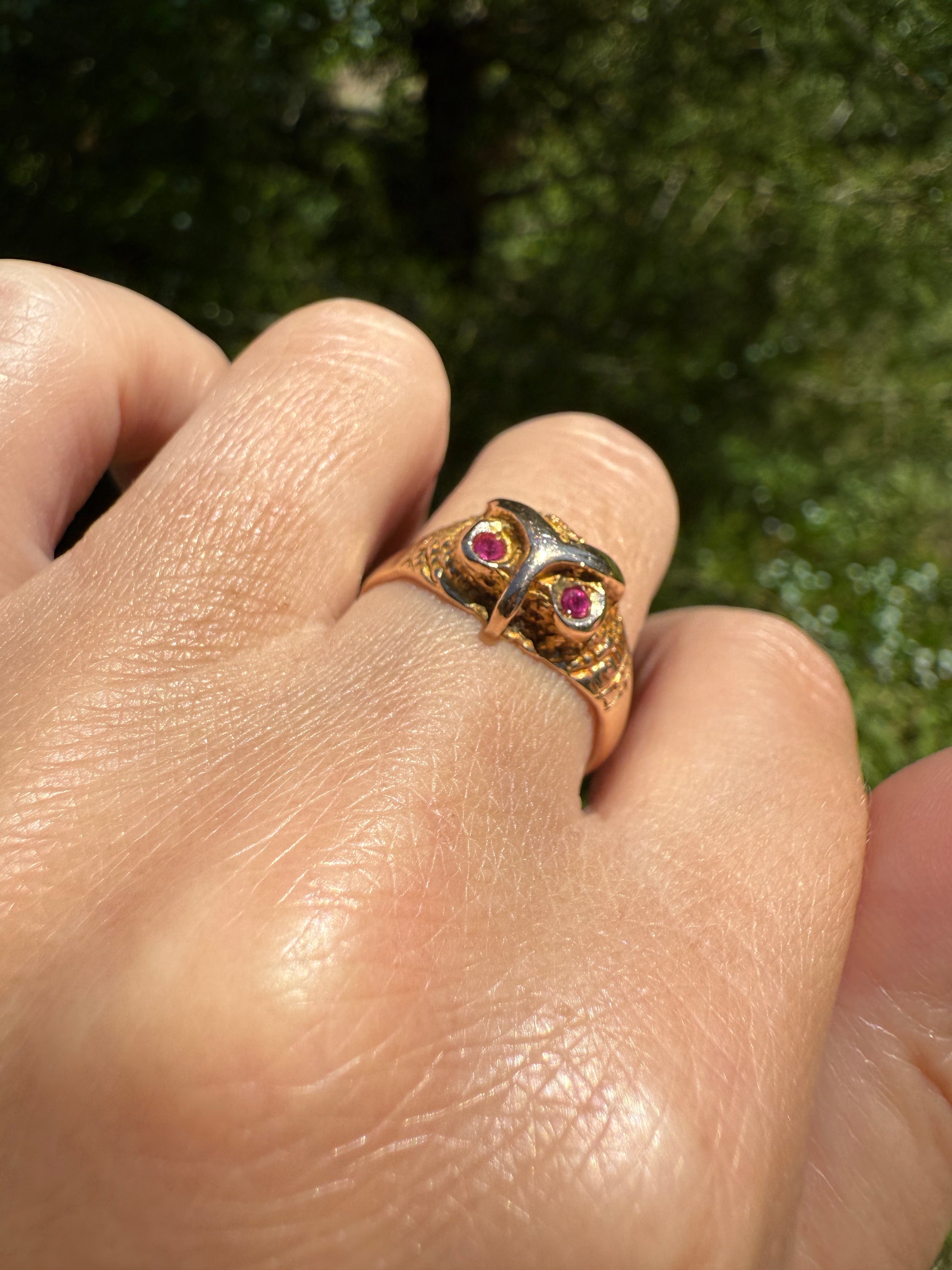 OWL French Vintage 18k Gold Perched Figural Ring Diamond and Ruby Eyes