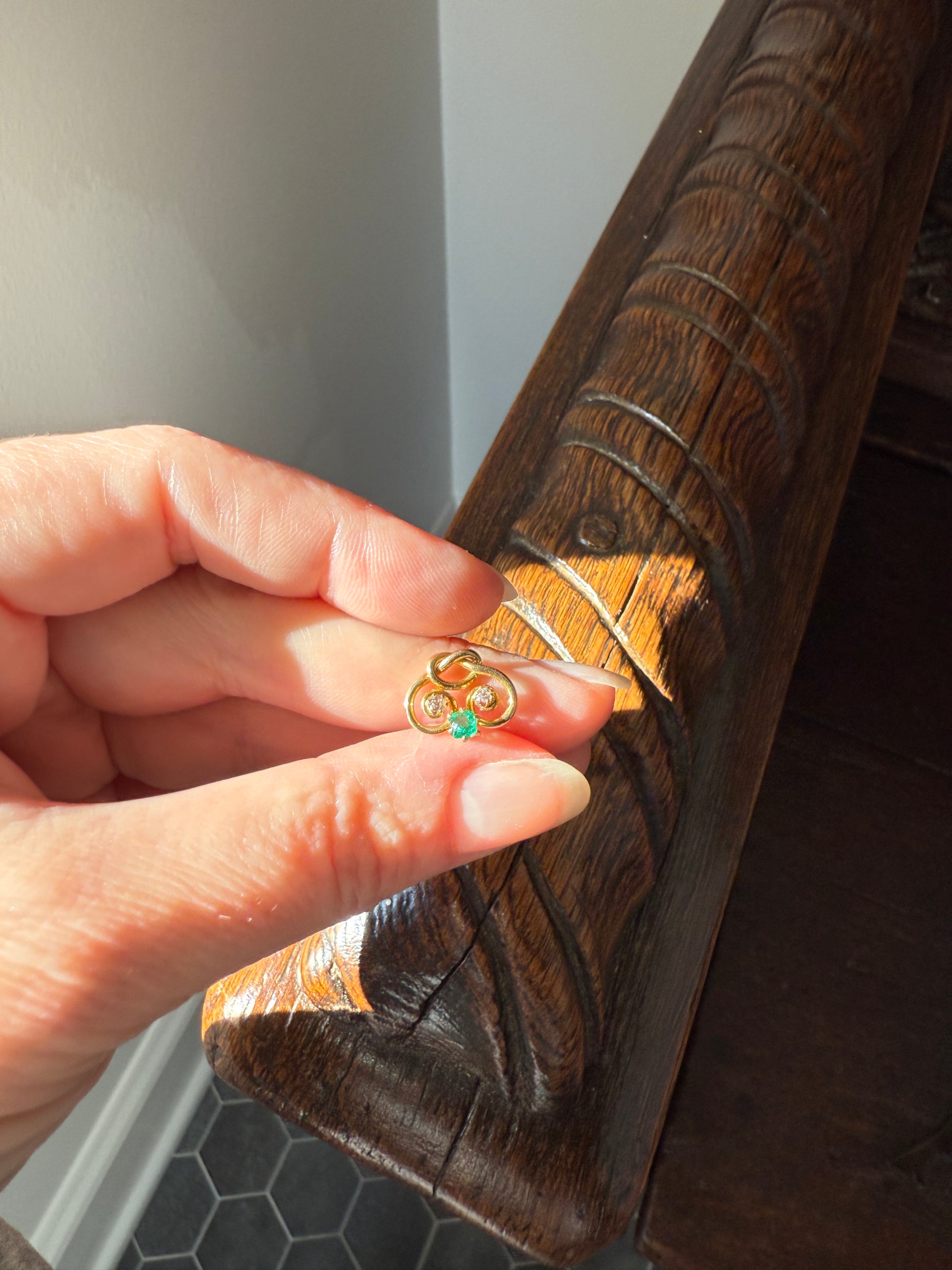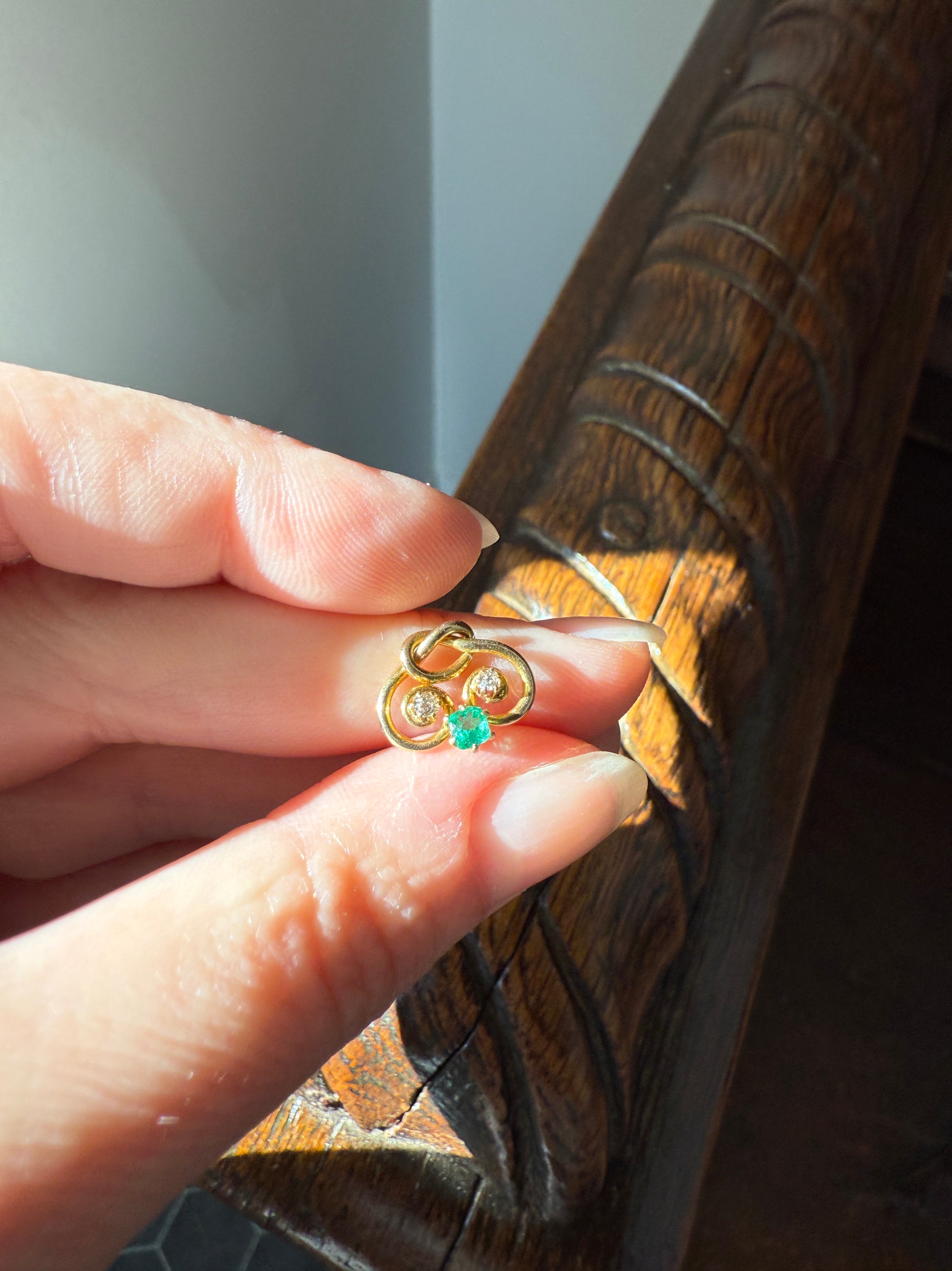 In glowing 14k gold with a pop of color from the natural emerald and two little old mine cut diamonds for a glint of sparkle. Ornate little swirly doo dad.