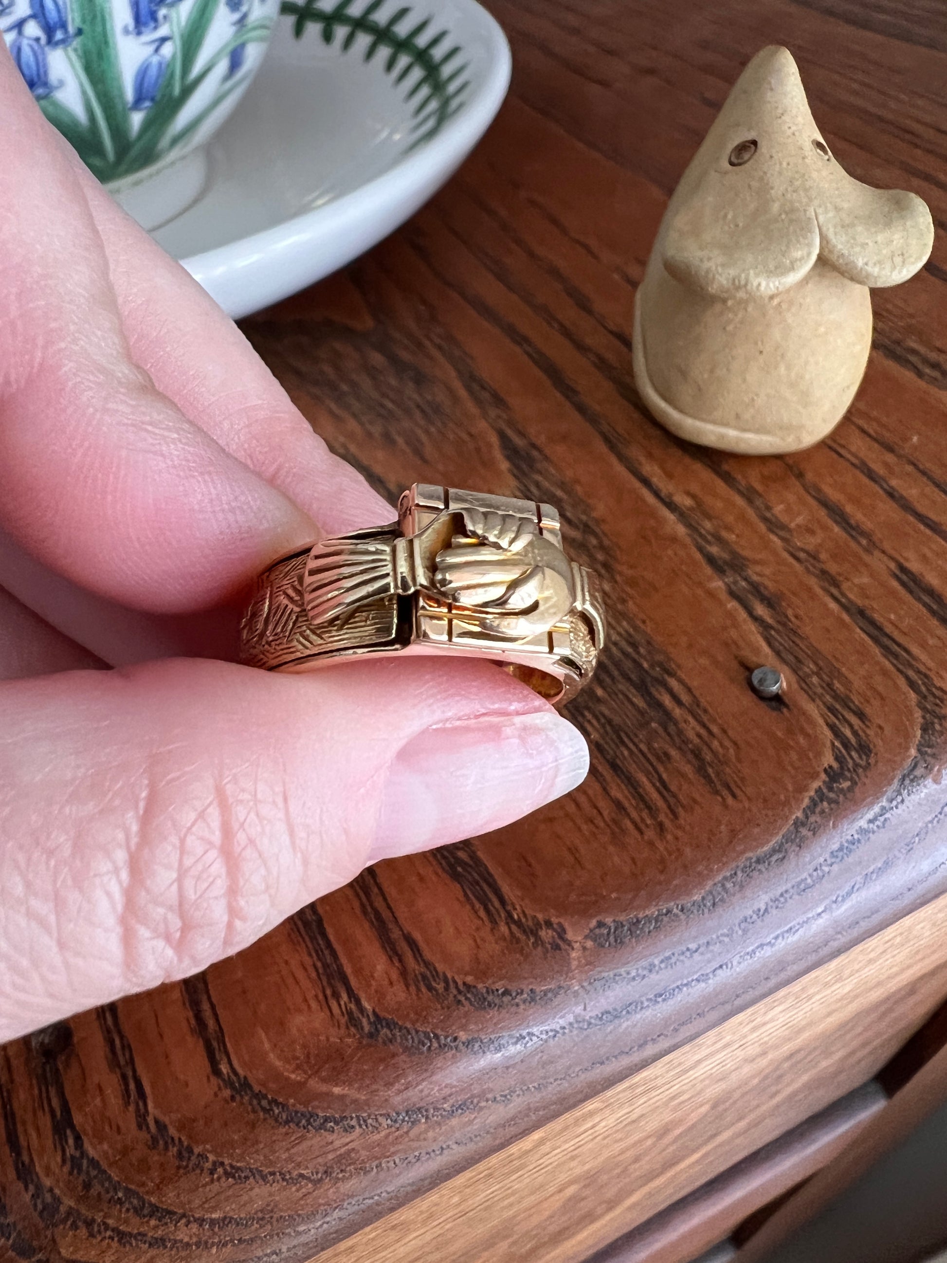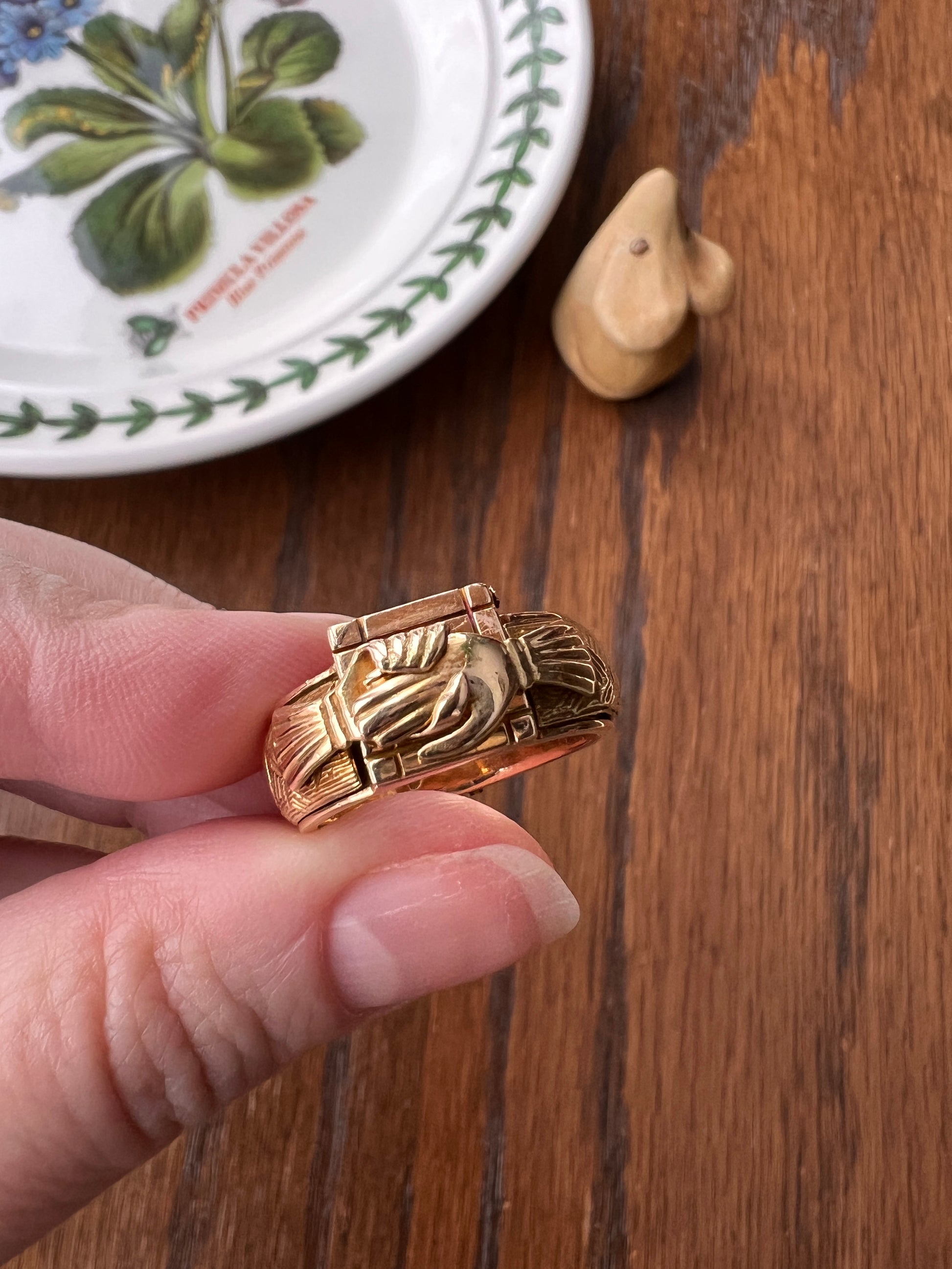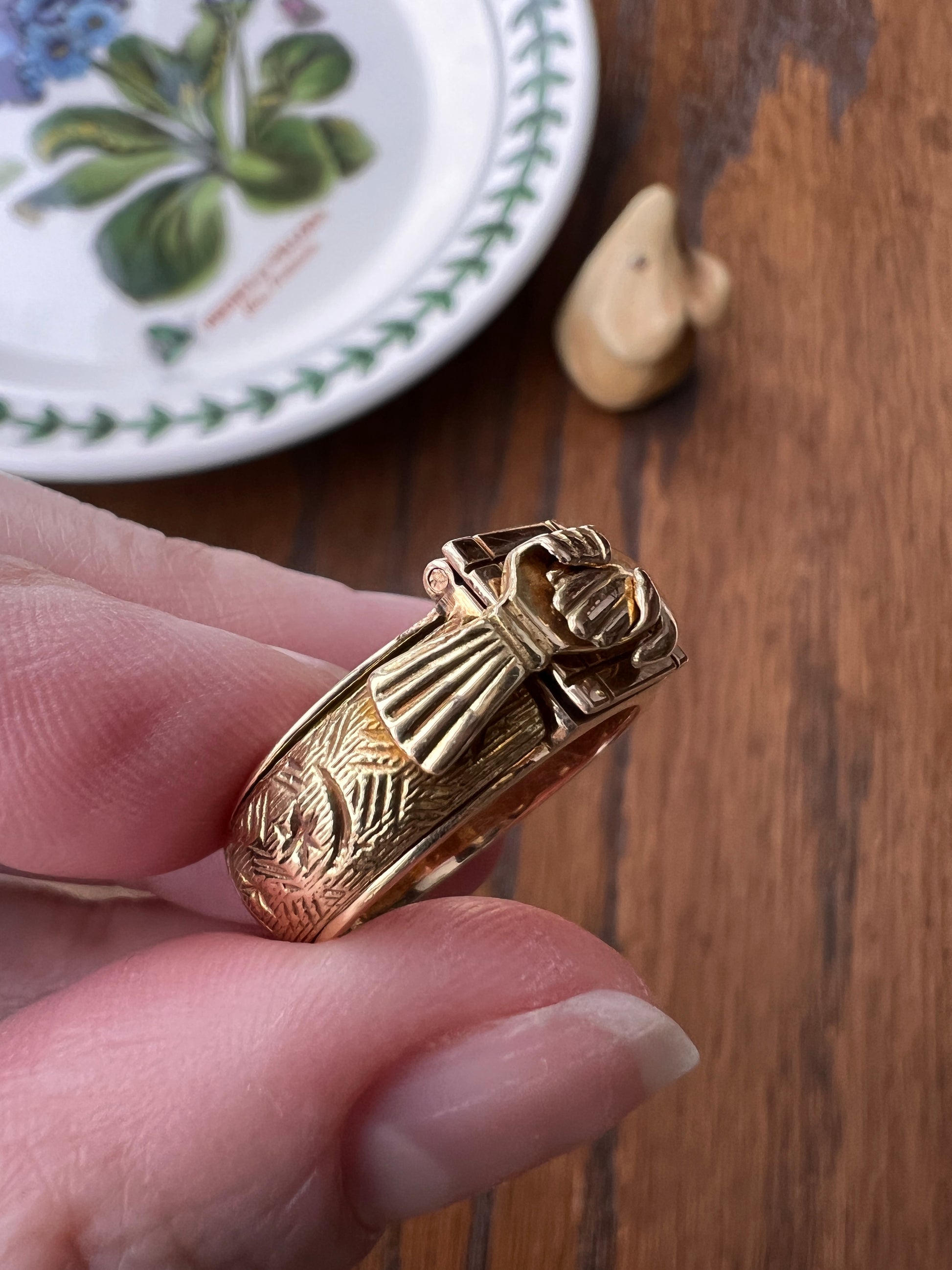 Rare Mazel Tov FEDE Hands Gimmel LOCKET Ring OPENING Secret Panel Doors Vintage to Antique 18k Gold