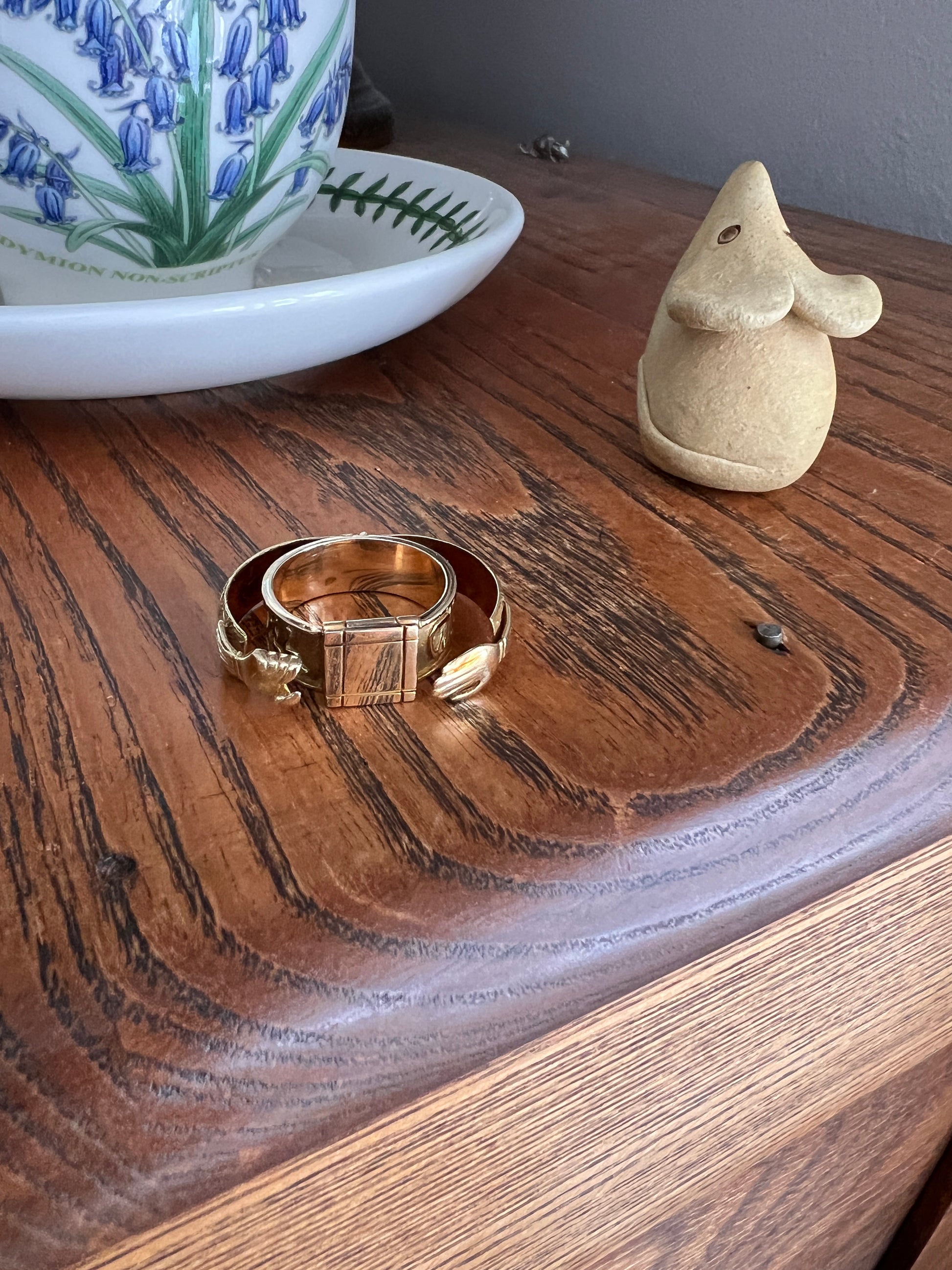 So many moving parts on this interesting and sturdy (it weighs 10.5 grams of 18k gold!) wide band. The panels on each side are hand engraved with moons and stars and linear designs.
