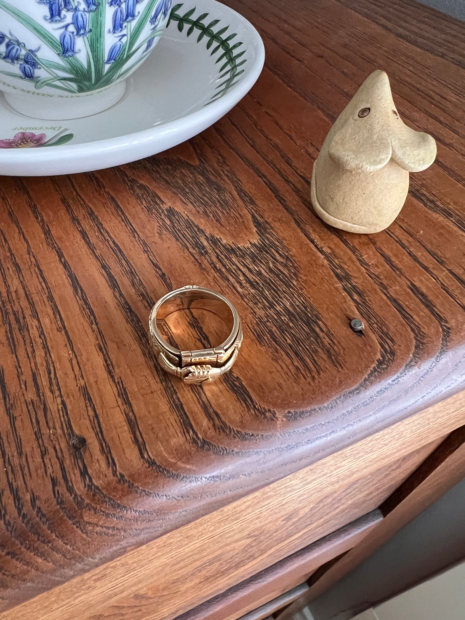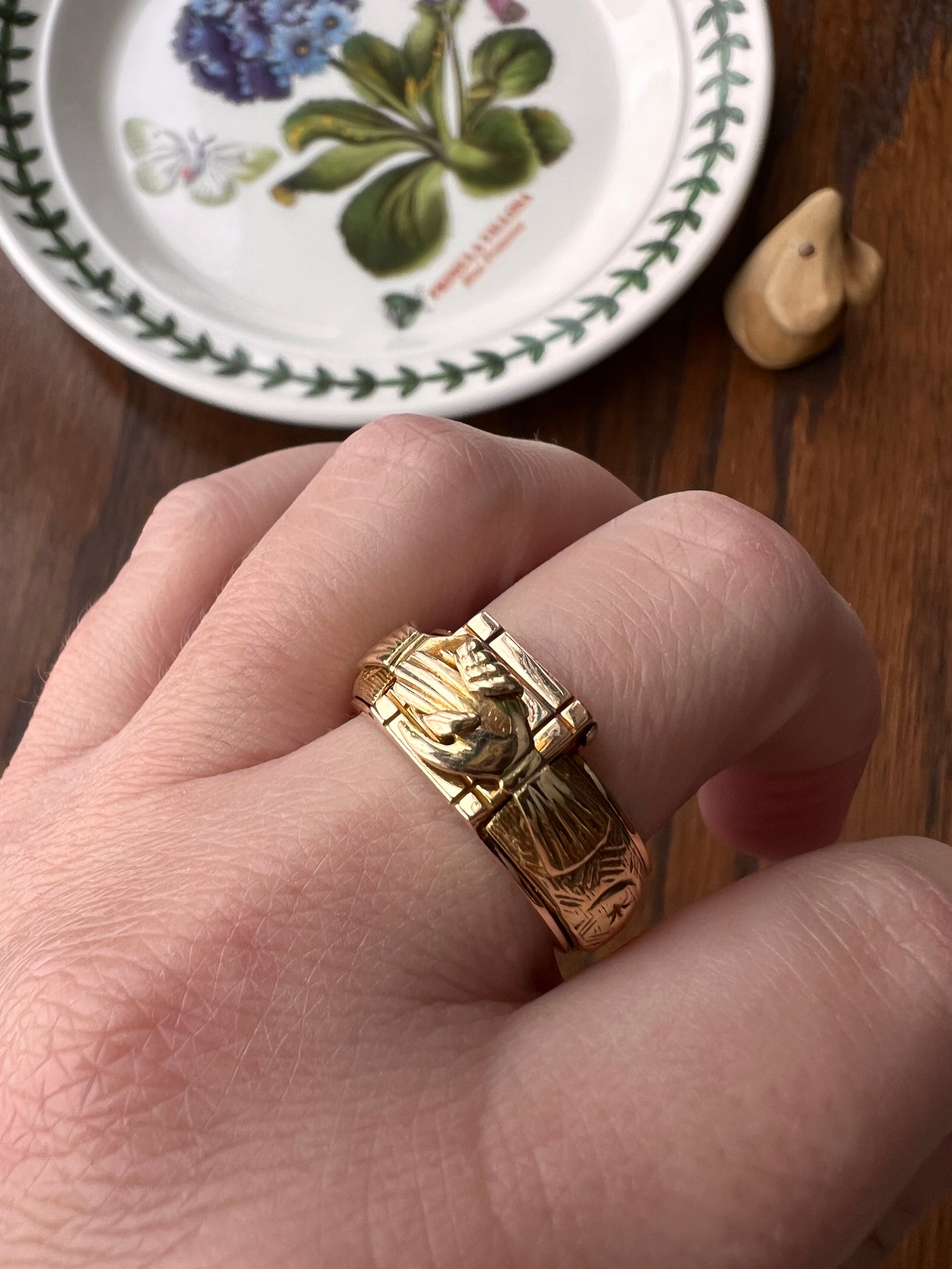 First we have the striking handshake / hands clasped at the front of the wide band. In Georgian and Victorian times, the handshake motif pieces were a symbol of betrothal, agreement, friendship and commitment, including marriage.