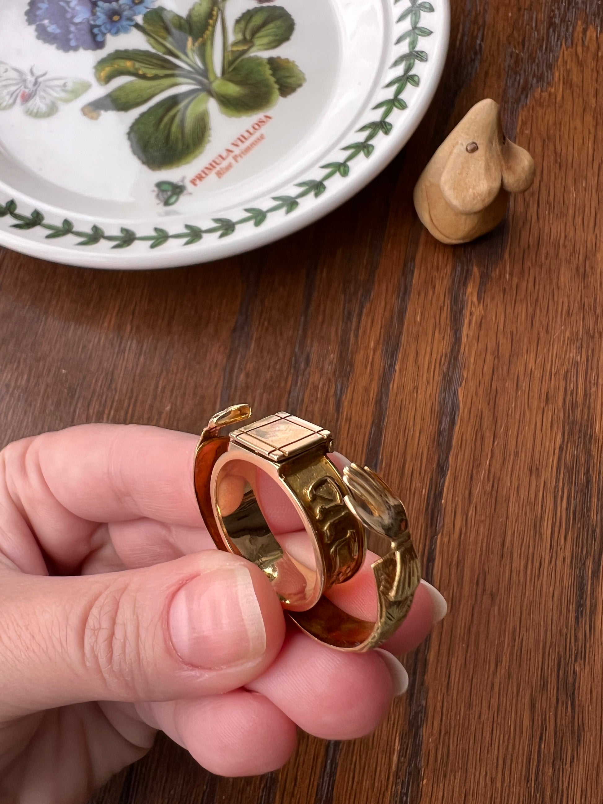 The piece is quite sturdy with a nice and high quality / heavy hand feel. With the eternity band design, it is beautiful to wear, and of course the secret panels make it such a great conversation piece. Love figural pieces! I wish this one fit me. : )