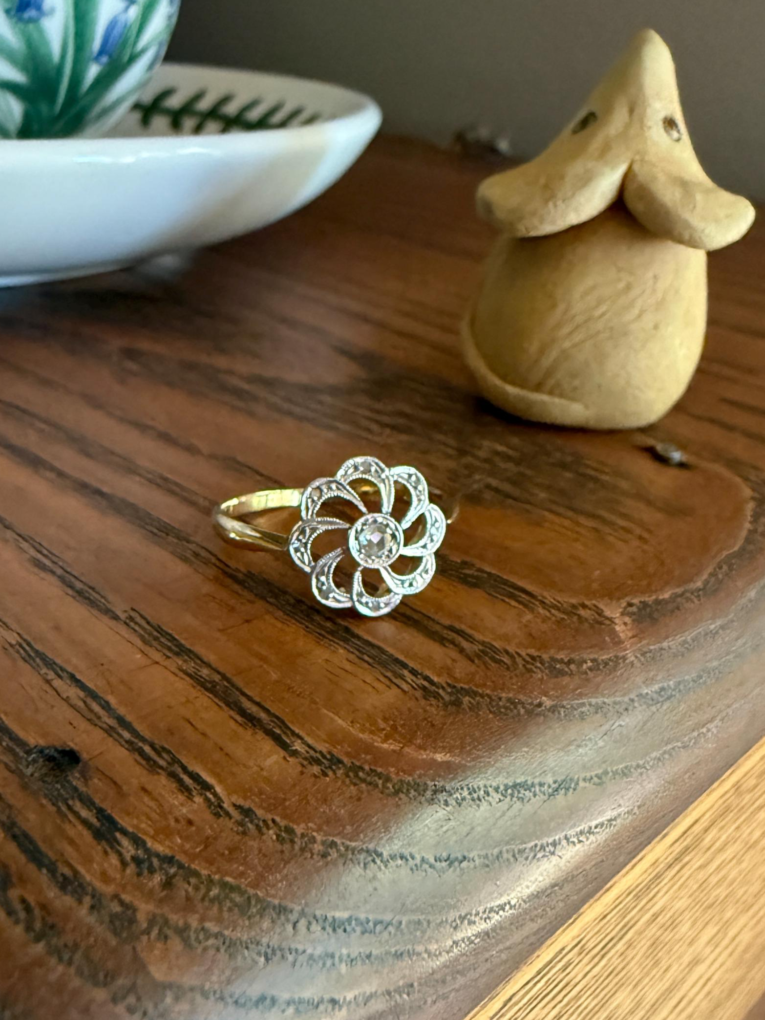 Please note that all my pieces are pre-owned and in estate condition. They will have patina, surface wear, a few small nicks. These pieces may also have evidence of a sizing, some build up around the stones and / or inclusions seen under magnification, typical for antique pieces. I have mentioned any noticeable issues above and they are all still wearable and eager to be loved and accepted for many years to come, (the preservation of antique jewelry, even those with signs of their age and history, is important to me. : ) There are no dark spots to the gold, it was just difficult to photograph because it is so shiny and mirrored that it reflects its surroundings including the green trees out the window.