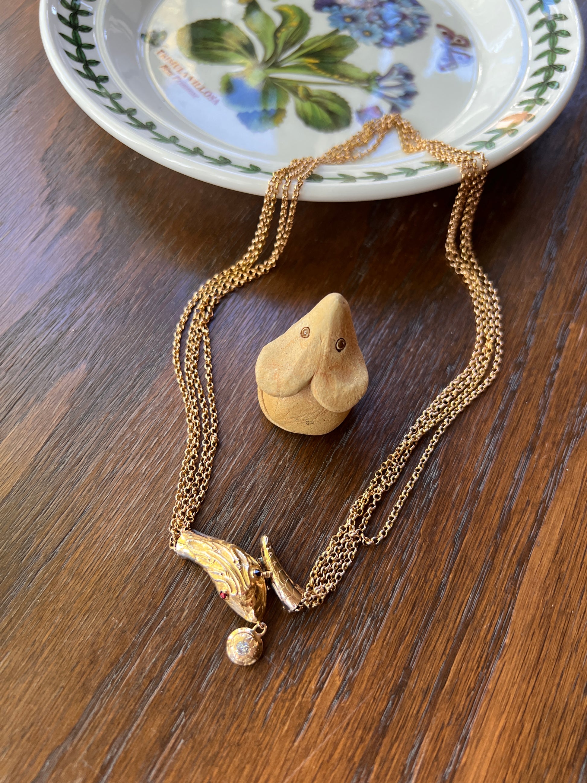 One of the garnet eyes is a later replacement inserted pavilion up to mimic the other rose cut. I only noticed this under magnification. There are some darker solder spots in the recesses on the head and tail by the bolts / rivets that connect the chains to the head and tail. They do not look like repairs because there are no lumpy spots or creases / breaks to the gold so perhaps just reinforcing that area for strength? A few shallow dings, one to the left side of the snake nose for example. Slight difference in hue to the patina of the head vs the tail. Surprisingly still quite sturdy for age and very wearable. T he clasp functions really well.