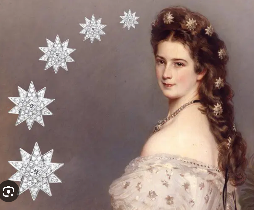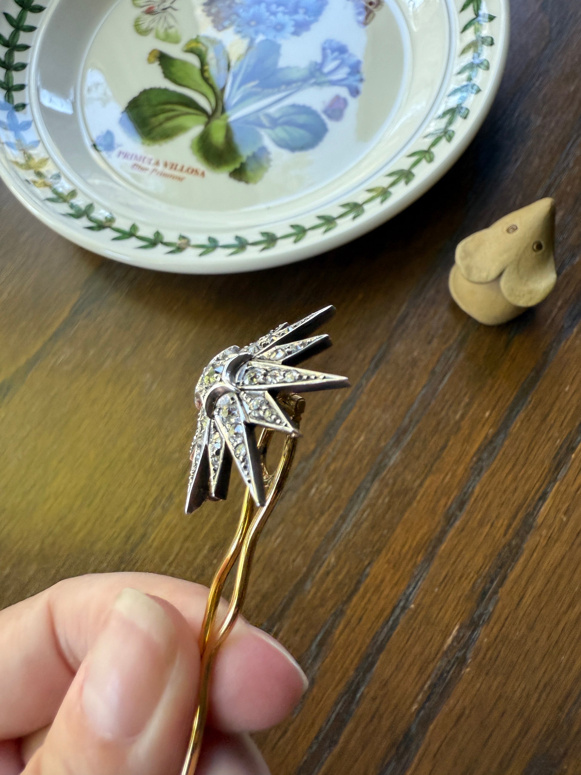 The brown leather box with royal blue velvet interior has a hidden slot / compartment underneath the velvet to hold the hair pin so that it can be readily available to swap between uses. This one was popular in the previews on instagram, with a few jewelry savvy instagram friends reaching out to mention its similarity to Empress Sisi of Austria's famous hair stars. (Not suggesting this is one of her stars but rather that her popularization of the style may have influenced the design of this piece as well).
