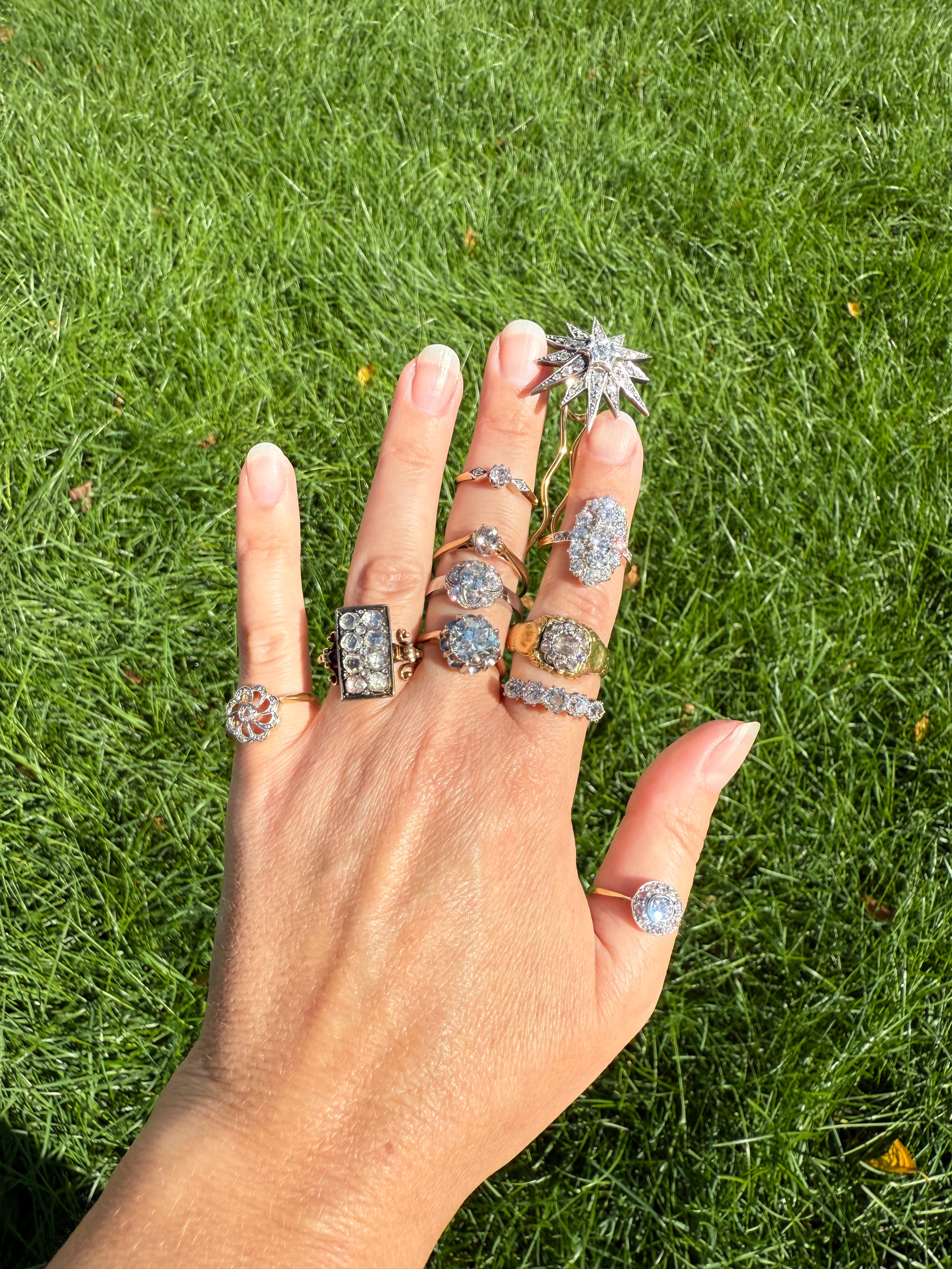 31 diamonds in all. The largest center old mine cut diamond is about 3.9mm. Each arm of the star holds an additional 2-3 old cut diamonds measuring 1.5 to 2.5mm each. Exact depths are unknown / not measurable and I would not remove them for exact weights but estimates to about 1.25 carat total weight in diamonds.