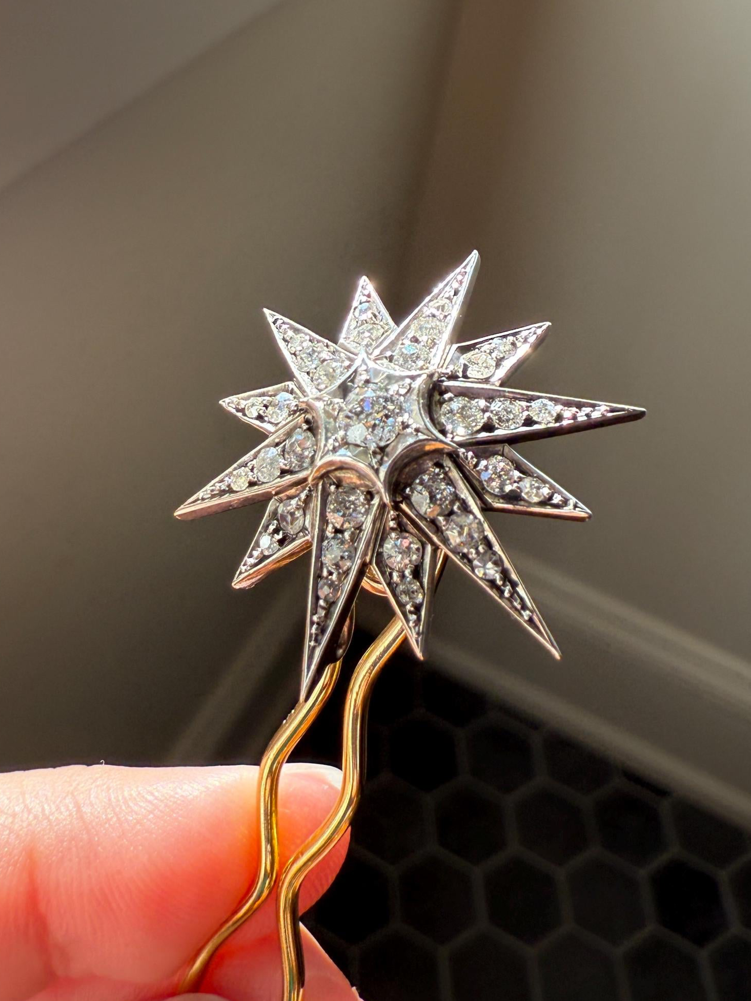 The piece is crafted in mostly silver with some parts testing as 14k gold. The star itself is gold backed as was customary for the period, with the silver top setting the diamonds in white metal, and the hooked arm at the back in 14k gold. The hair pin is gilt silver and the screw pin back fittings are 14k gold and silver. No hallmarks remain.