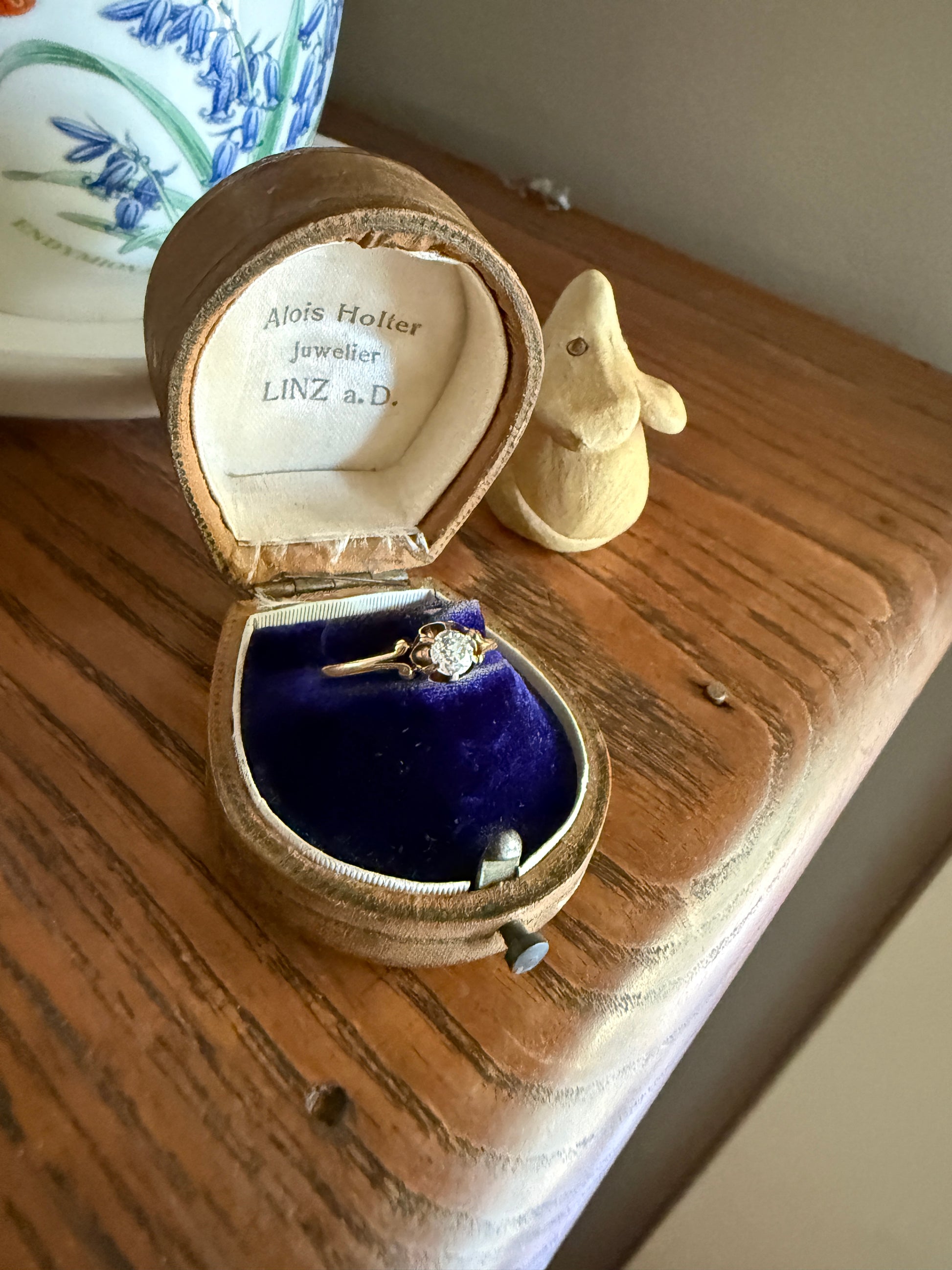 Warm slightly rosy antique 14k gold holds up the bright white antique diamond.