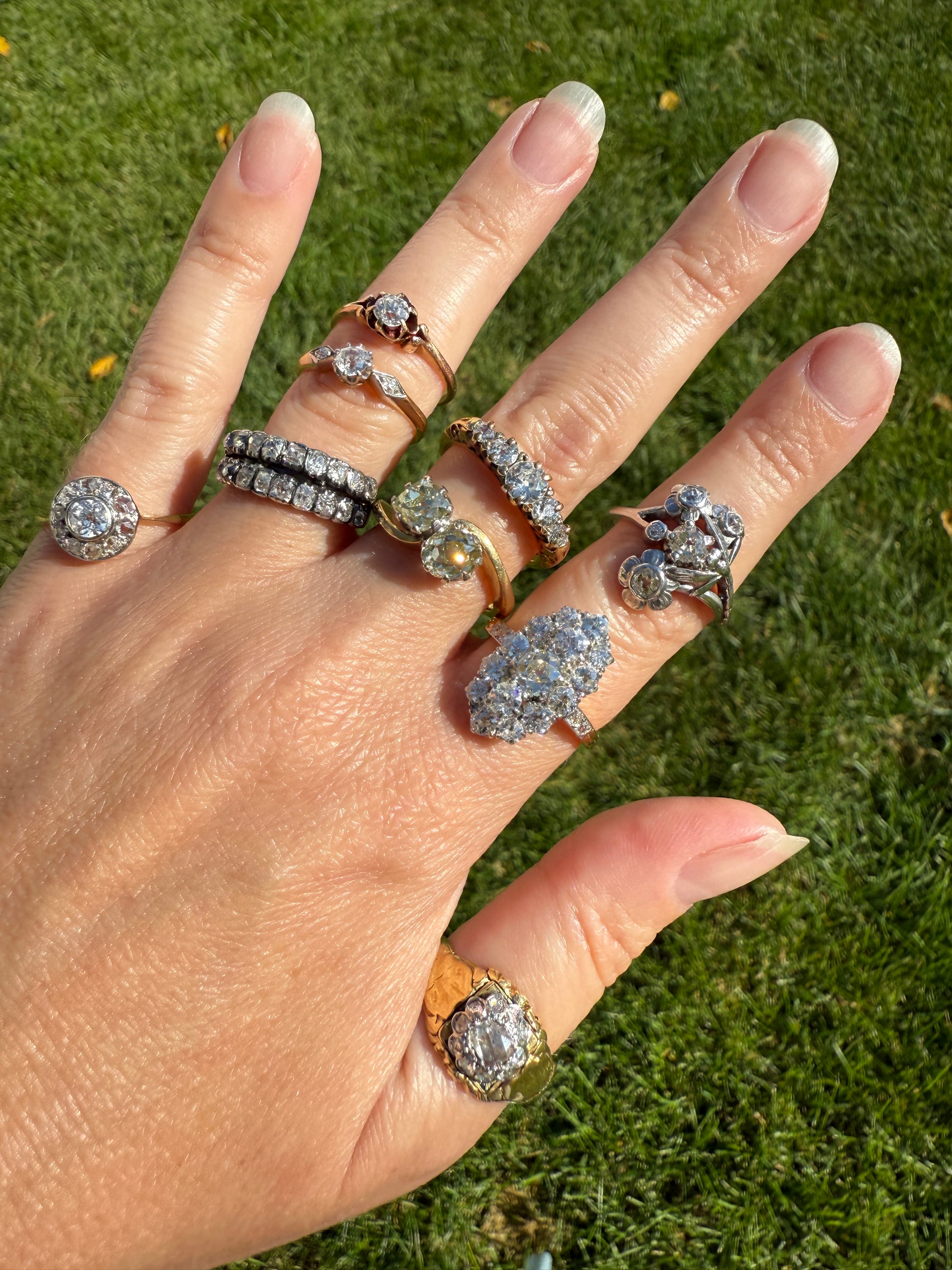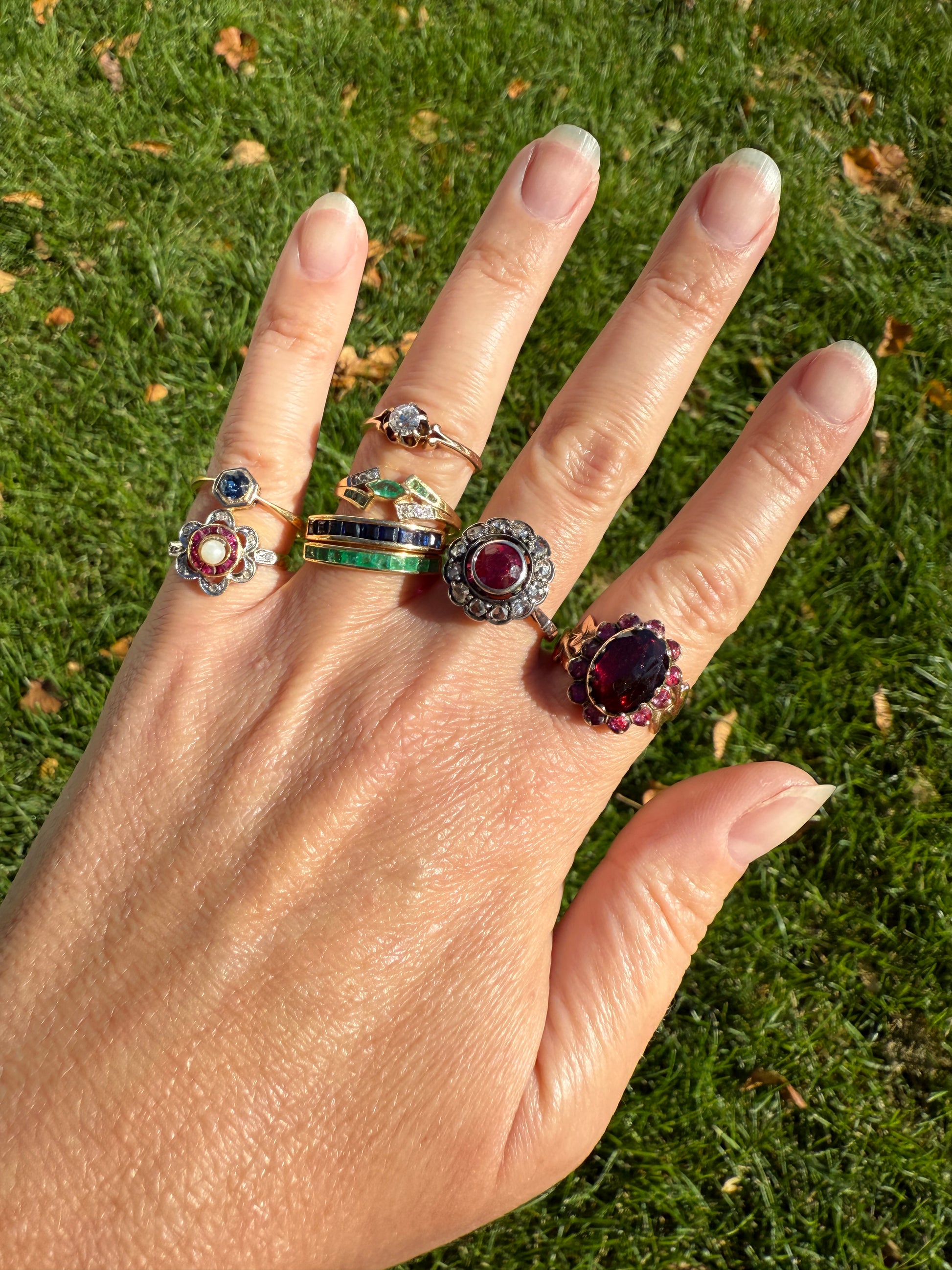 Please note that all my pieces are pre-owned and in estate condition. They will have patina, surface wear, a few small nicks. These pieces may also have evidence of a sizing, some build up around the stones and / or inclusions seen under magnification, typical for antique pieces. I have mentioned any noticeable issues above and they are all still wearable and eager to be loved and accepted for many years to come, (the preservation of antique jewelry, even those with signs of their age and history, is important to me. : ) There are no dark spots to the gold, it was just difficult to photograph because it is so shiny and mirrored that it reflects its surroundings including the green trees out the window.