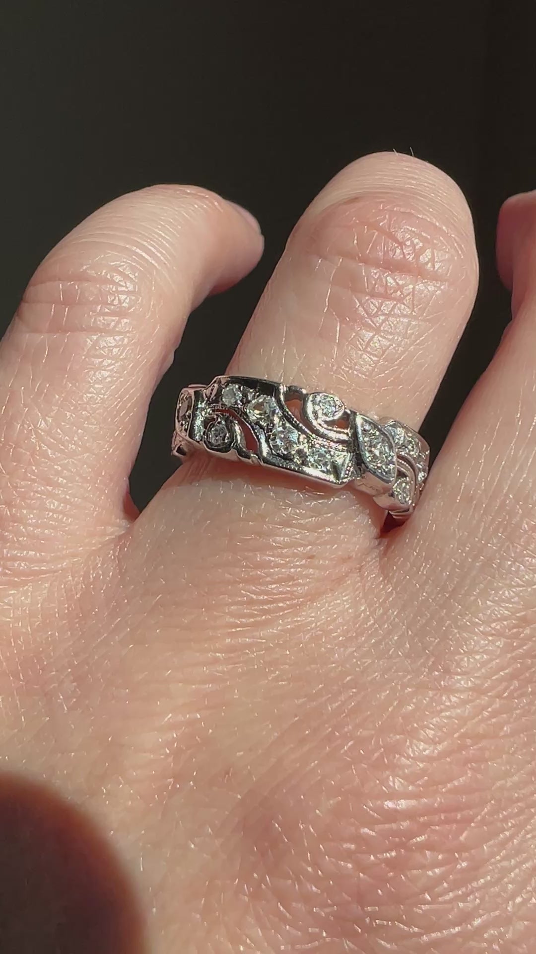 Gorgeous old cut diamond eternity band with 28 stones amidst milgrain, openwork and scrolling details. I Love mixing metals in my ring stack and this is the perfect chunky stacker for such a thing as the 14k white gold layers beautifully with rose and yellow gold as well.