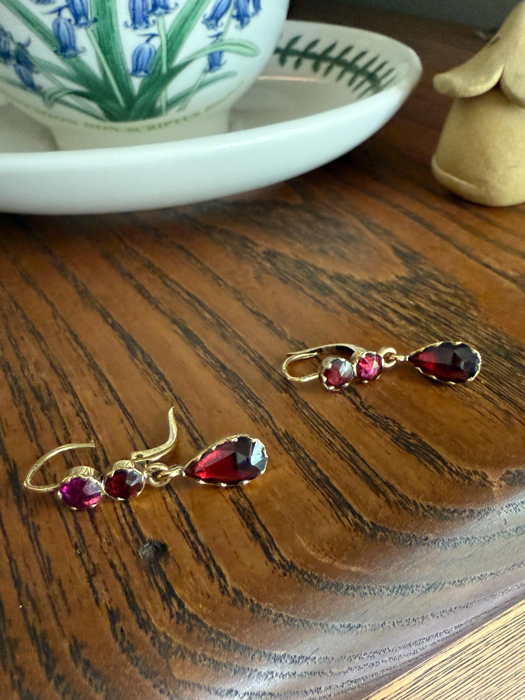 These are fun because we can see a slight variation in color between the natural antique garnets, the teardrops reading a bit richer red where the smaller stones being thinner read a bit more purple pinkish. I love that about them because the best part of these pieces are their colors which travel between pink to purple to berry wine red and these earrings kind of represent all of those color ways. Despite their gorgeous berry red wine coloring, they somehow manage to emit sparkle!