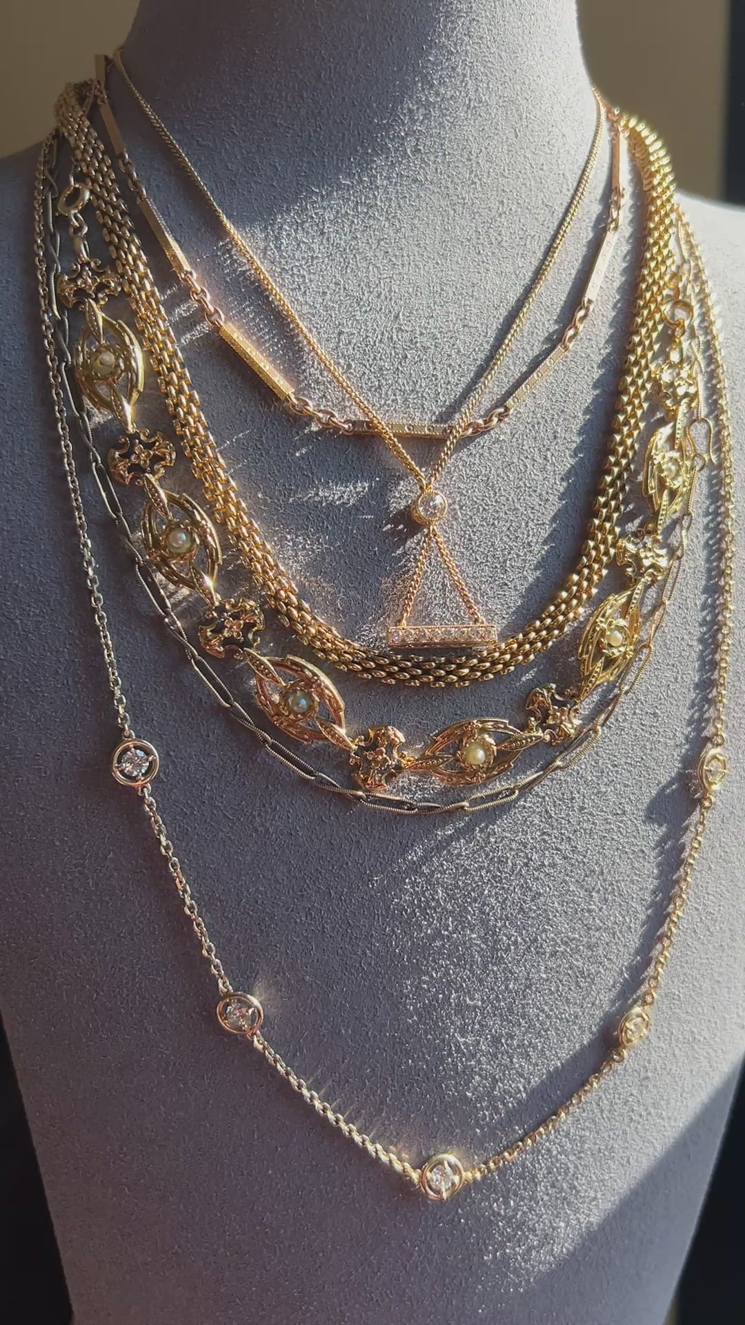 Added to this is a simpler chain with marquise links and filigree details. This brings the length to 16 3/4 inches to wear the pieces as a necklace! The marquise link chan may have been a watch chain due to its length alone of 9 inches.