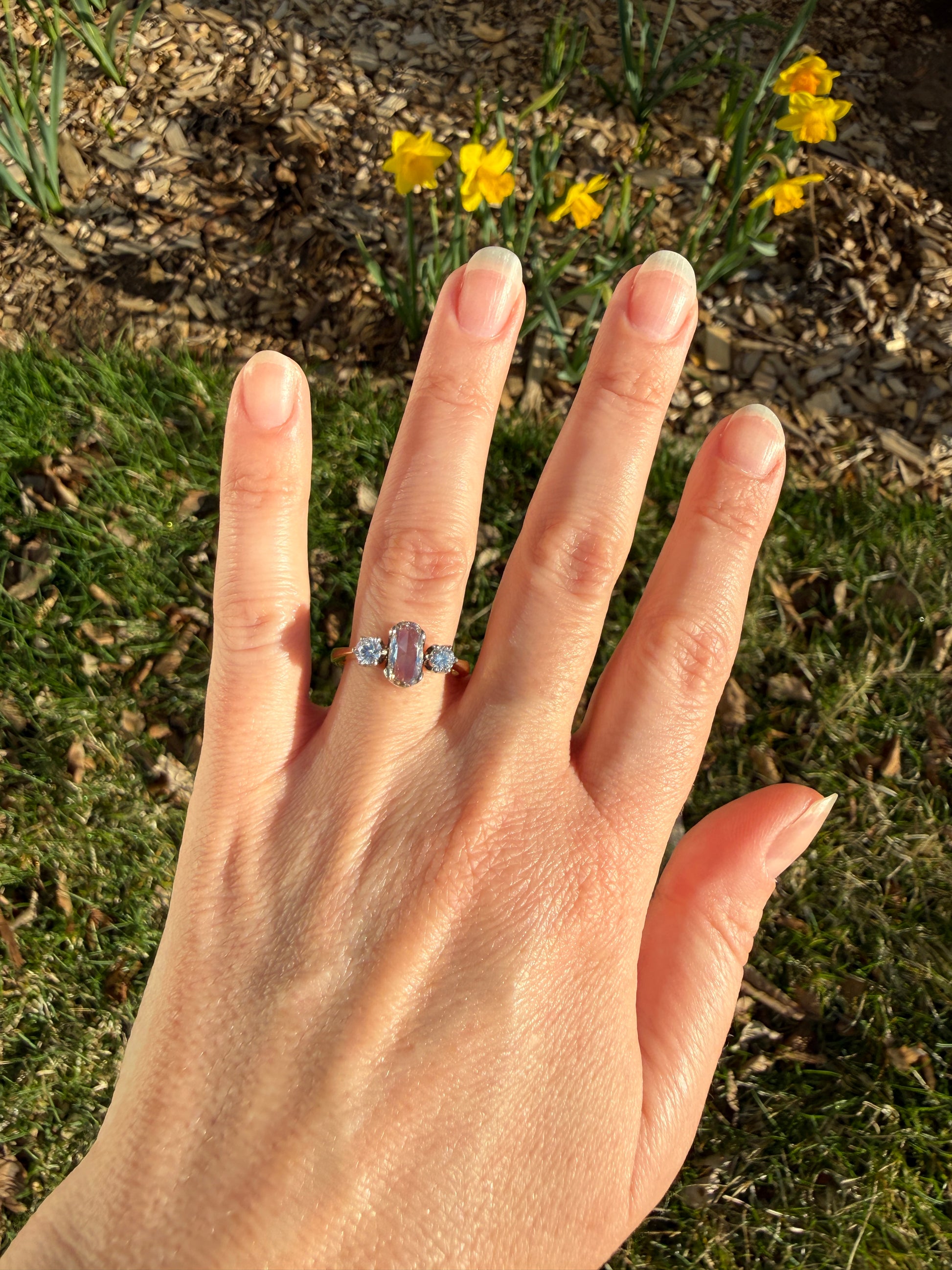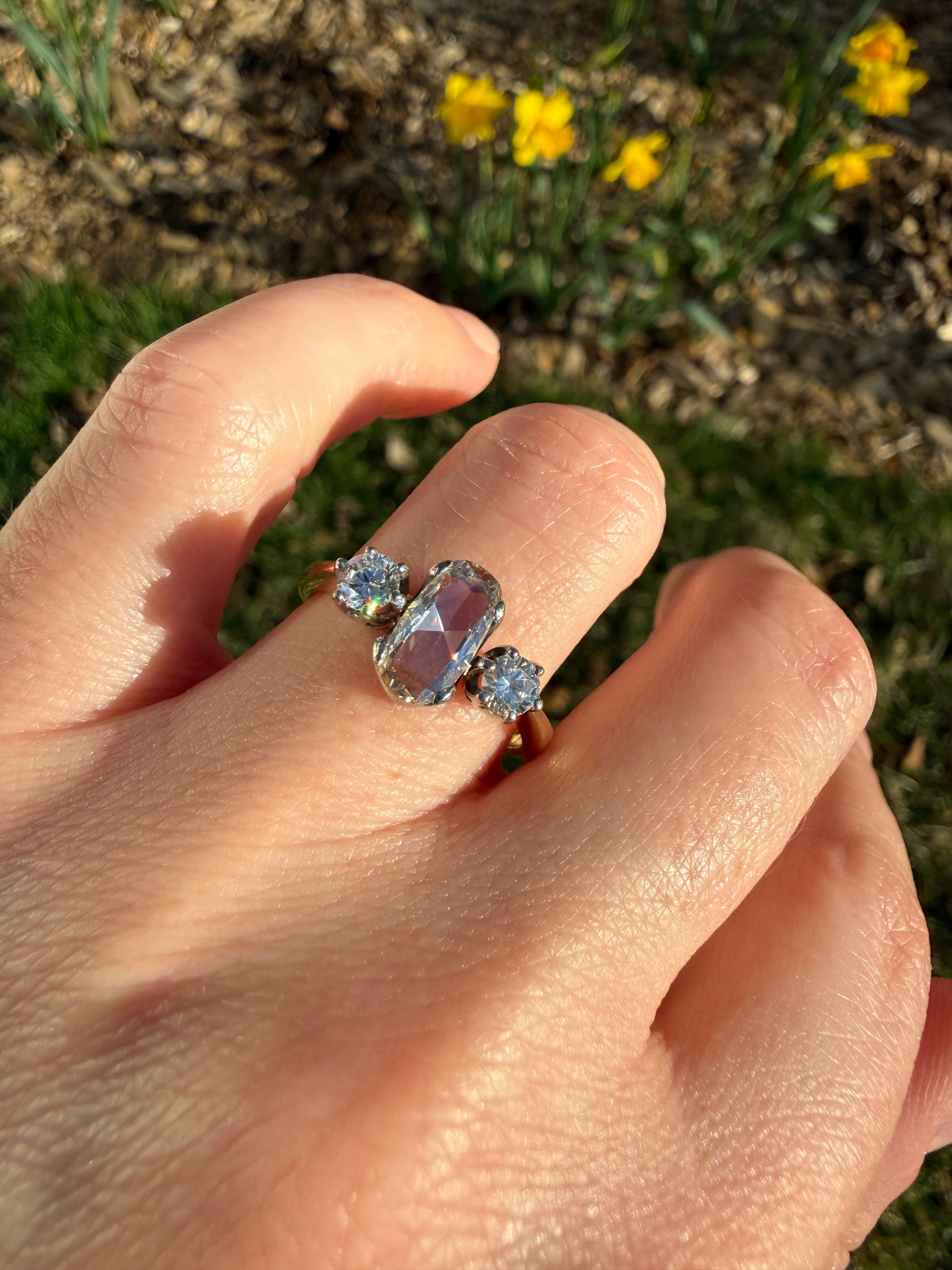 A unique and special one for sure, crafted in 18k yellow gold with contrasting prongs in a white precious metal (I don't scratch test prongs for fear of damage).