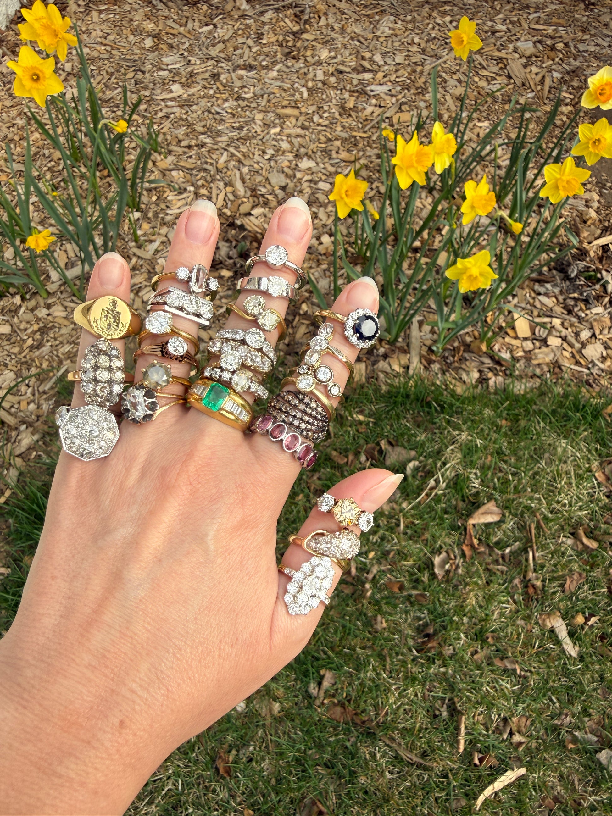 So I traveled to the land of amazing ornate five stones on my last sourcing trip (to the UK ; ) and was on the hunt for an impactful chunky antique old mine cut five stone. I saw tons of them but none fit the bill, either in size, price or the quality of the stones or durability of the setting. Most of the time it was the stones that held me back. I don't mind quirks and inclusions typical for diamonds from the period but I really wanted to find a good one for a more rare and exceptional offering. On the last day of my trip I finally found this one and am excited to offer it as it was by far the best of the many many I saw and I just love it.