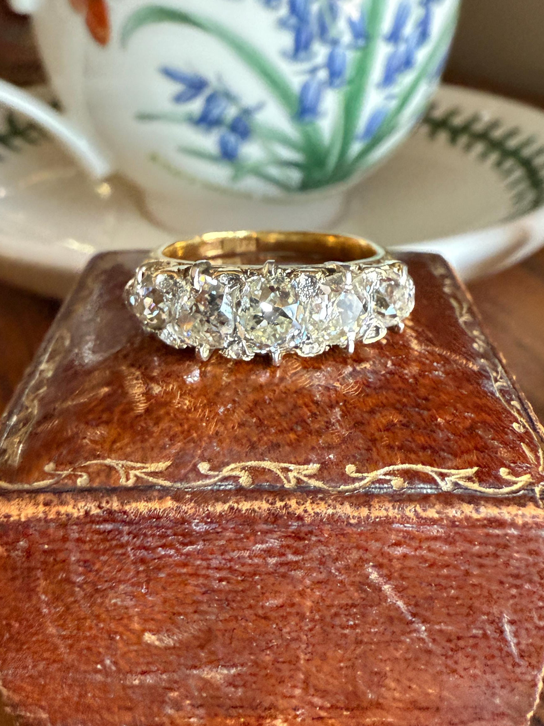 This is one of the larger five stones I've been able to source and I just love it. An elegant Victorian beauty with the beautifully detailed setting holding five chunky old mine cut diamonds.