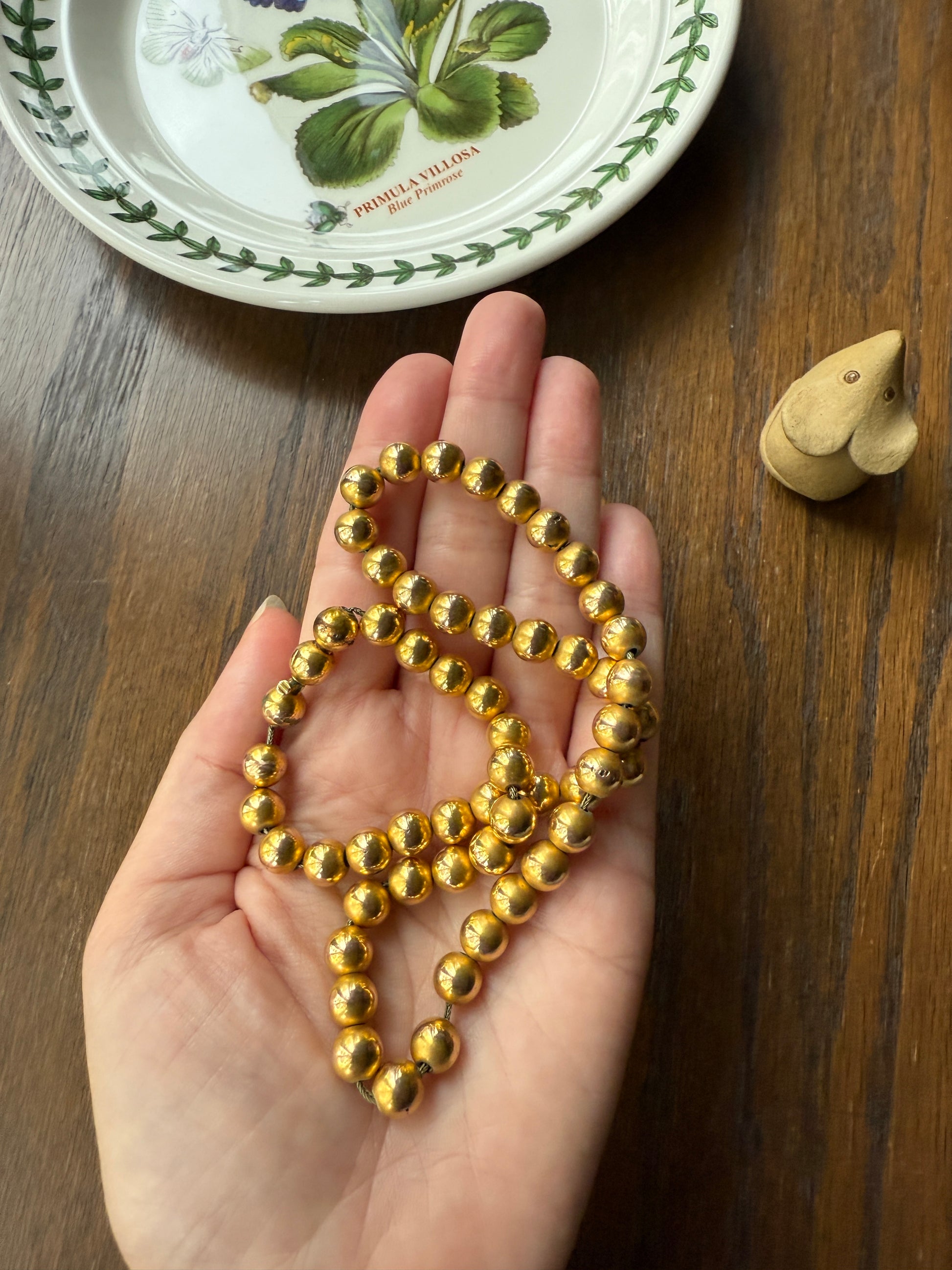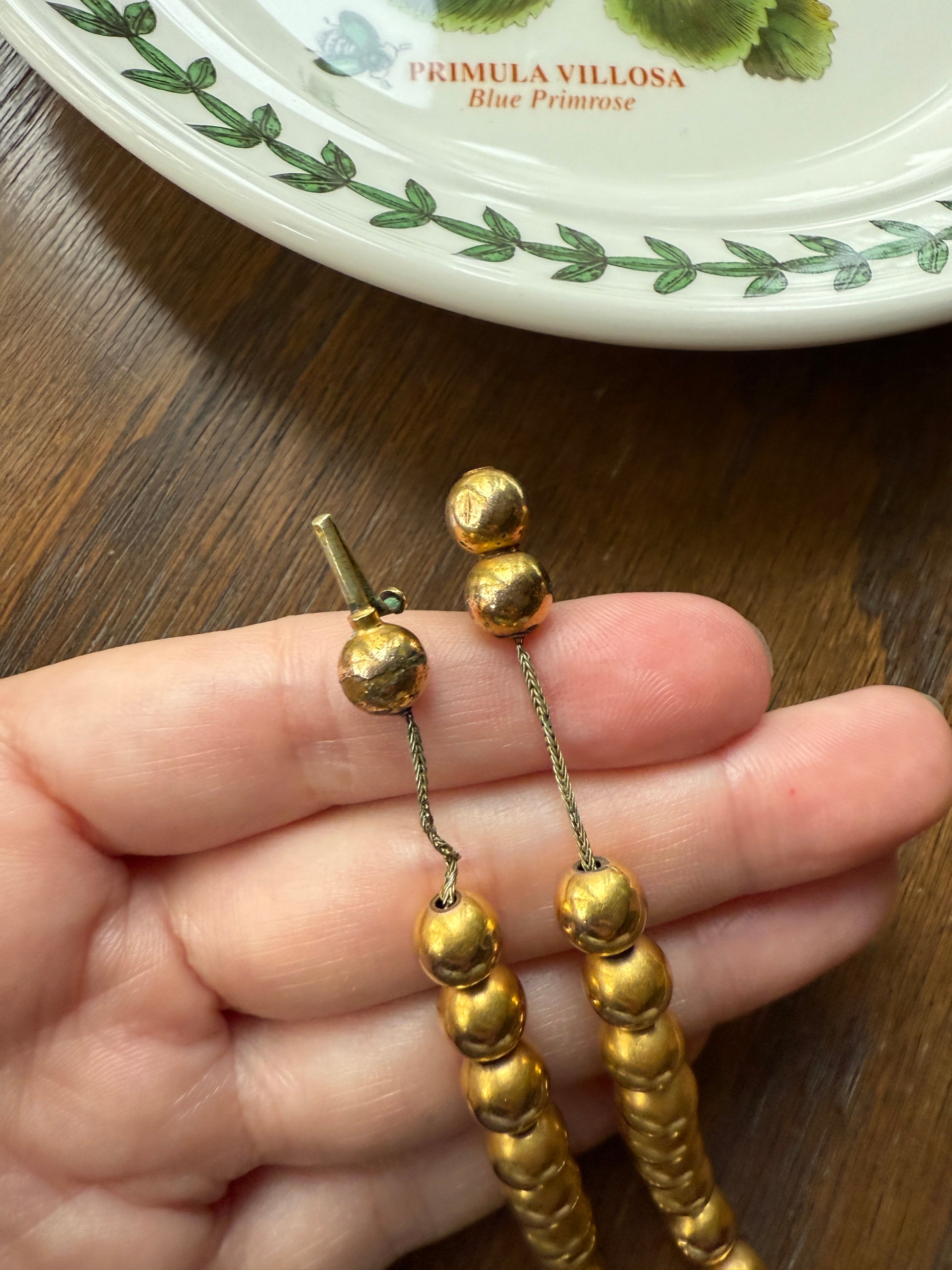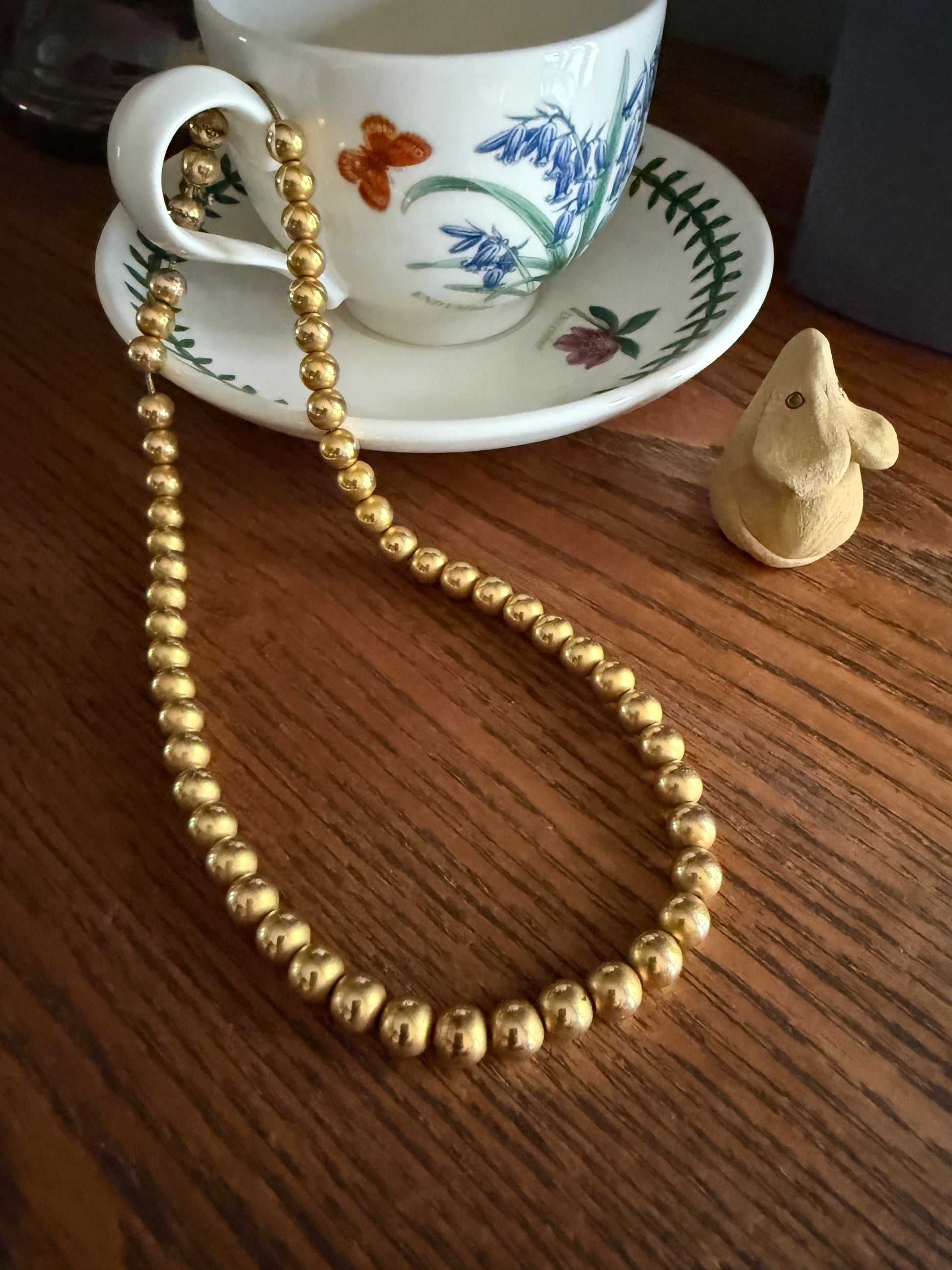 Antique gold fill bead necklace. Wears like a pearl necklace but with each circle being a gold filled bead. It has warm antique patina with some underlying brass giving it a softer antique hue. Some evident signs of wear though.