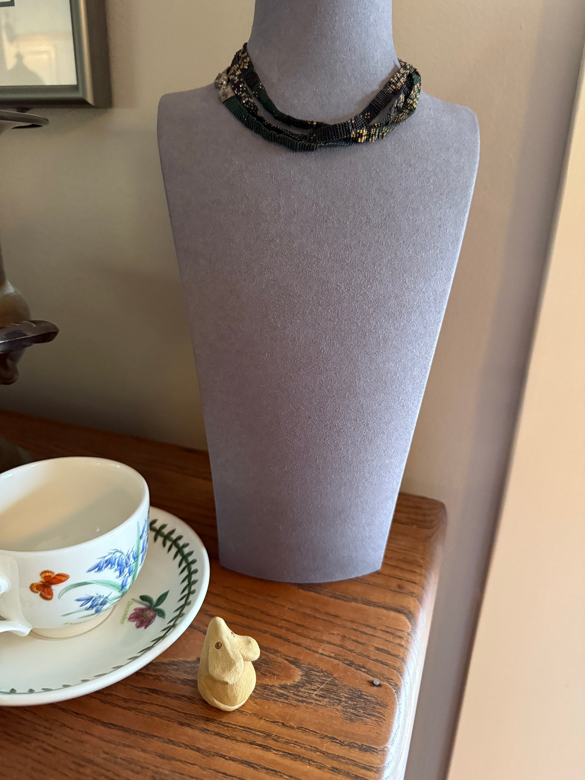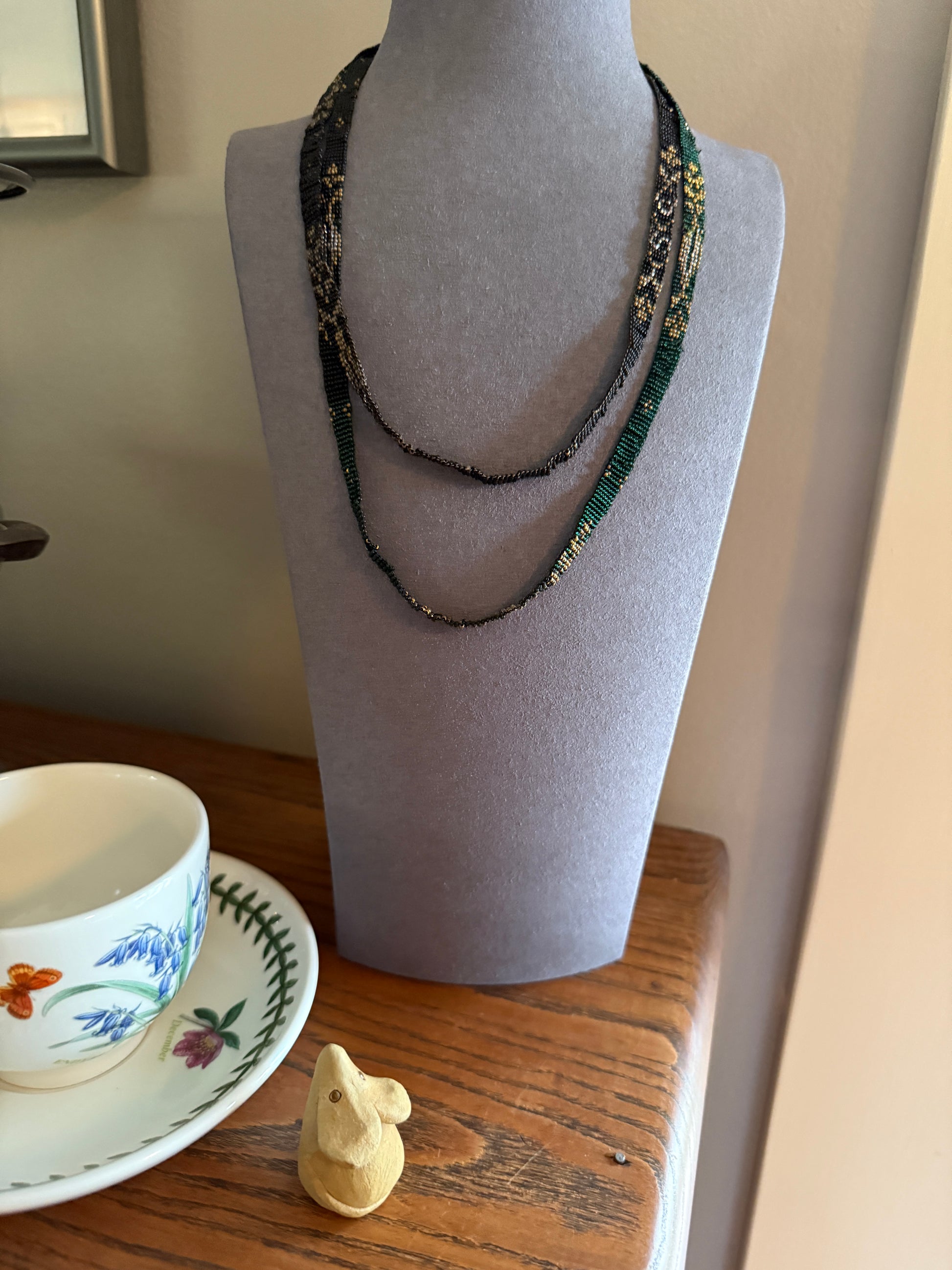 I recently got this one in Sweden and while it isn't precious metal or considered fine jewelry, to me it is a work of art. Hand beaded chain with gorgeous emerald green, black and metallic gold beads. Hundreds and hundreds of the tiny beads are strung together to make a sort of ribbon or strap chain. It reminds me of something a flapper would wear or similar to the ones seen worn on Downton Abbey. Just such intricate work and such an old piece, it's awesome that it has survived.