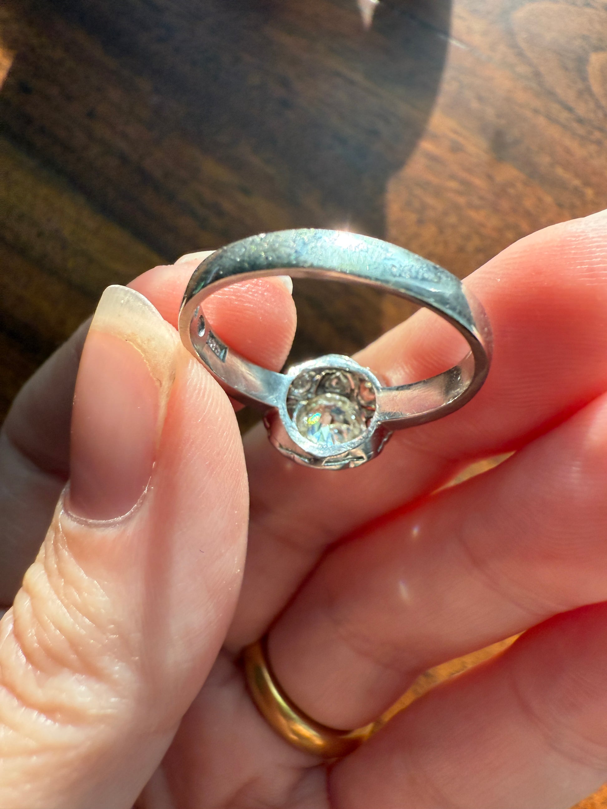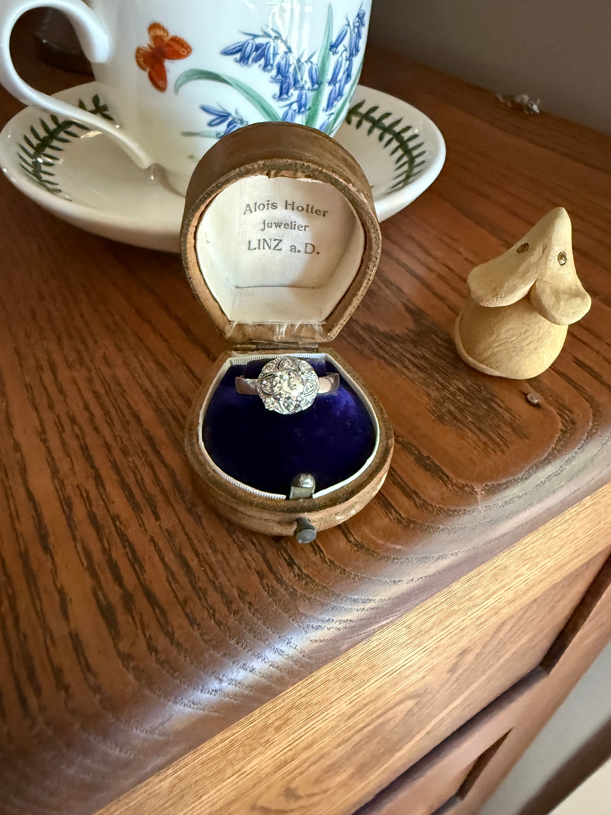 A beautiful domed diamond cluster ring with larger eye clean old European cut diamond in the center and milgrain details set with additional old cut diamonds around the setting. Such a pretty sparkler. I got this in Stockholm, it was one of my favorites to wear around Europe with the nice sized ring face set with all over sparkle. I love it with a paired with a buttery gold band. A lovely bit of texture to the ring face with little gold bead rivet details and the milgrain outlines with openwork scalloped designs.