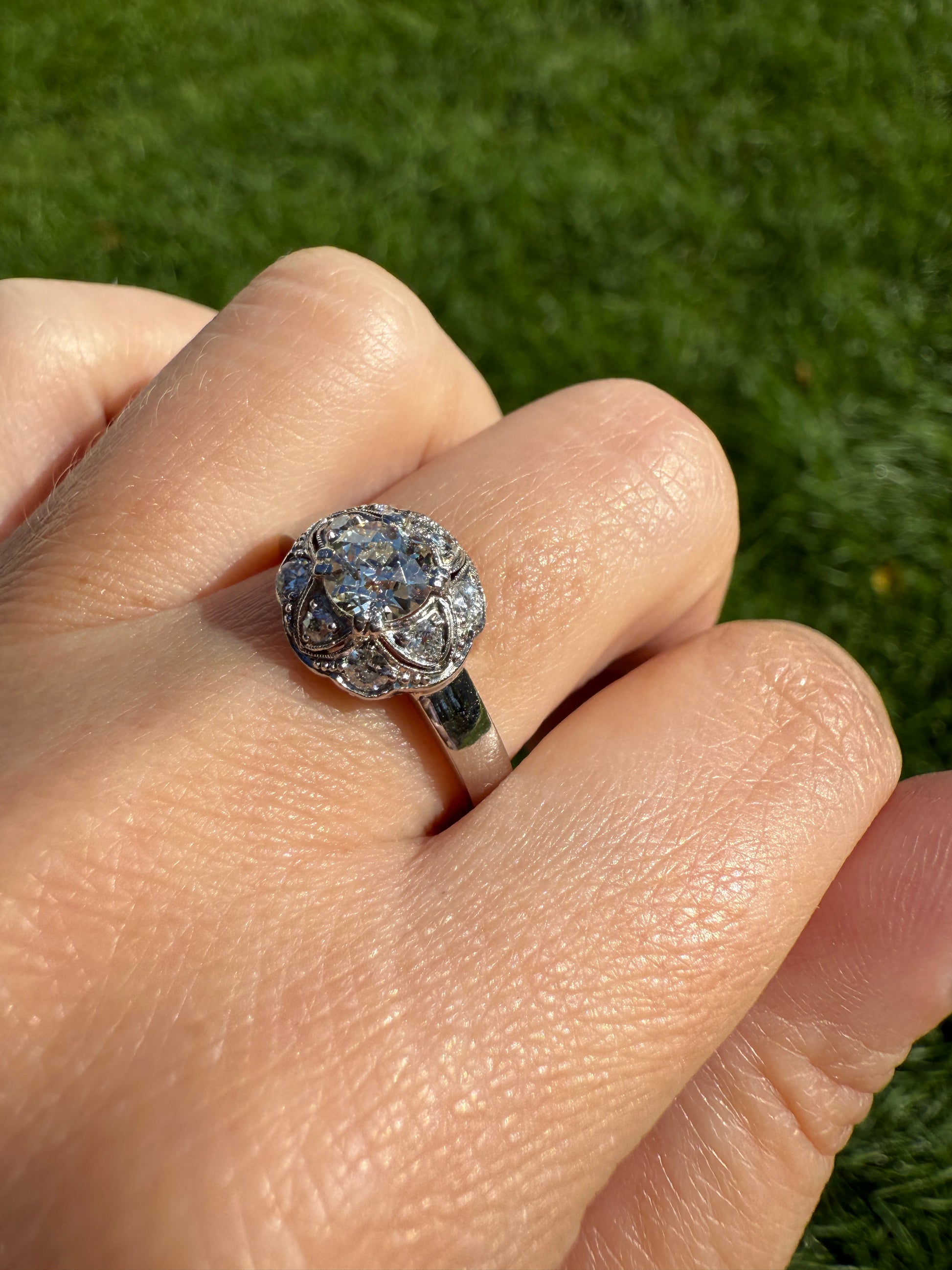 Vintage 1 Carat Tdw Antique Old European Cut Diamonds 18k White Gold Ring Scandinavian Domed Ornate Cluster Ring Art Deco Edwardian Style