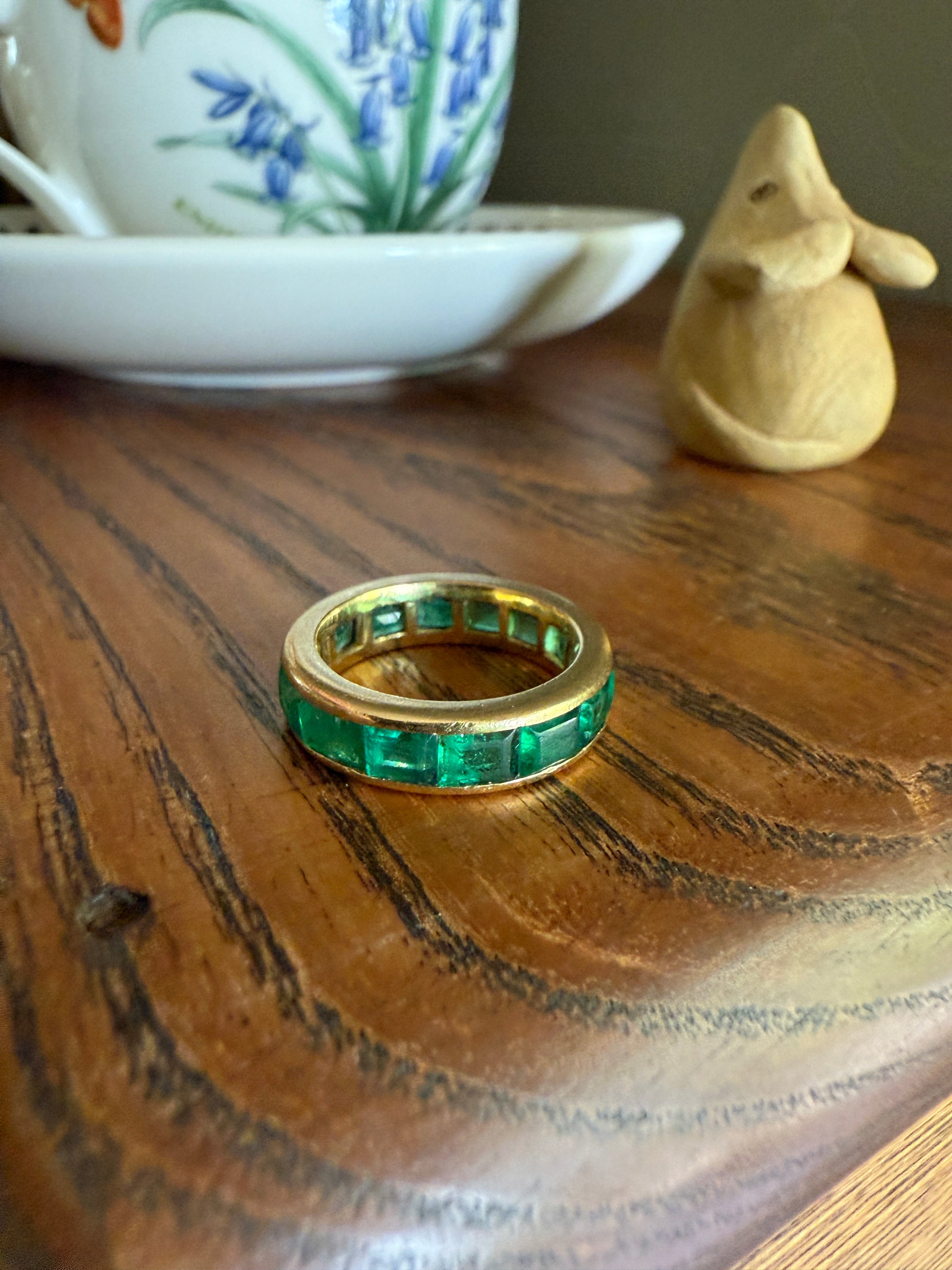 Chunky vintage green emerald full eternity skinny band. Excellent green color flanked by the glowing 18k gold that the stones are channel set into. It's a sturdy piece. Would be fun to nest above and below another diamond or gold band for a pop of color in a fabulous stack.