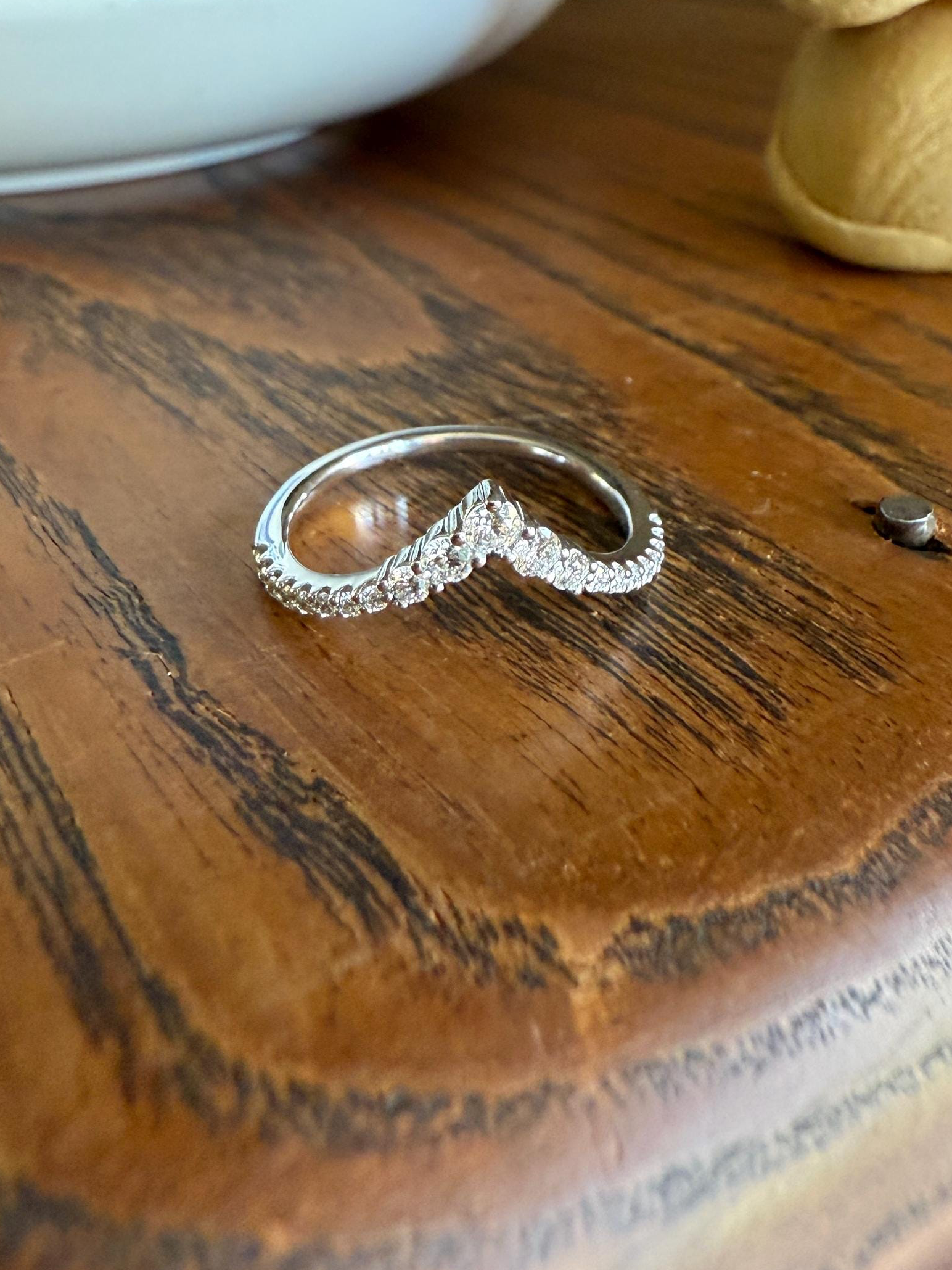 This chevron V ring is a vintage ring with older brilliant cut diamonds - not as old as transitional, European or Mine, but with frosted girdles indicating they are not modern stones either. They graduate slightly in size for all over glitter. This one is a true half hoop where the stones extend all the way to the adjacent fingers.