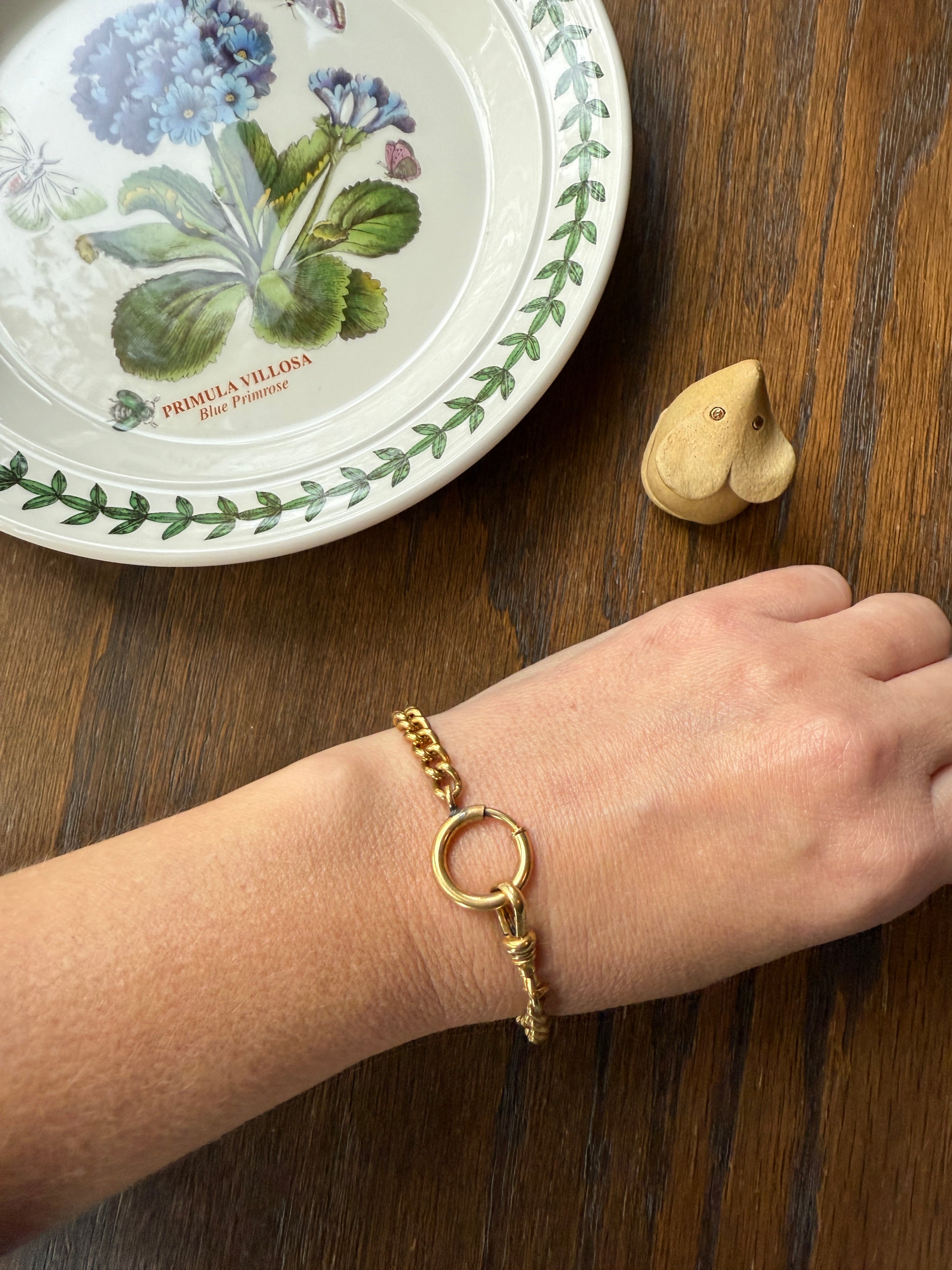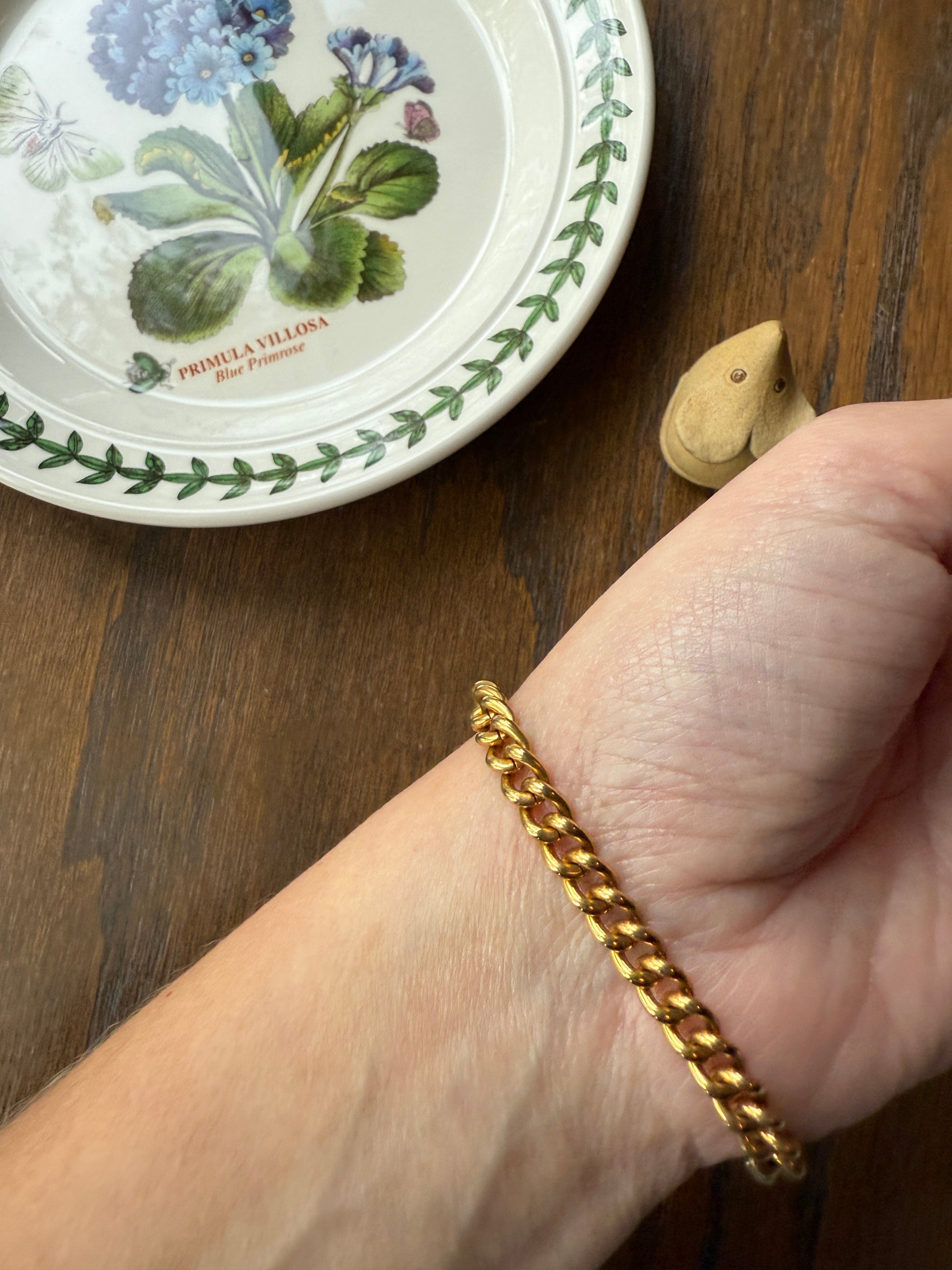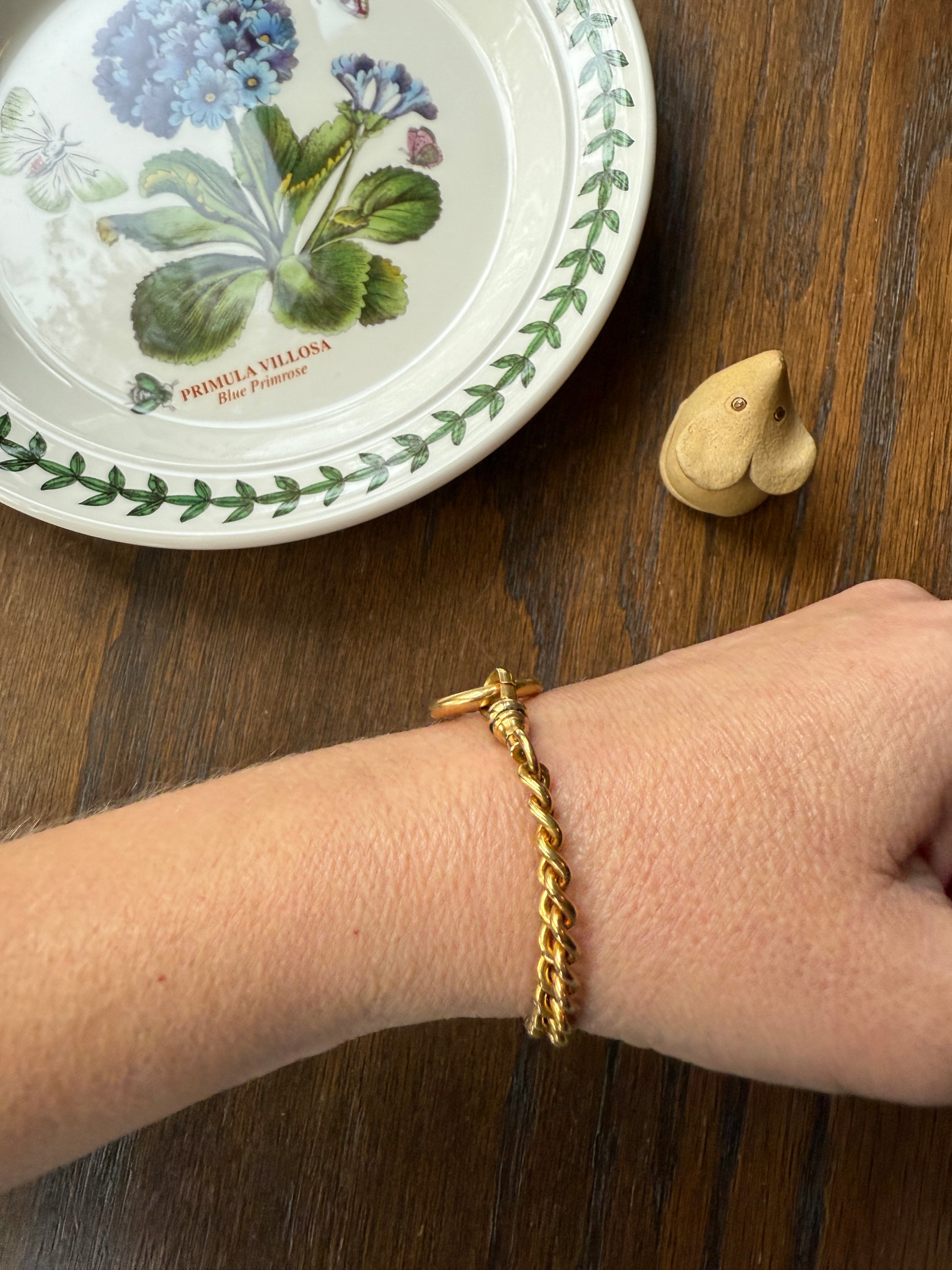 Antique gold filled watch chain bracelet with curb chain link. With sought after extra large spring bolt / ring & dog clip. The connector clasps on each end also make it a perfect extender or connector. I like wearing it as a bracelet and using one of the clasps to hold an additional charm or pendant.